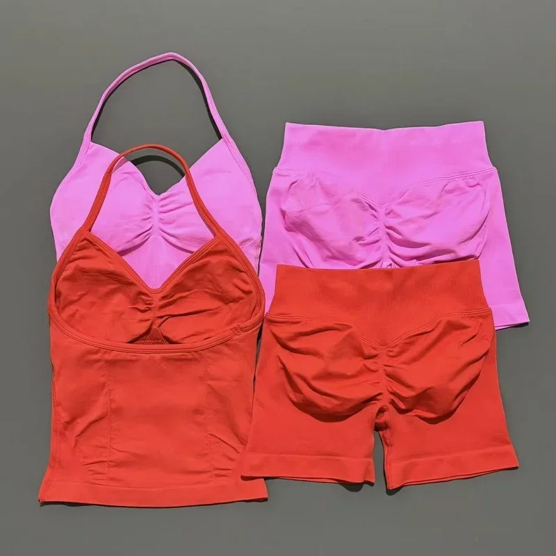 Yoga 2 peças conjunto de ginásio feminino sem costas halter topos cintura alta sem costura shorts ginásio terno de fitness sutiãs esportivos conjuntos de treino