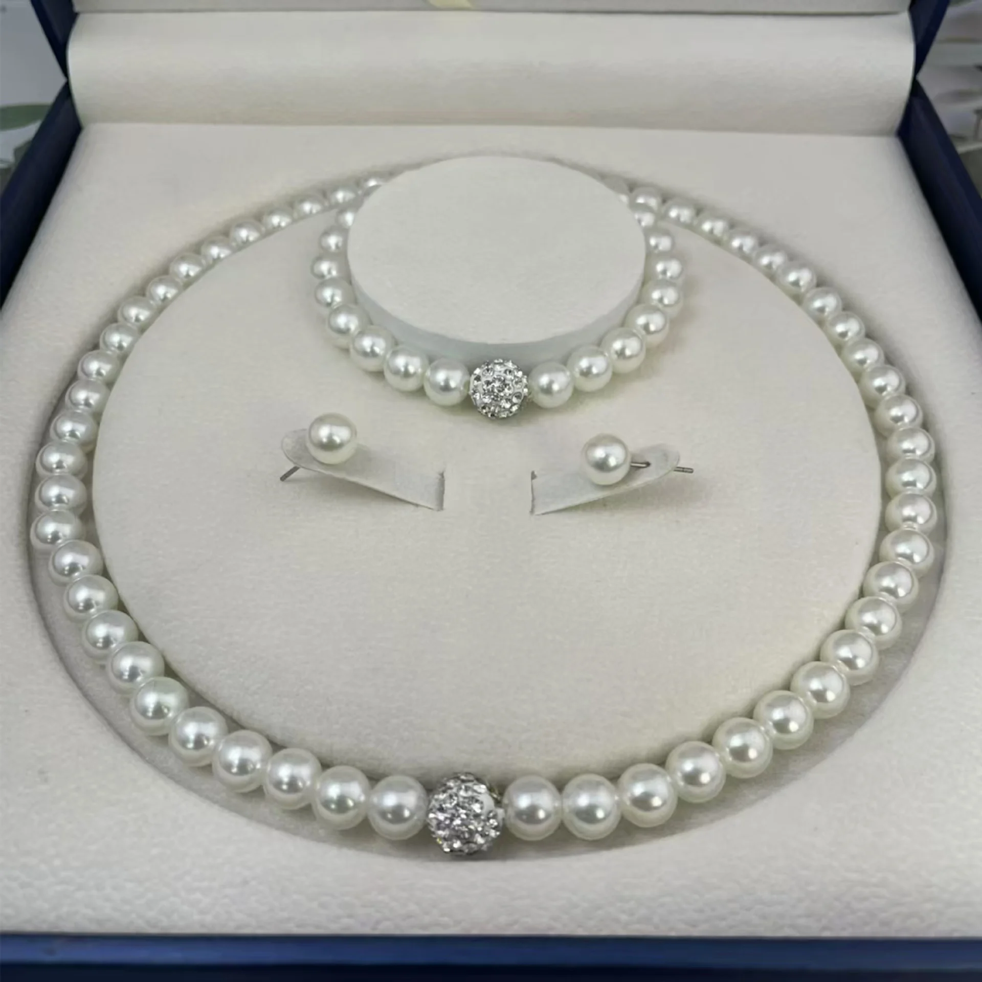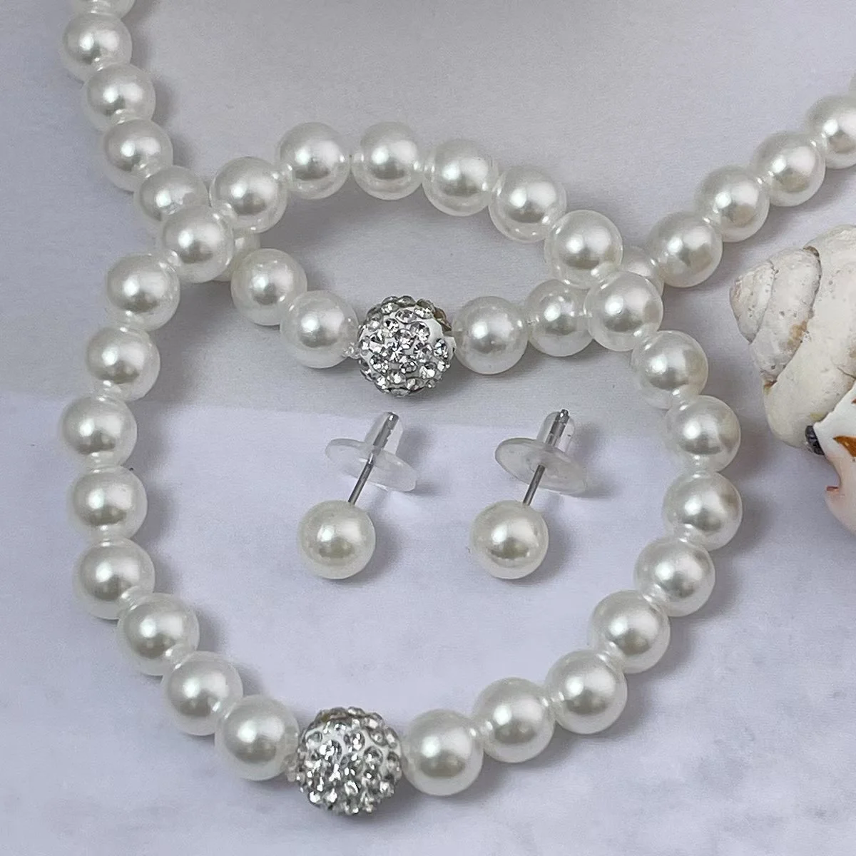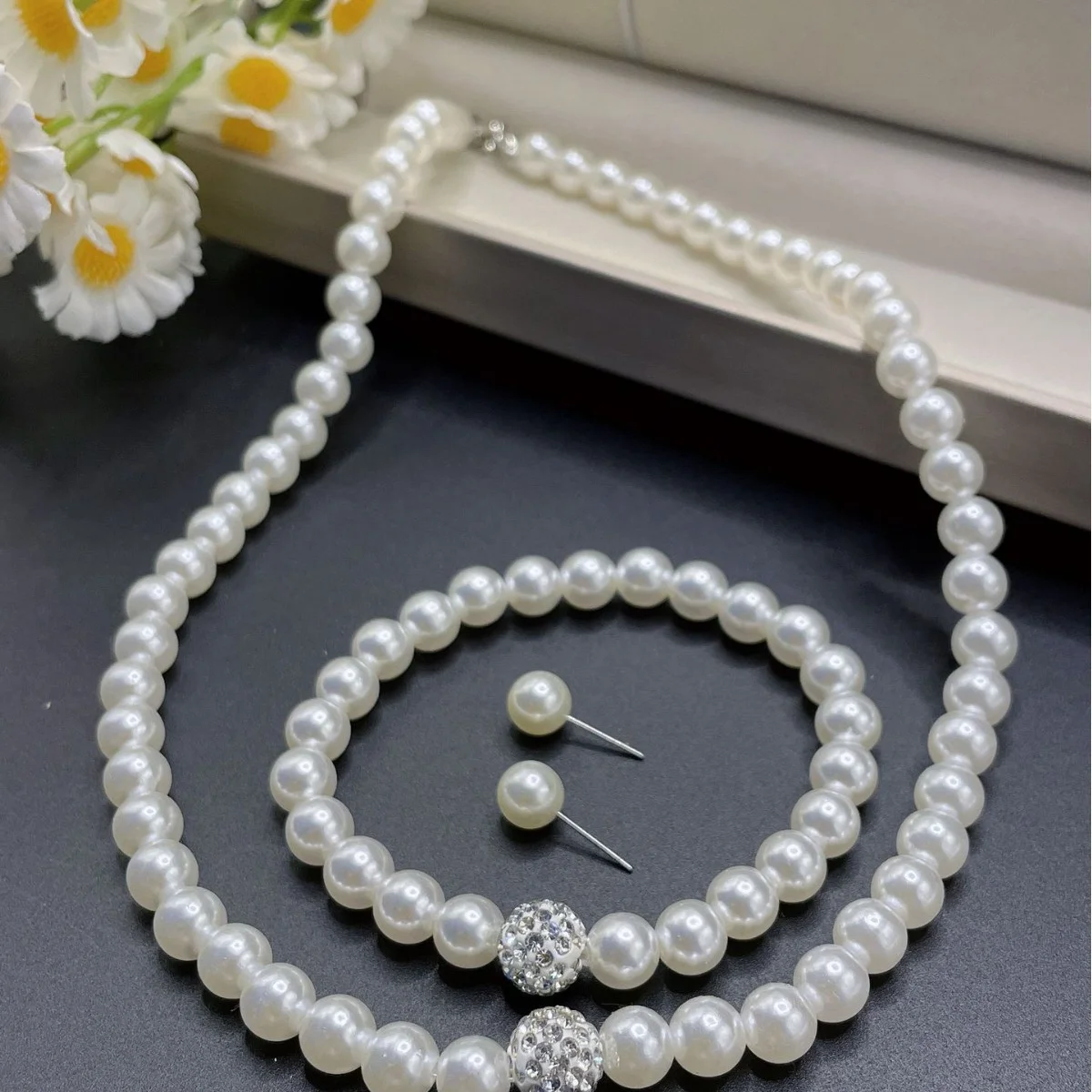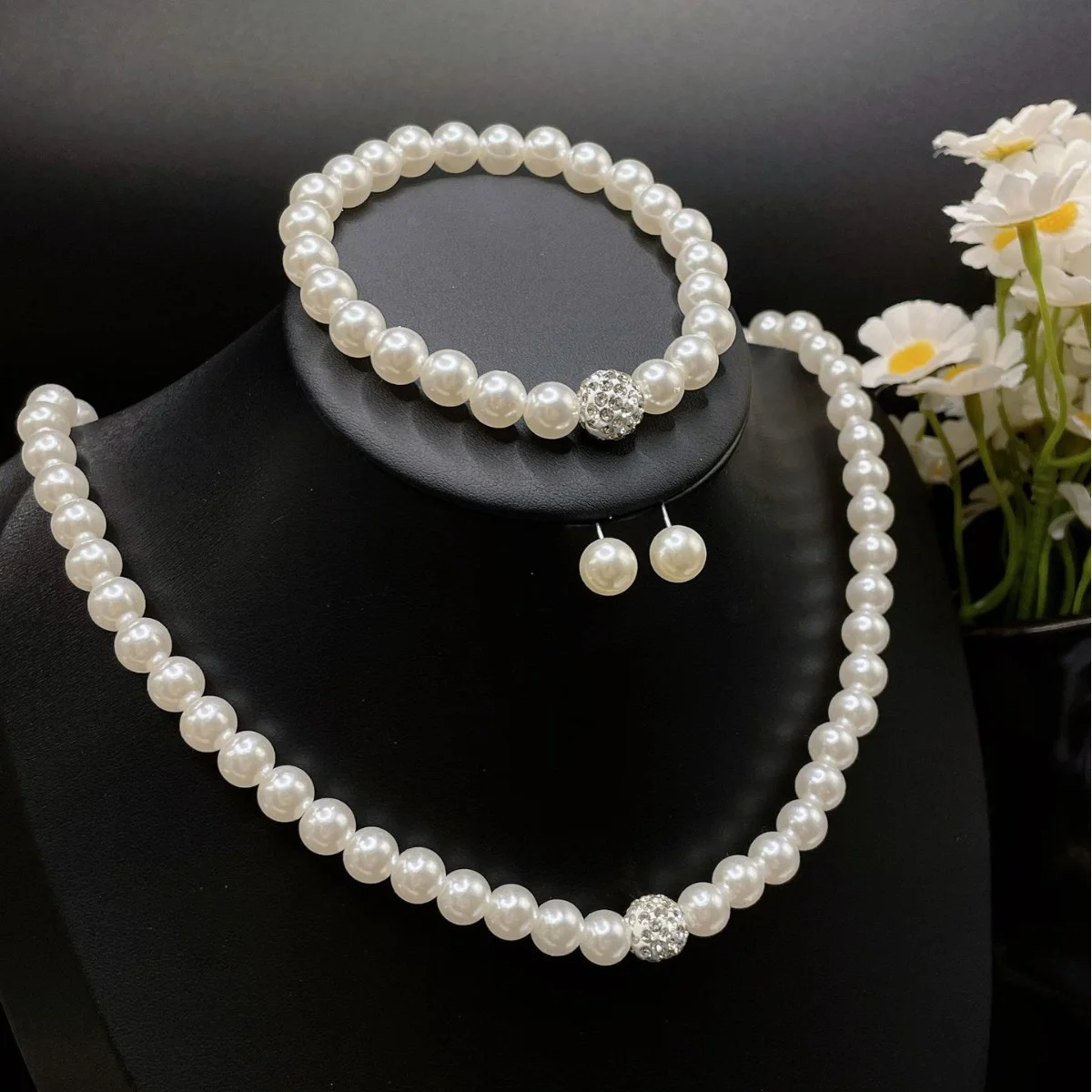 3 pçs conjunto imitação de pérola bola de fogo colar pulseira brinco conjunto de jóias cor prata pedra cristal elegante jóias de noiva