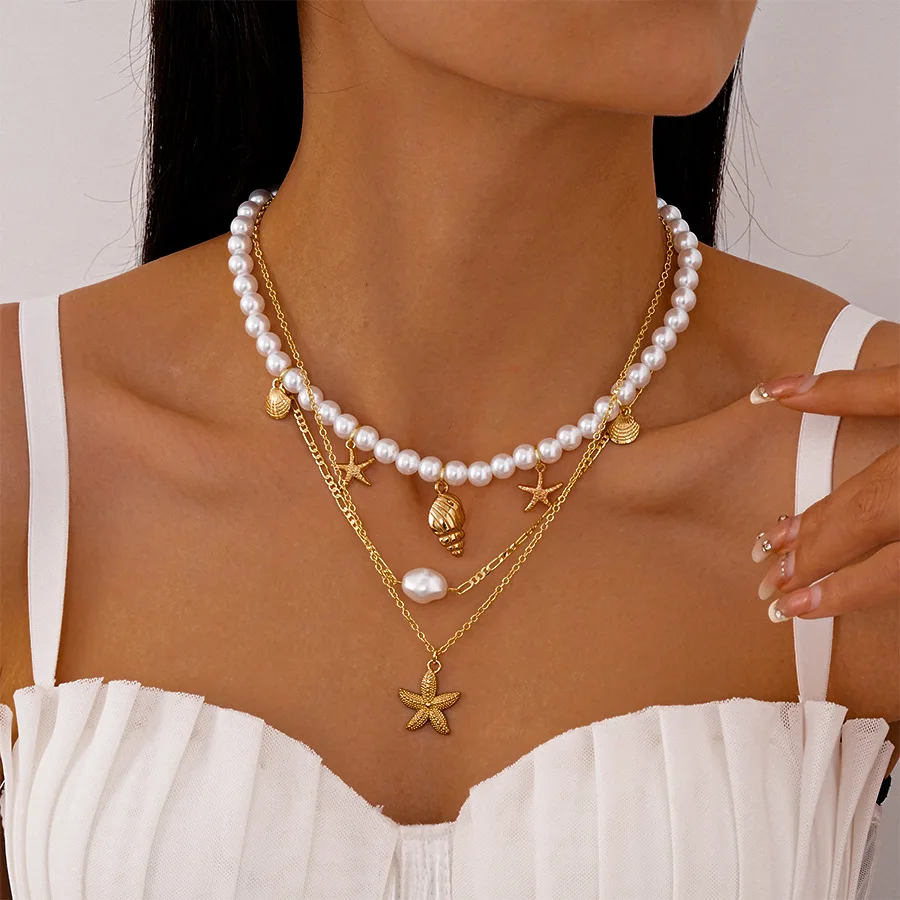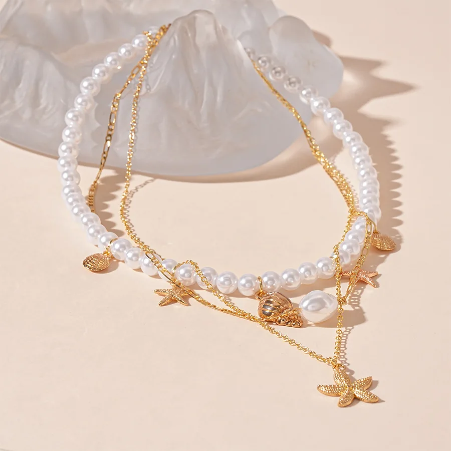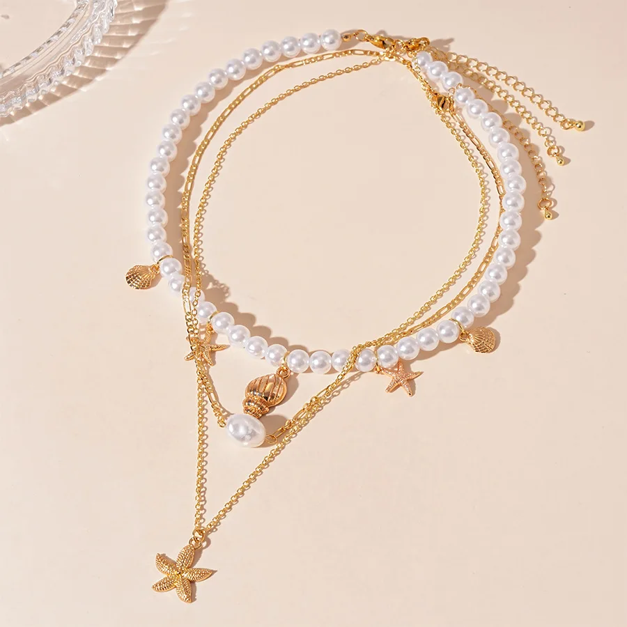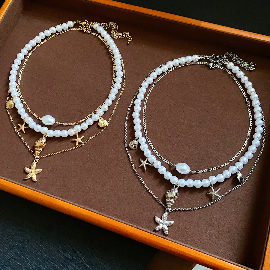 3 pçs oceano estrela do mar concha pingente colar 3 camadas imitação pérola corrente colar para mulheres férias de verão jóias