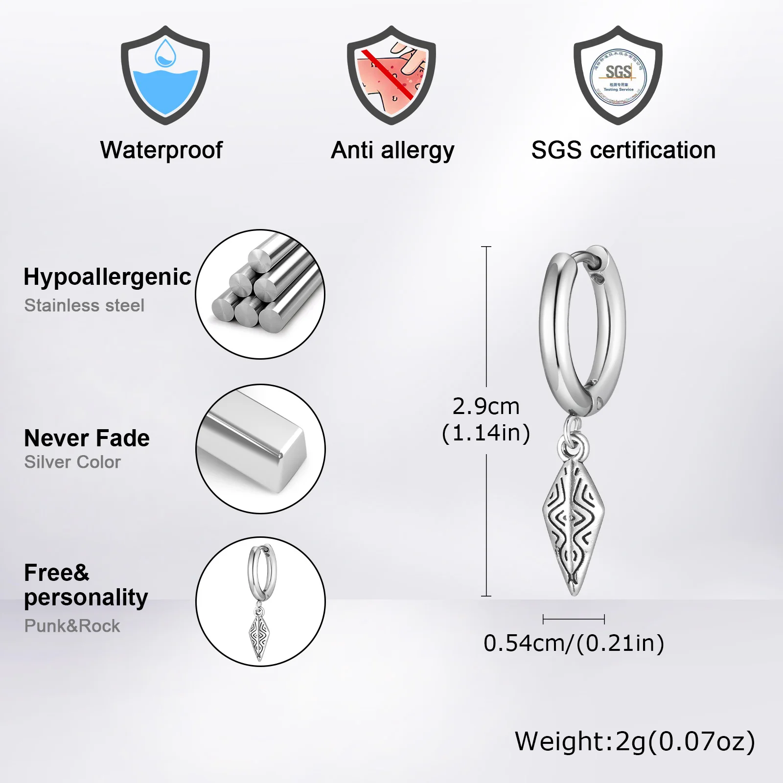 Brincos de argola de losango masculinos, brincos de aço inoxidável antialérgicos à prova d'água, presentes de joias masculinas punk