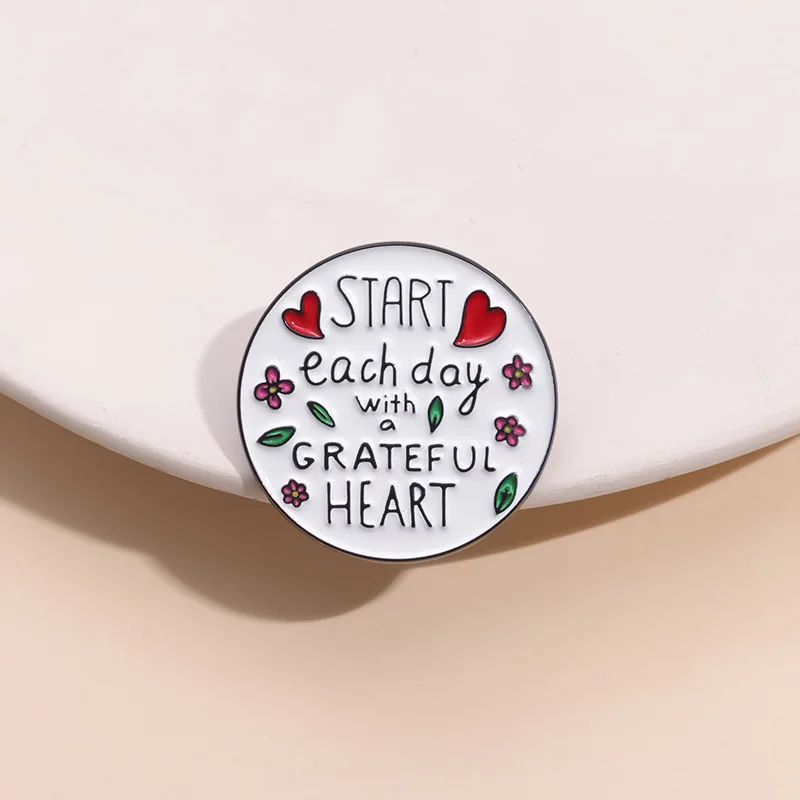Começar cada dia com um coração agradecido alfinetes esmaltados citações personalizadas frase positiva broche de metal lapela crachá joia presente para amigos