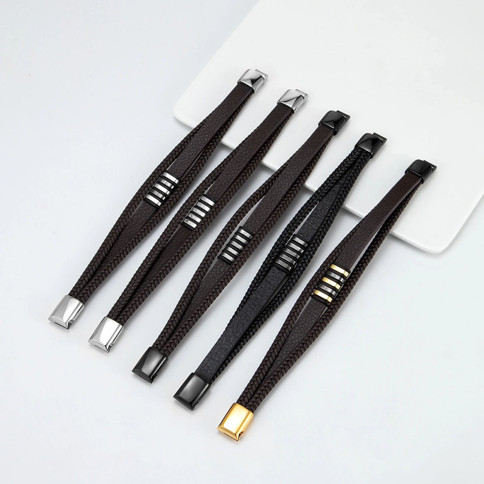 Pulseira de couro de aço inoxidável popular europeia e americana pulseira de couro tecido multicamadas masculina