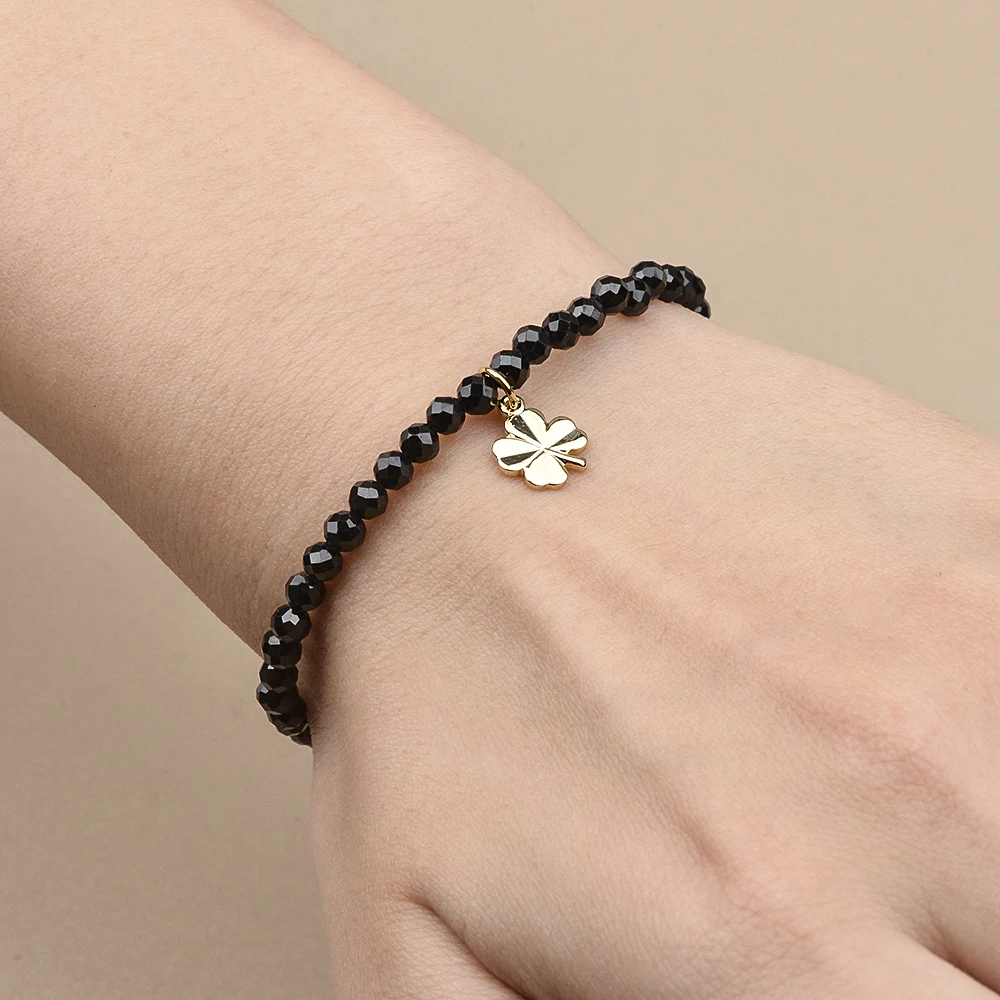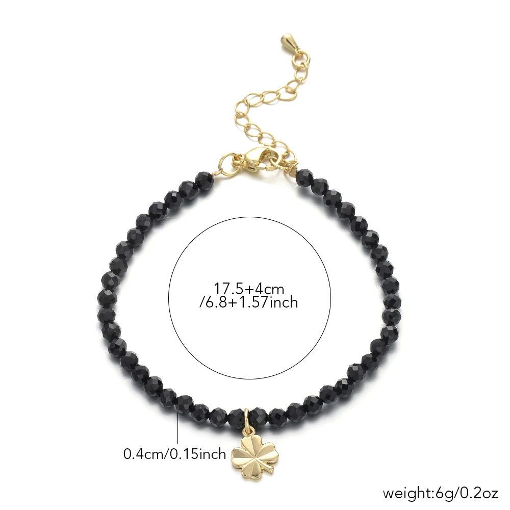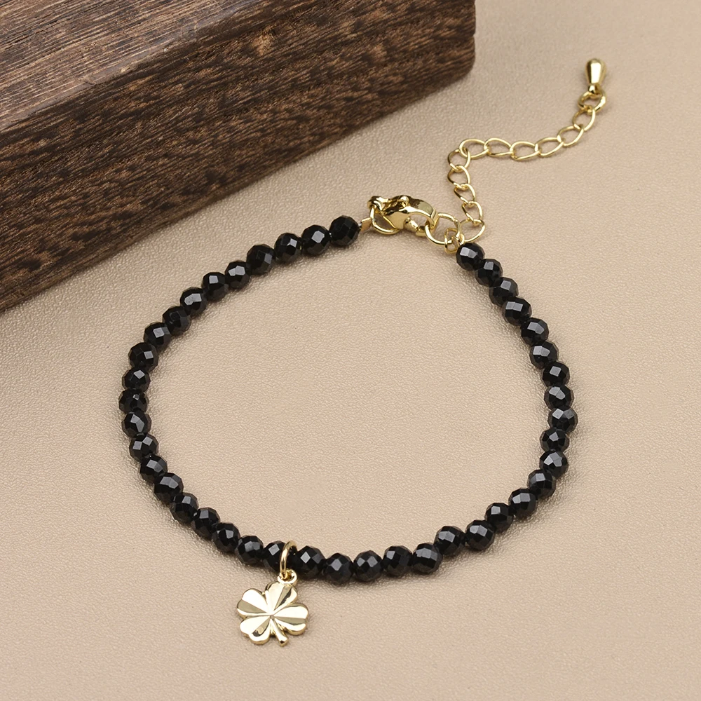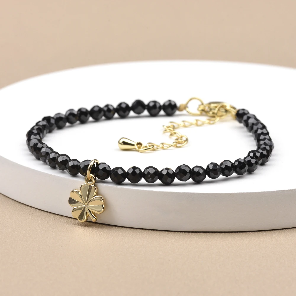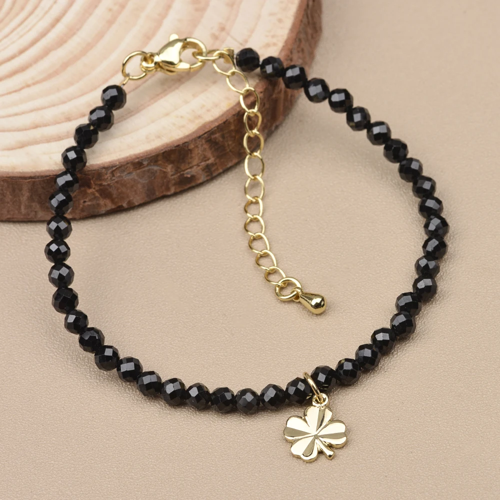 Pulseira de trevo de quatro folhas, espinélio preto, rodadas facetadas, latão, boa sorte, adequado para homens e mulheres, desgaste diário, 4mm