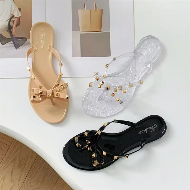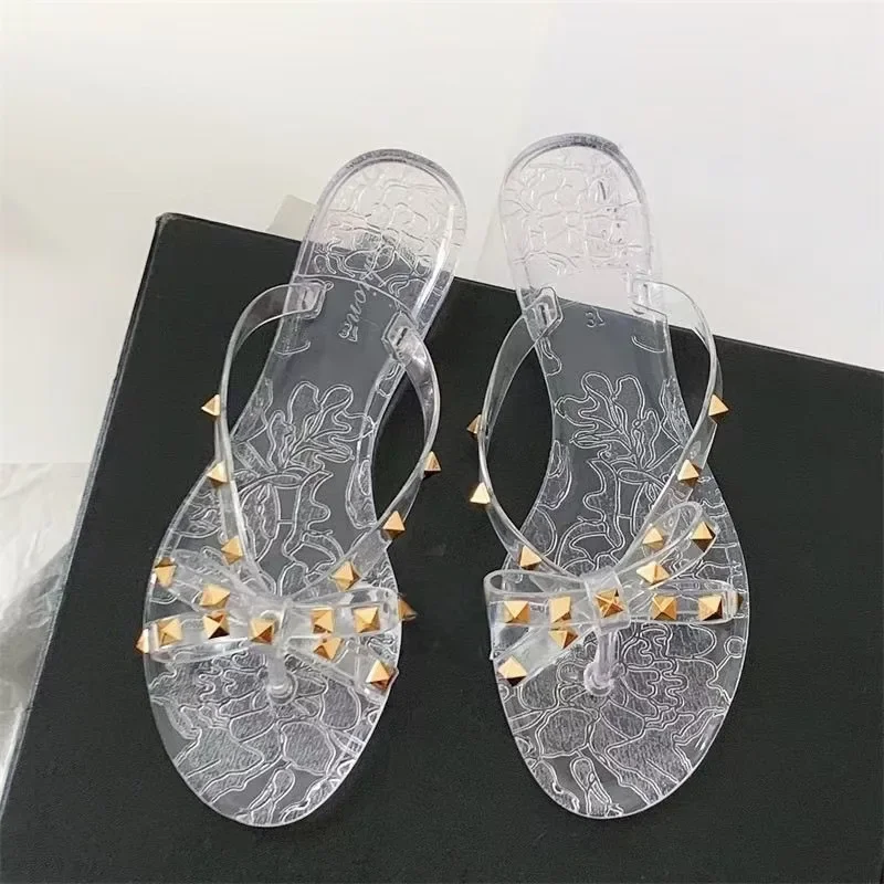 Chinelo Feminino de Verão 2025 com Laço, Sandália Rasteira com Rebites, Sapatos de Praia Transparentes de Cristal para Exterior, Calçado Feminino de Dedo Aberto