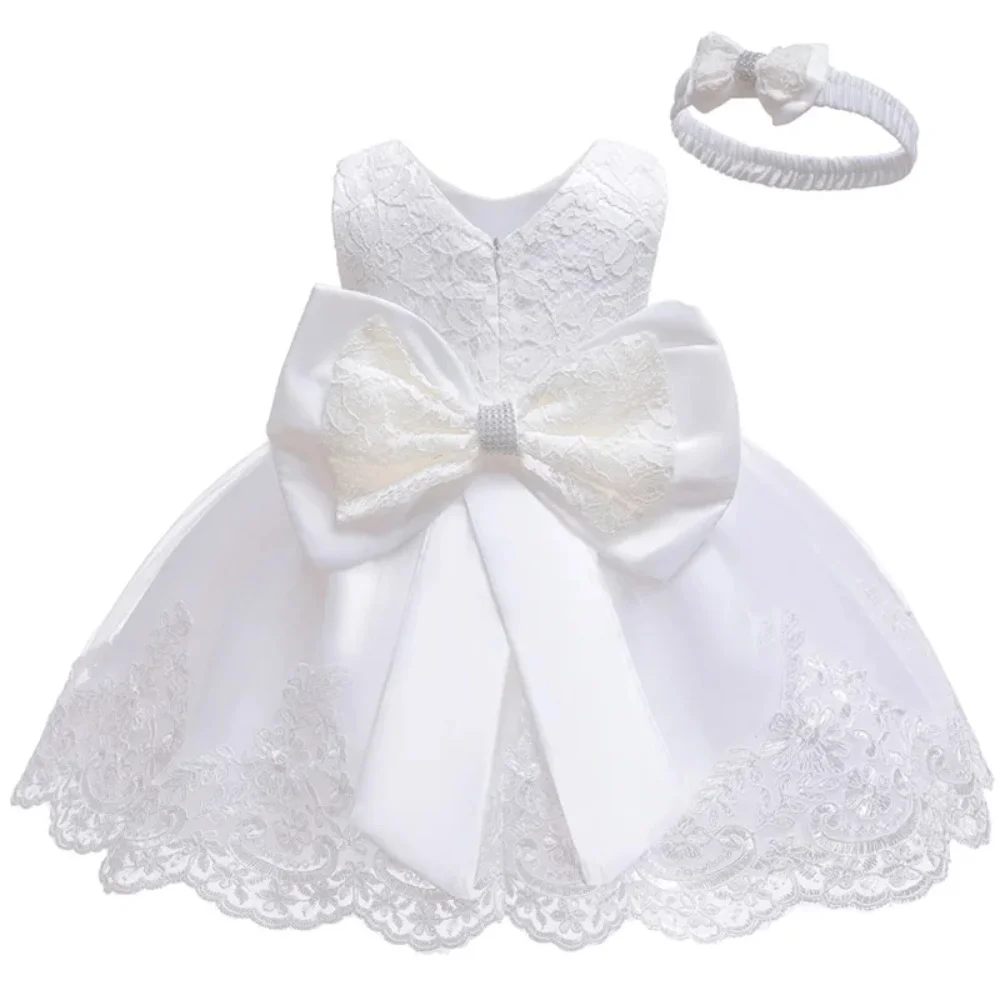 Vestido de Princesa de Renda para Recém-Nascidos de Verão, Vestido Elegante Infantil para Festa de Aniversário, Batizado, Vestido Branco de Casamento com Laço e Tiara