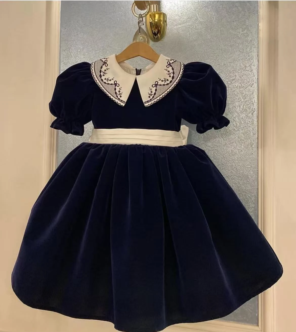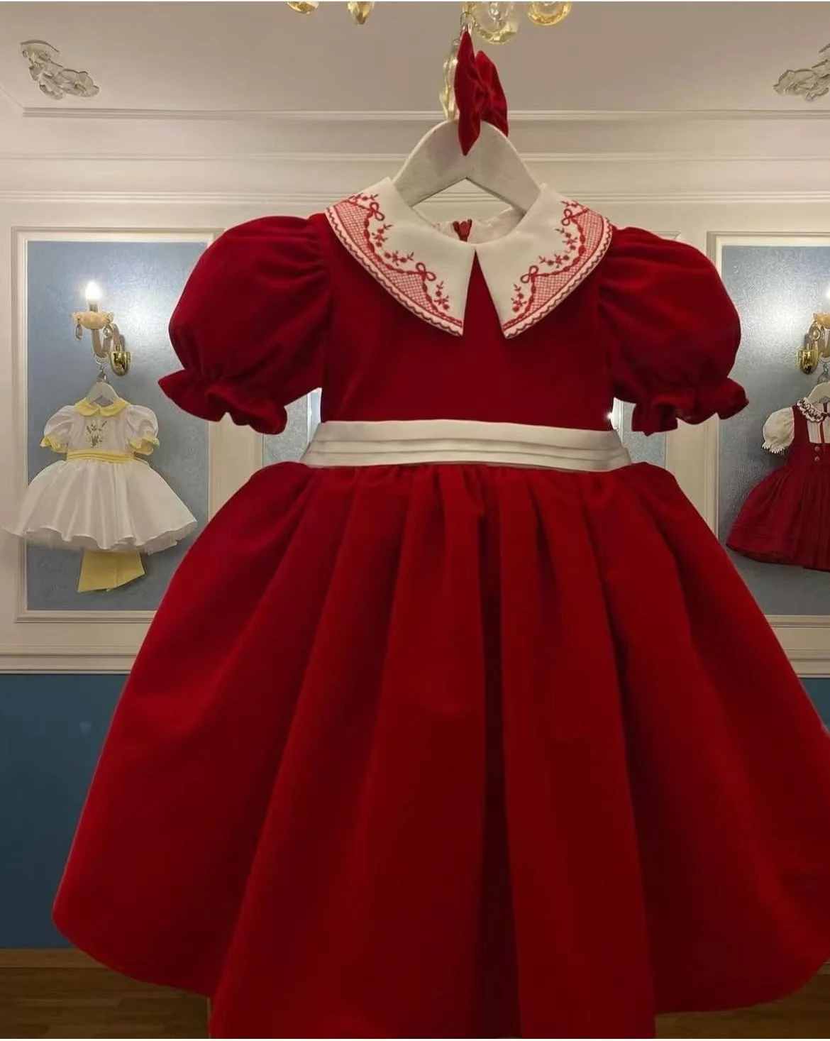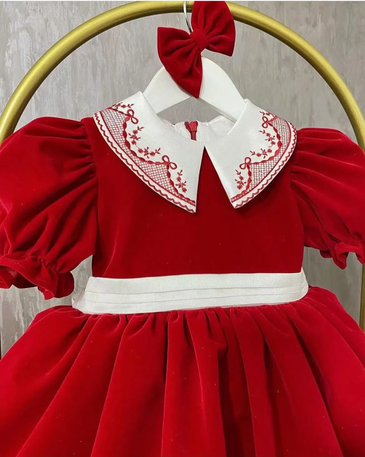 0-12y bebê menina outono vermelho azul gola de veludo bordado vestido de princesa vintage para natal aniversário feriado eid c168