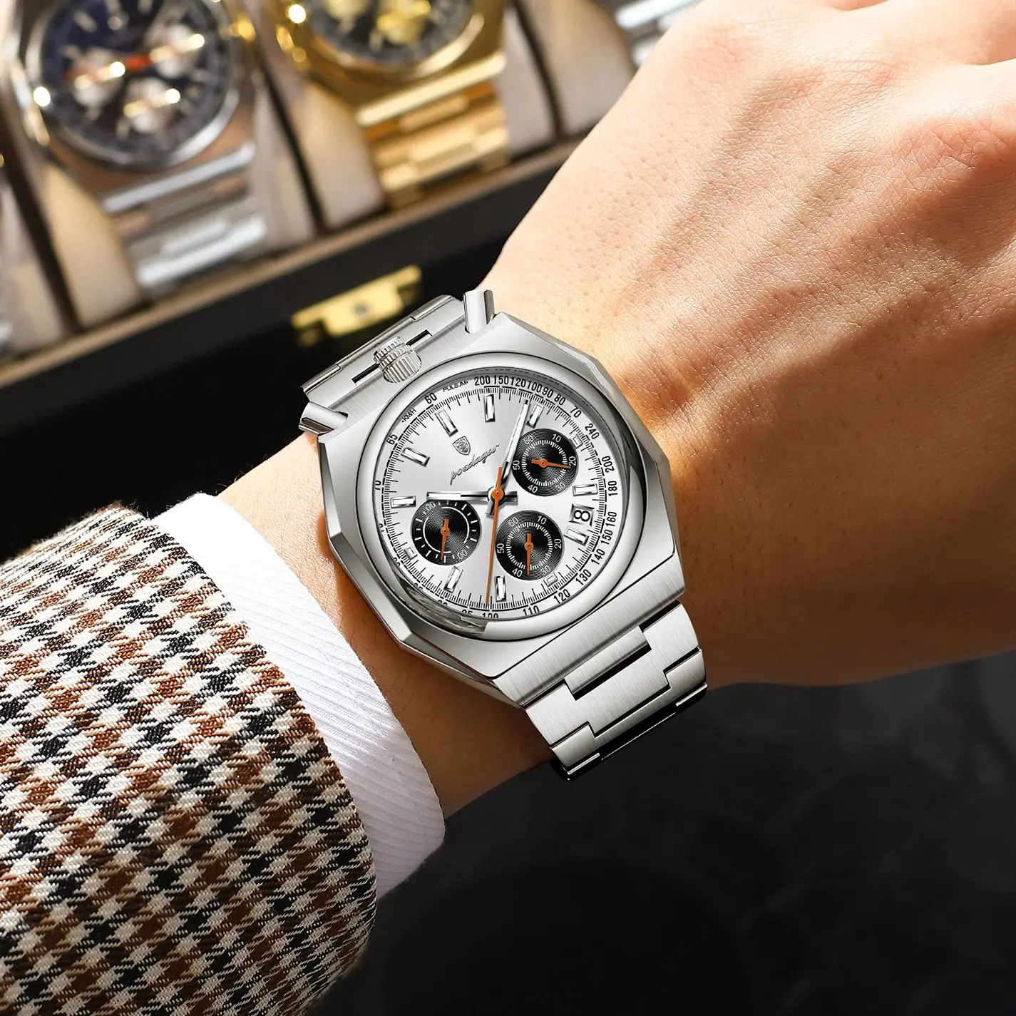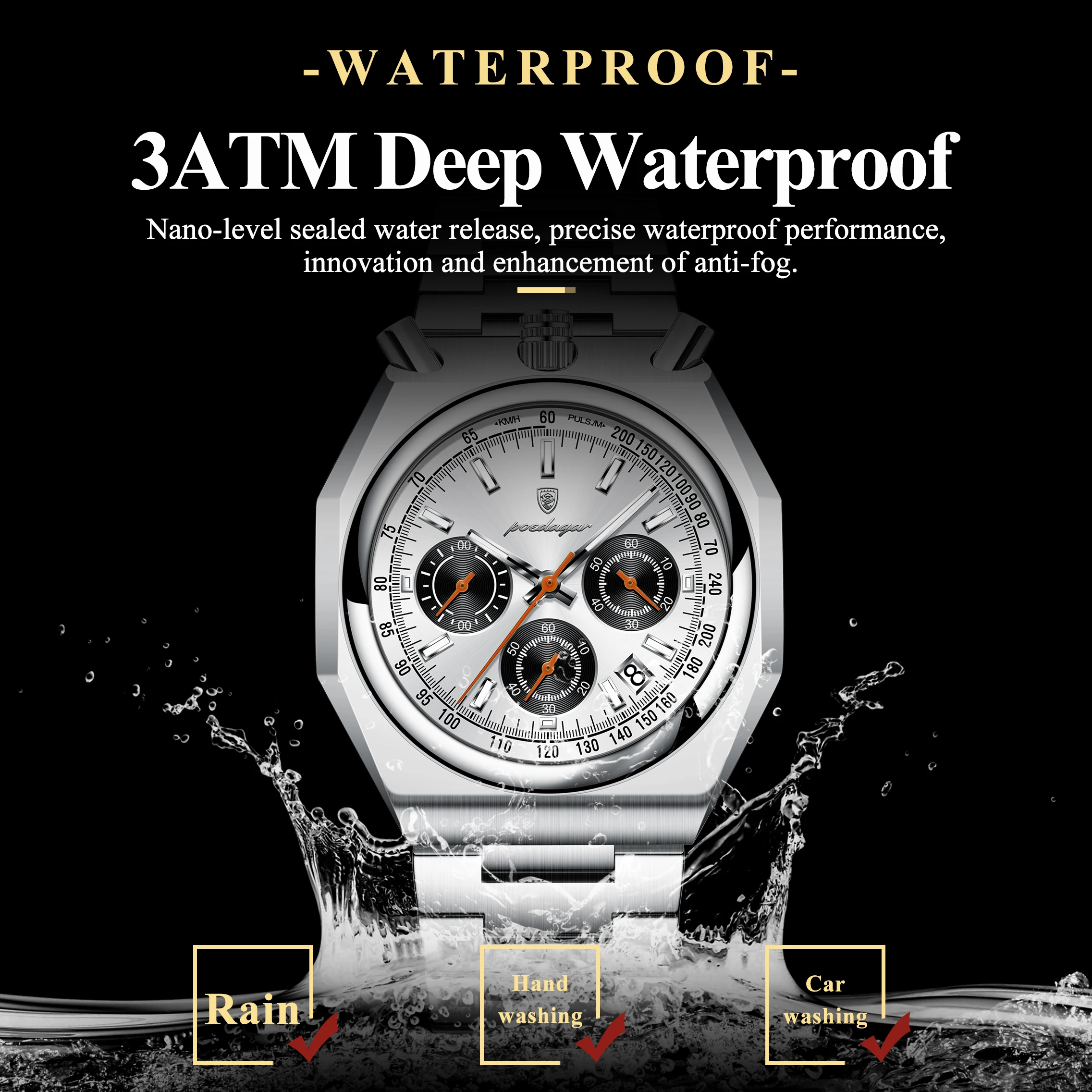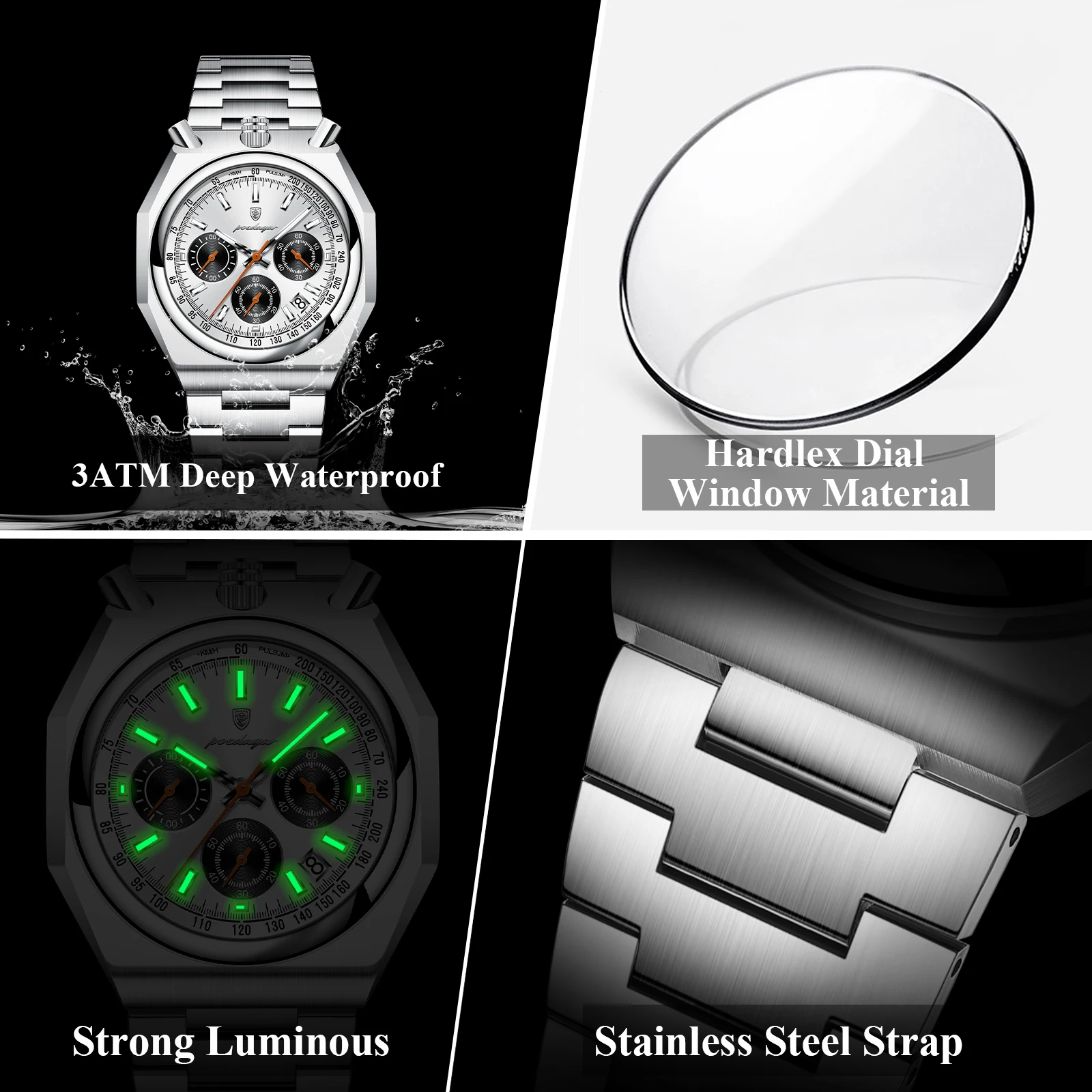 Relógio Masculino Funcional POEDAGAR, Luminoso, à Prova d'Água, em Aço Inoxidável, Clássico, com Data e Cronógrafo, Relógios de Quartzo Masculinos