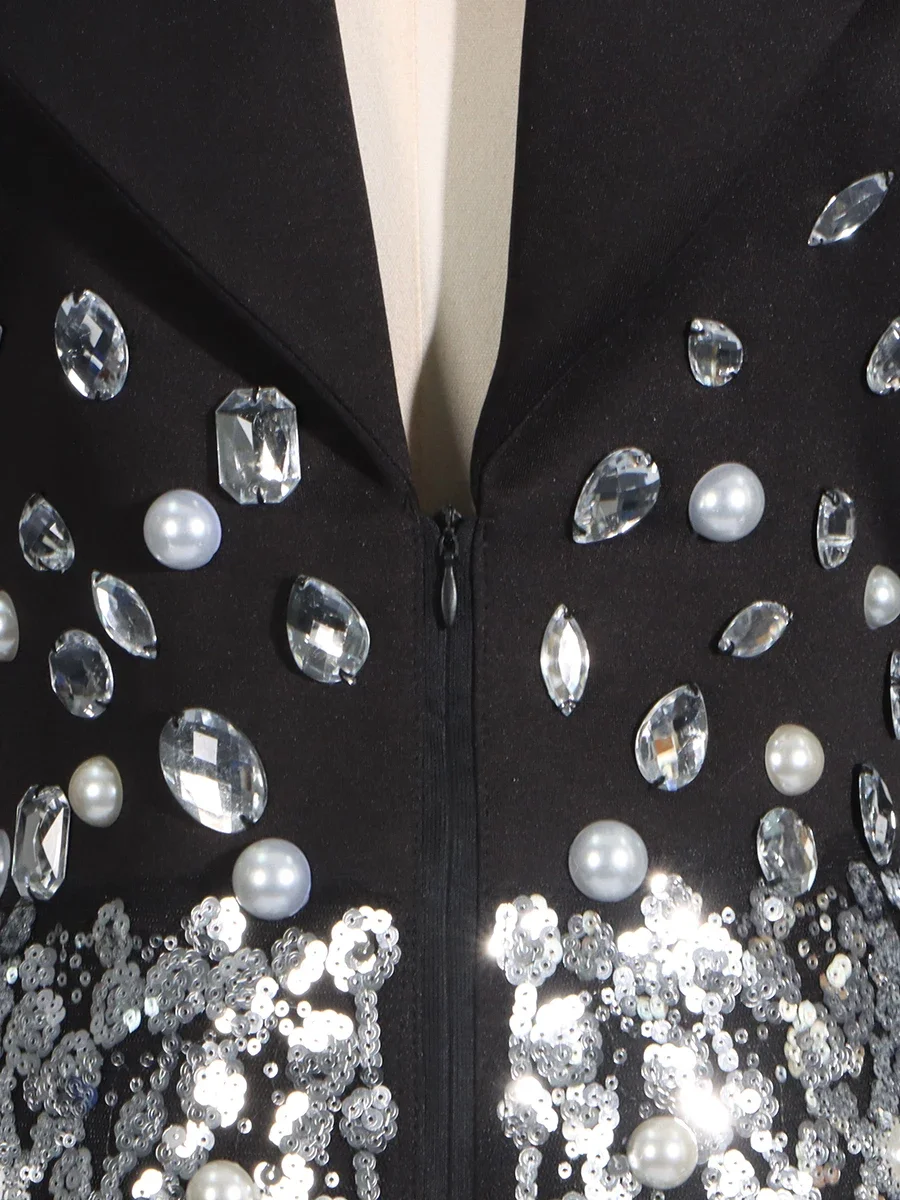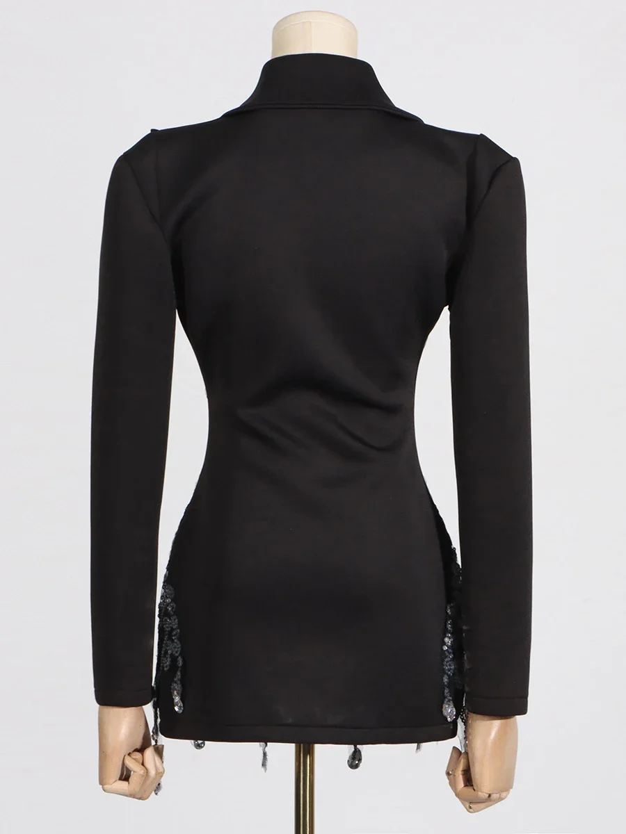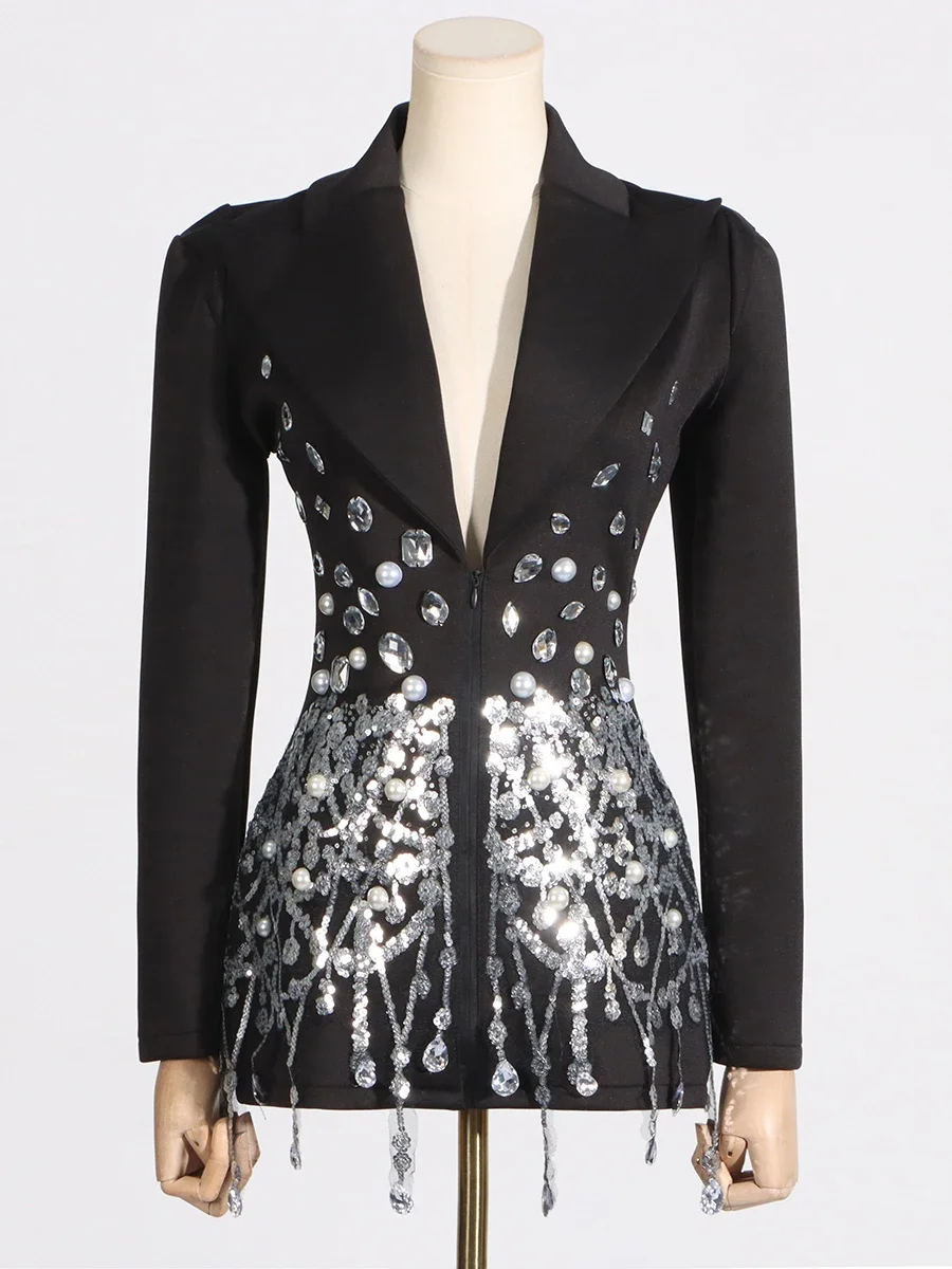 Chiever designer chique retalhos diamantes mini vestido para mulheres gola entalhada manga longa cintura alta vestidos de emagrecimento feminino novo