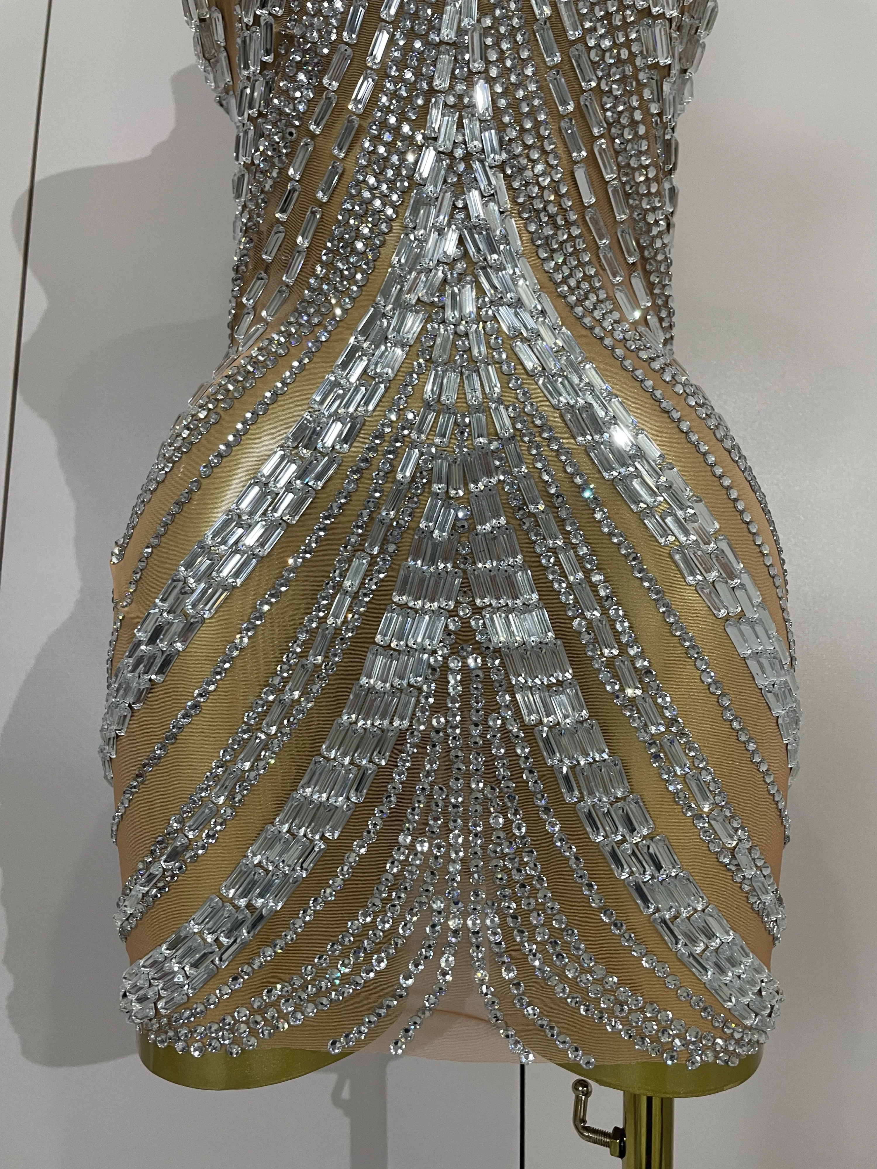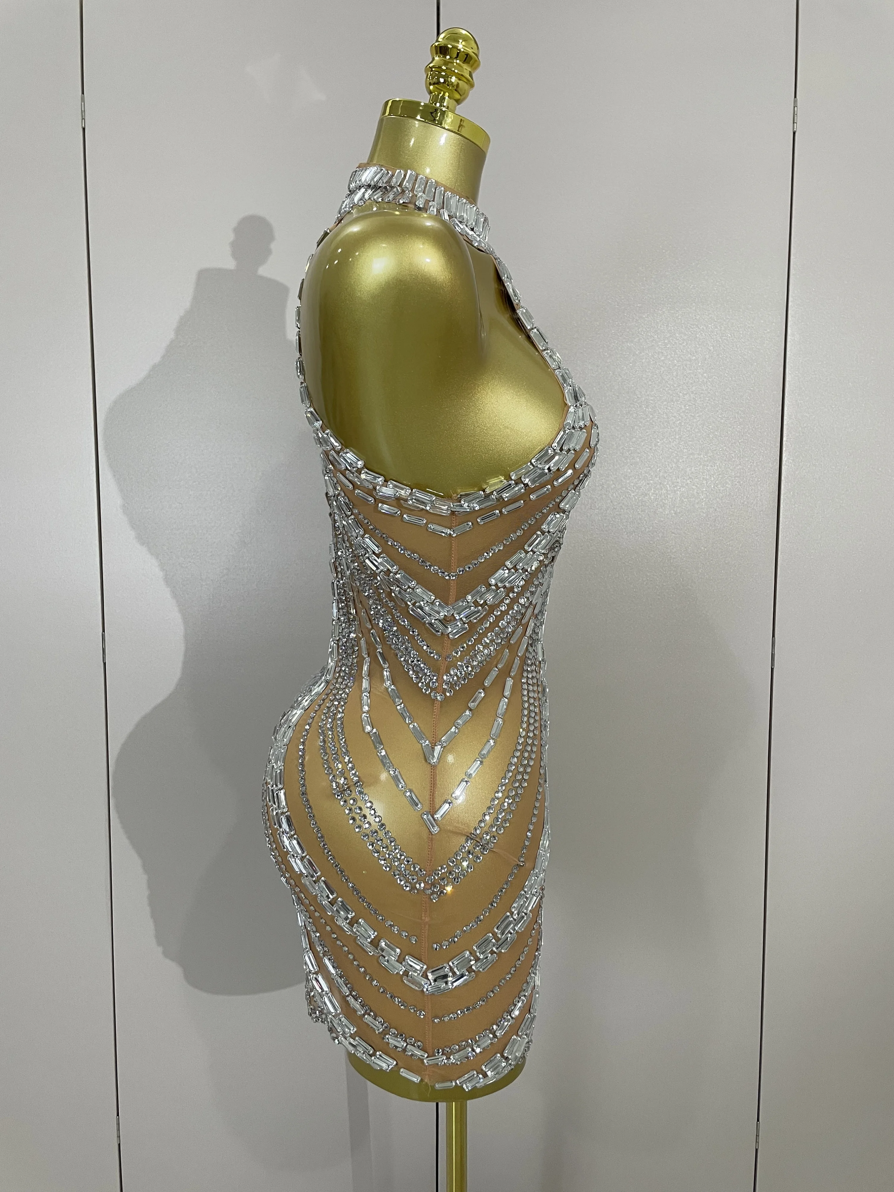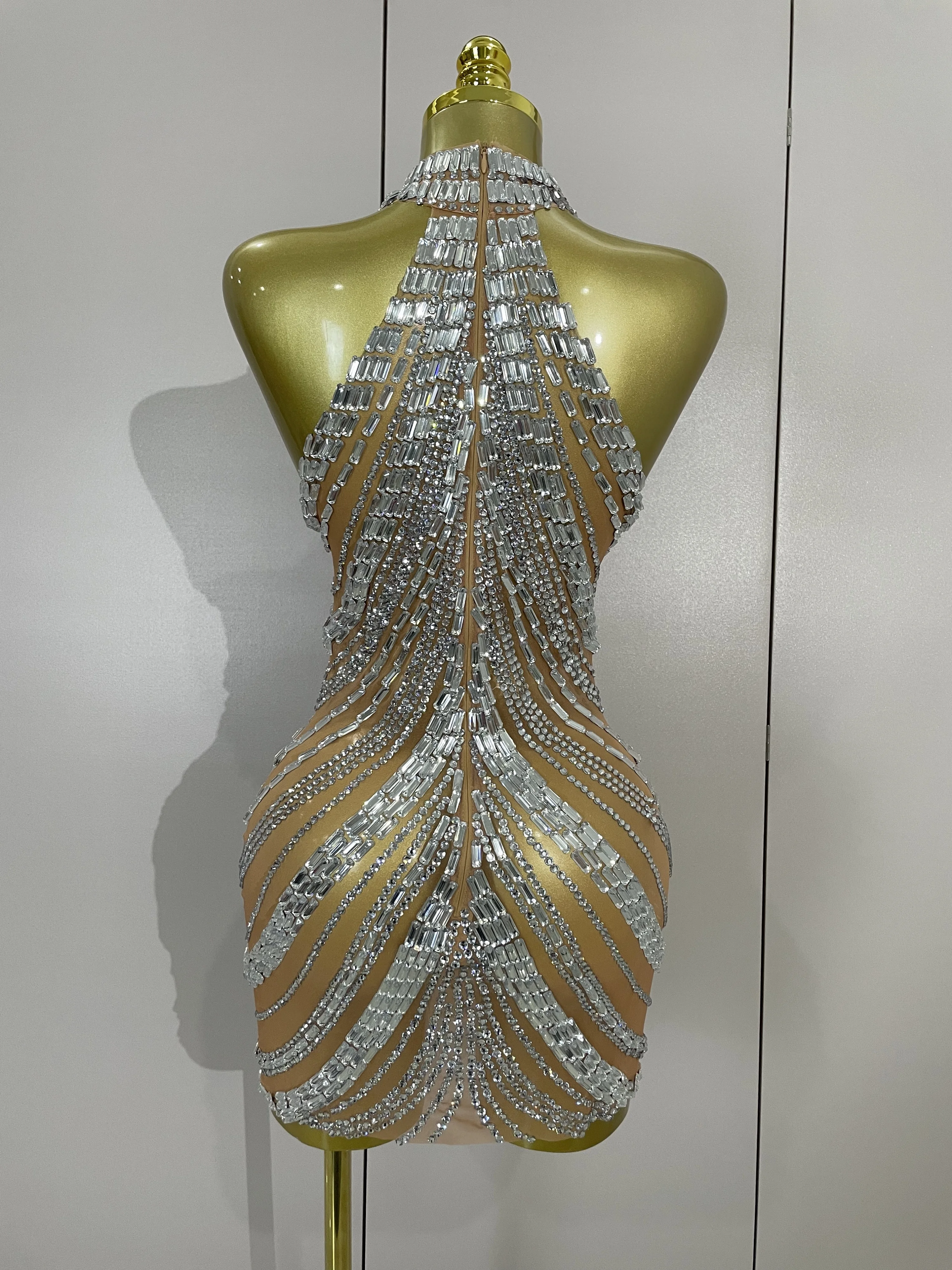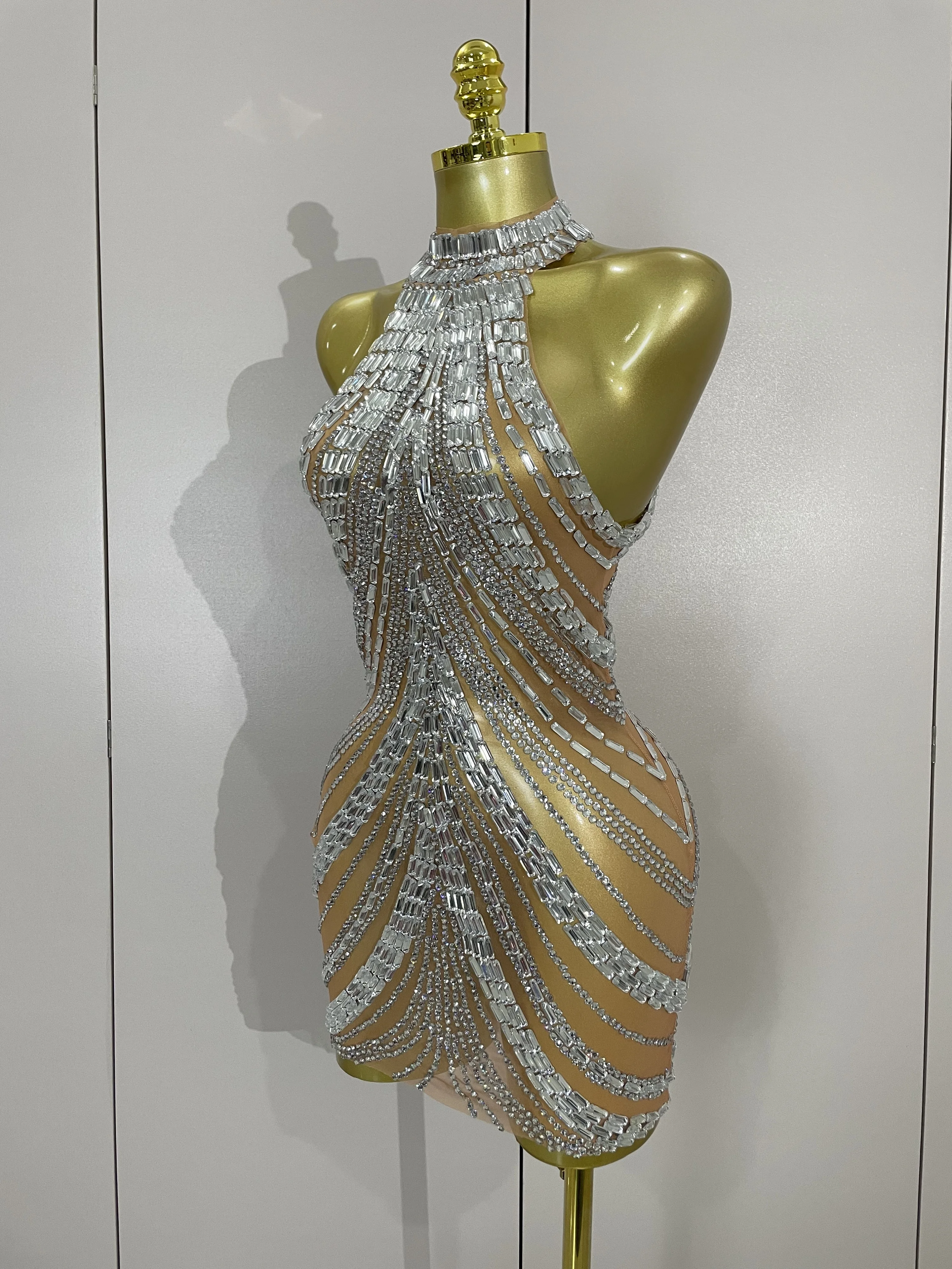 Sexy brilhante prata strass malha transparente mini vestido feminino noite celebrar festa de aniversário nnigthclub palco traje