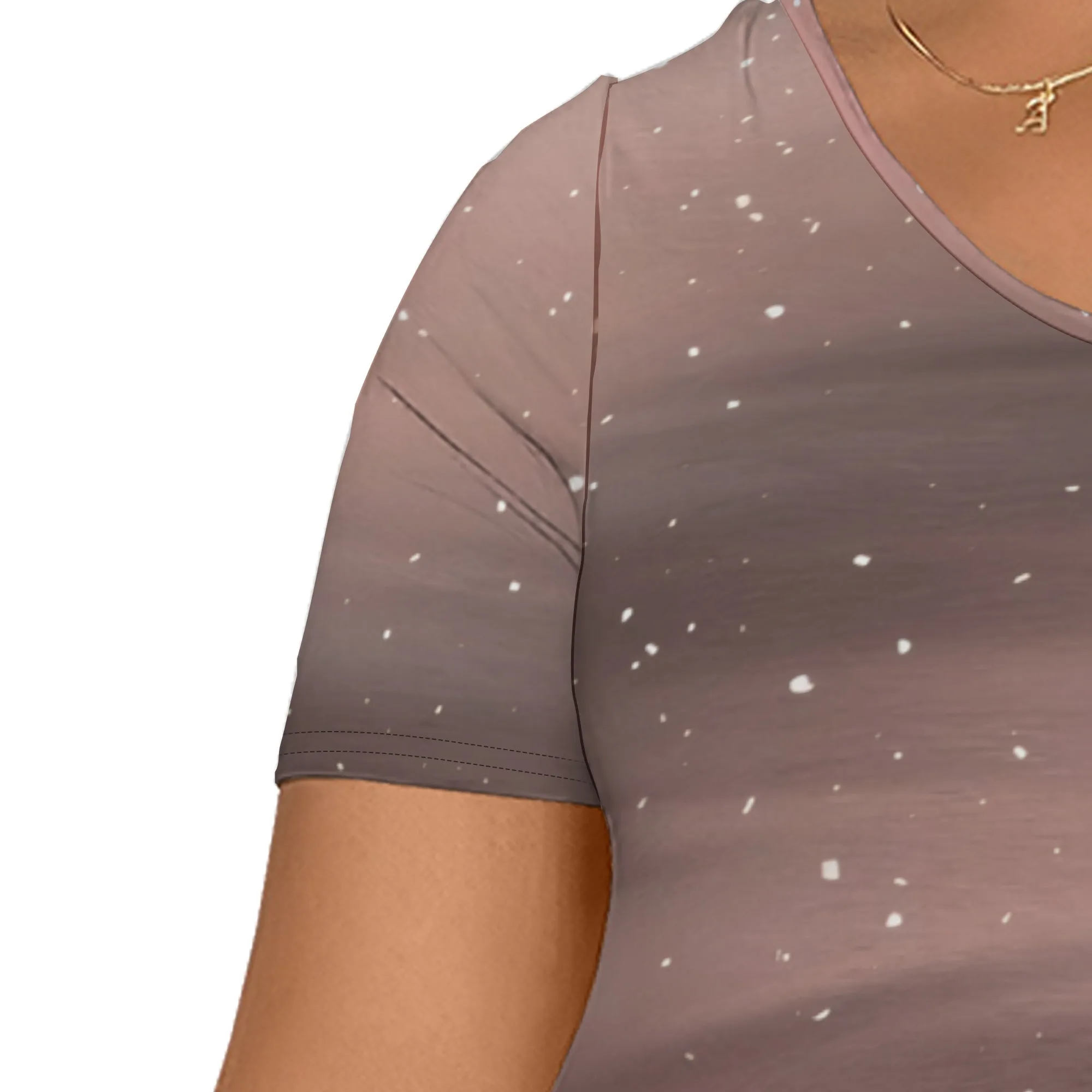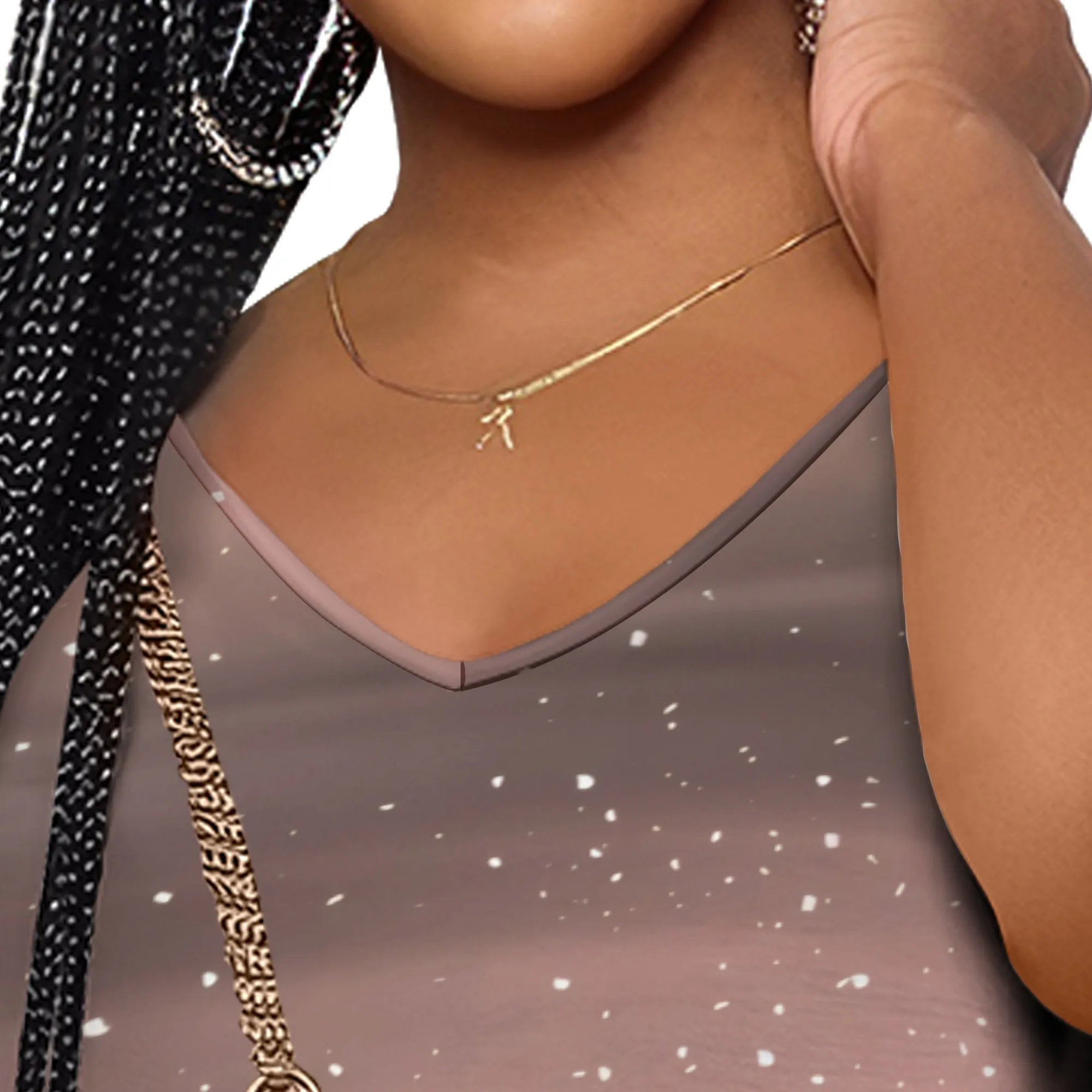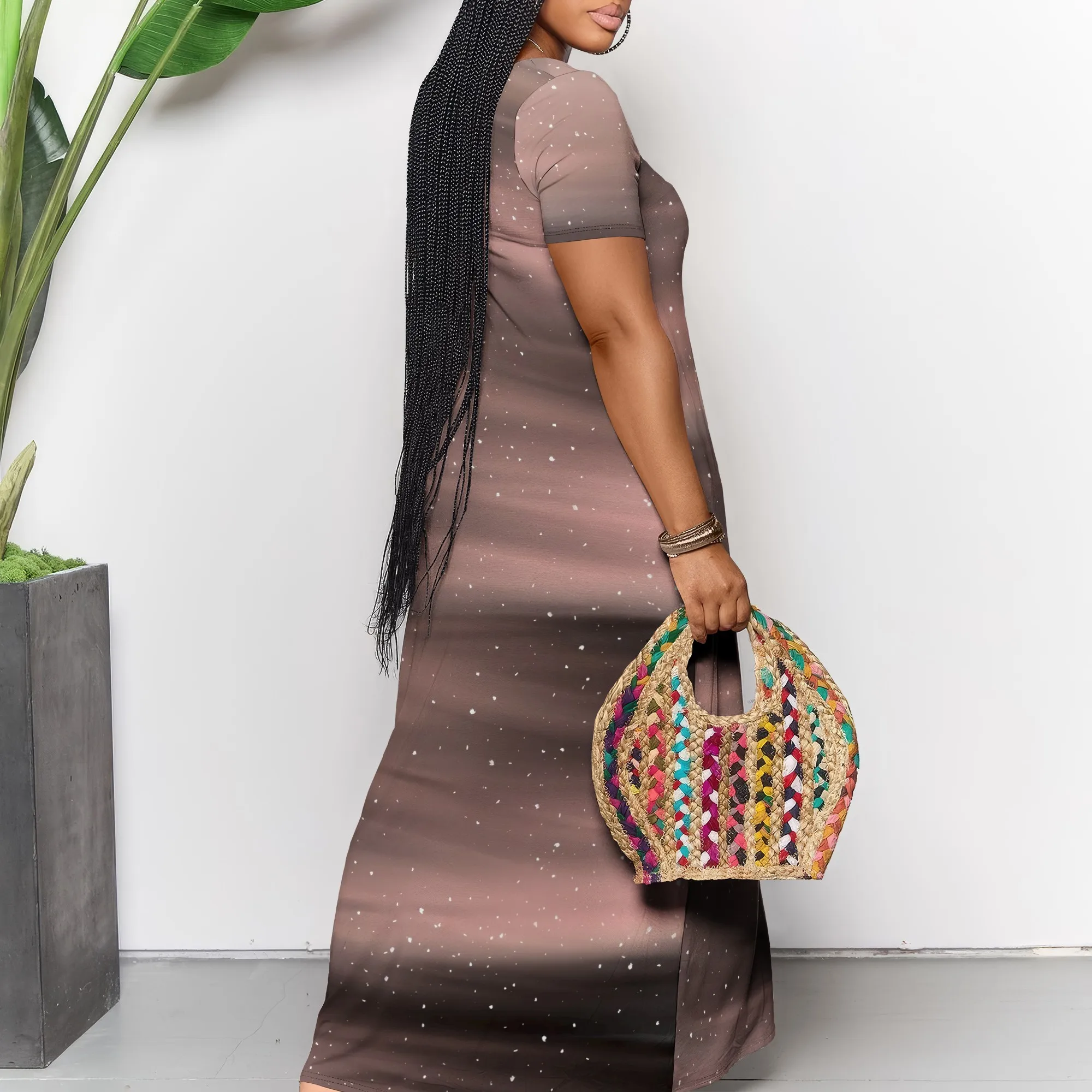 Vestido maxi ombre café com decote em V manga curta gradiente estrelado solto aparência casual