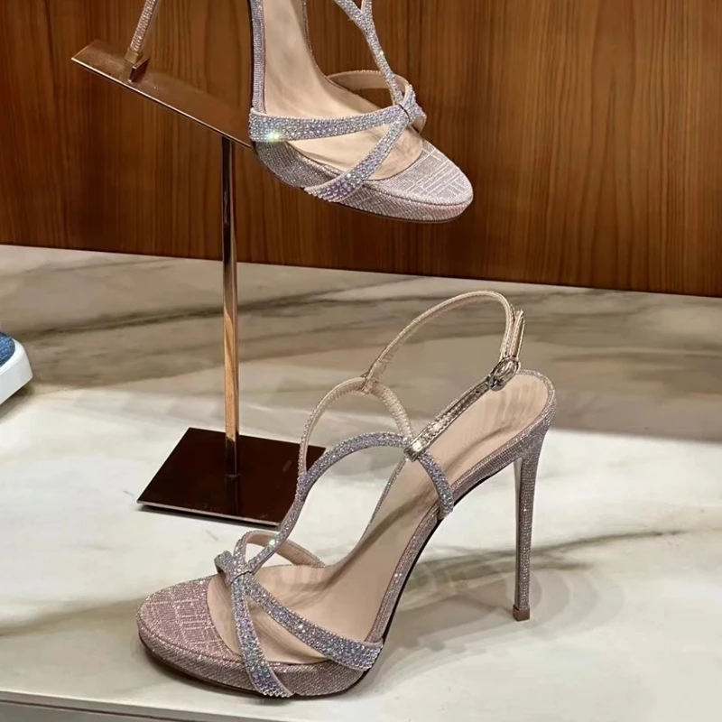 Sandálias sexy de salto fino de 12cm, plataforma à prova d'água, alça reta, novo estilo de verão feminino, salto alto com strass super brilhante