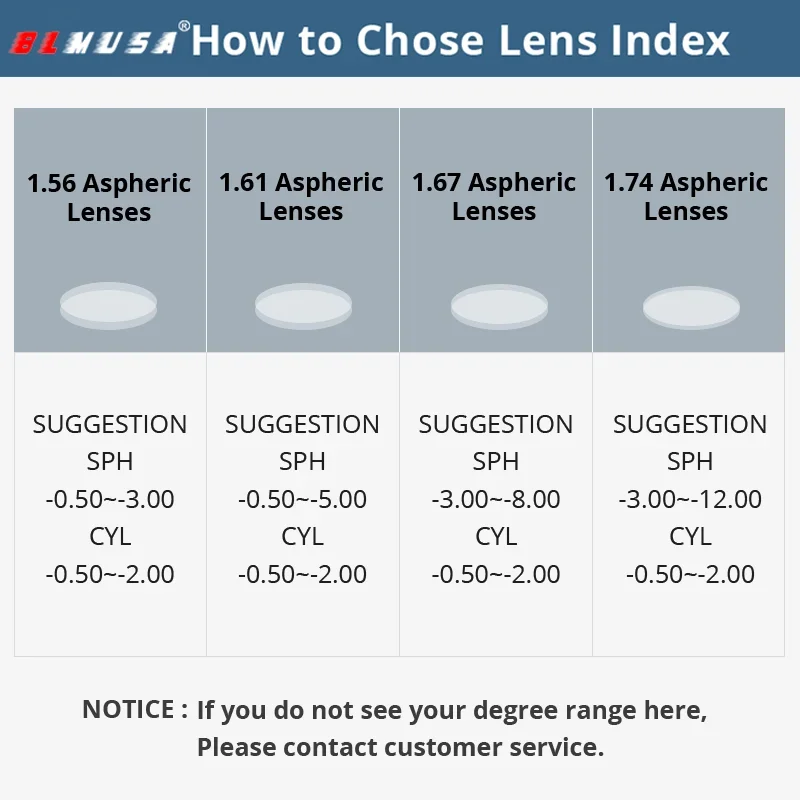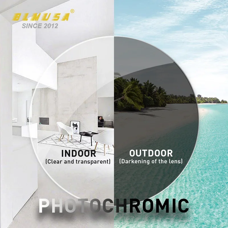 BLMUSA Anti-Blaulichtstrahlen Photochrome Serie Gleitsichtlinse 1,56 1,61 1,67 1,74 Asphärische CR-39-Harzlinsen mit Sehstärke