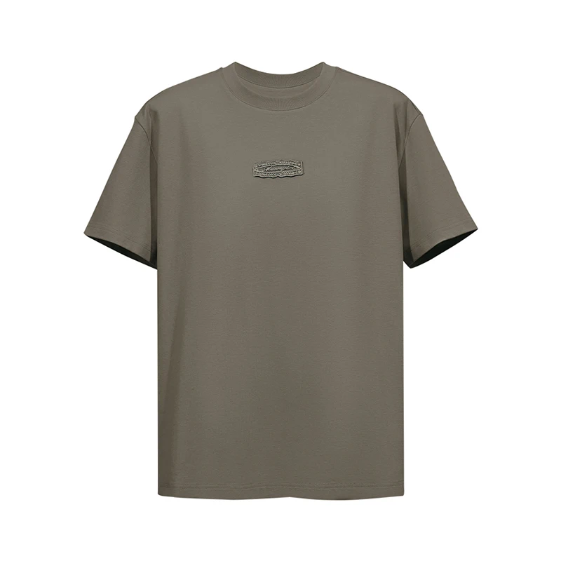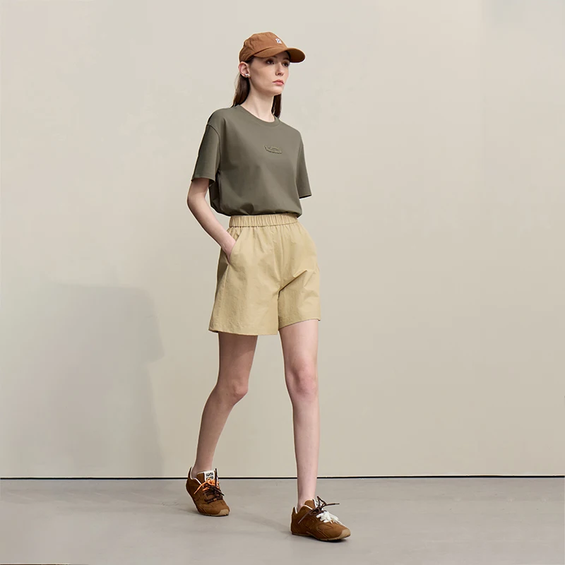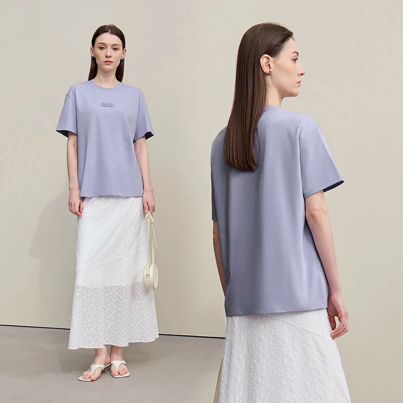 Amii Damen T-Shirt 2026 Sommer Rundhals Drop-Shoulder Kurzarm Tee mit Spitzenetikett und Schriftzug Lässiges lockeres Baumwoll-Oberteil 12612004