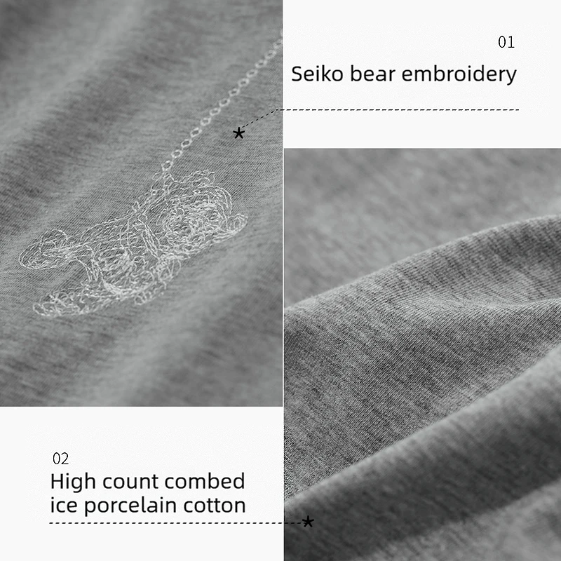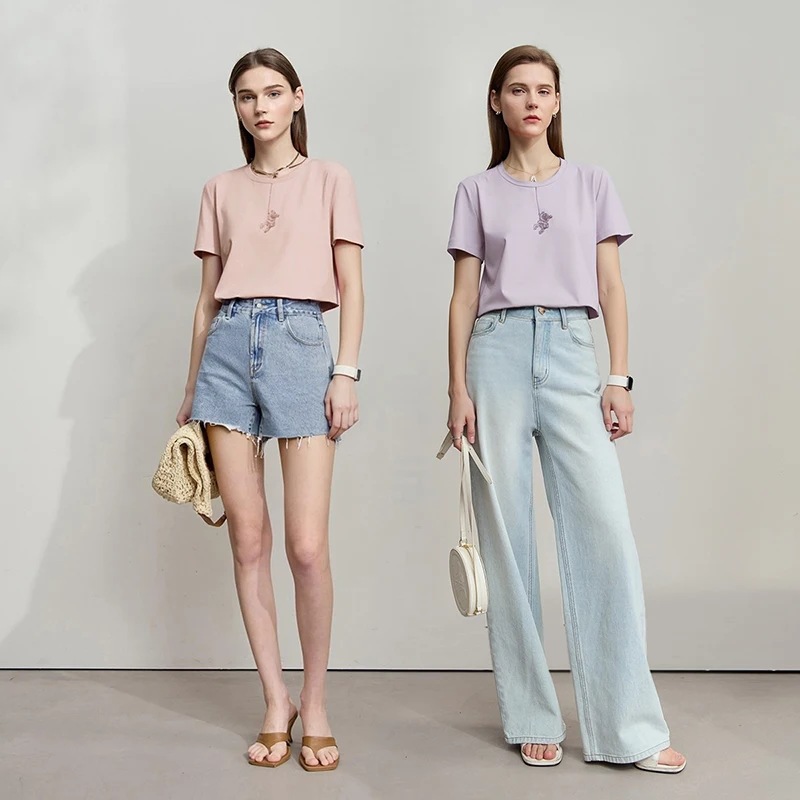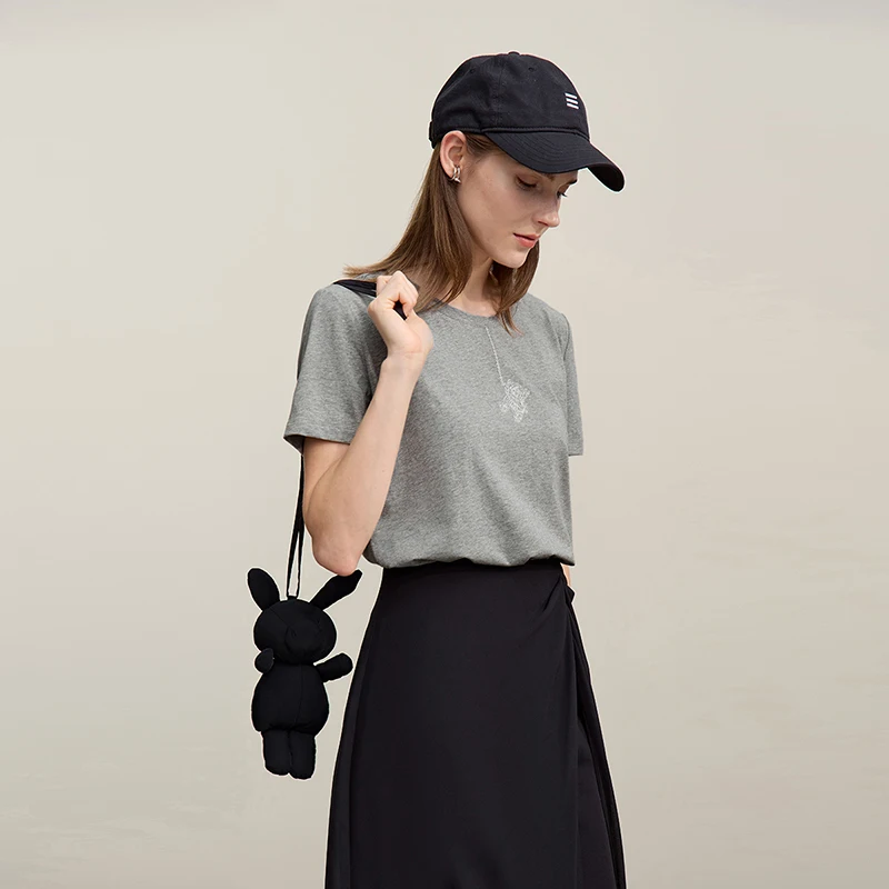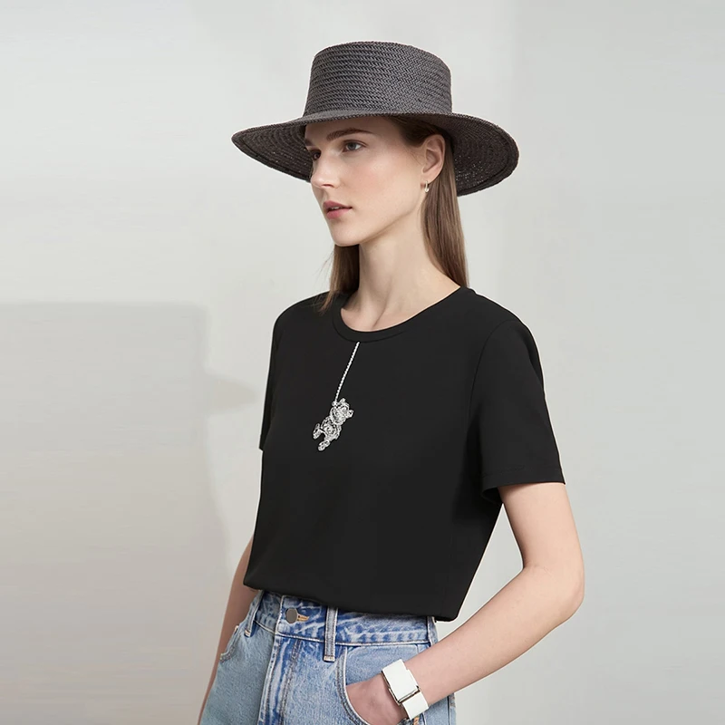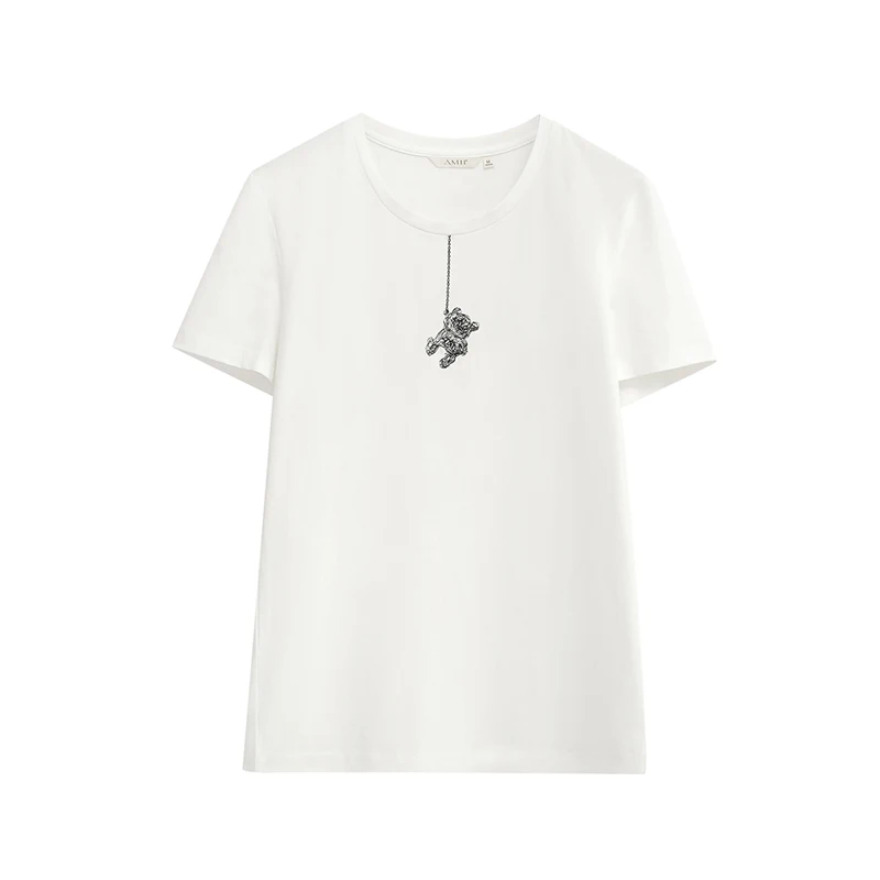 Amii T-Shirts für Damen, Sommer 2026, neues Baumwoll-Rundhals-T-Shirt, lässiges, vielseitiges Kurzarm-Oberteil mit Bären-Stickerei für Frauen 12622086