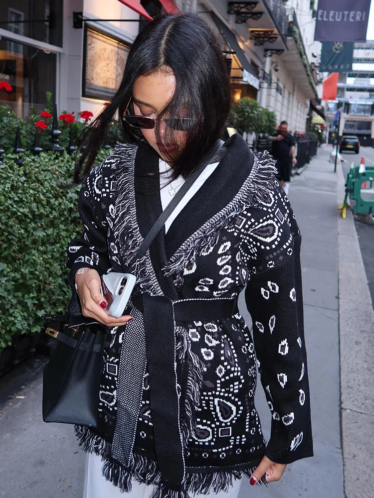 2026 frühling Quaste Gestrickte Jacquard frauen Strickjacken Lose Patchwork V-ausschnitt Langarm Dicke Warme Pullover Dame Neue Strickwaren