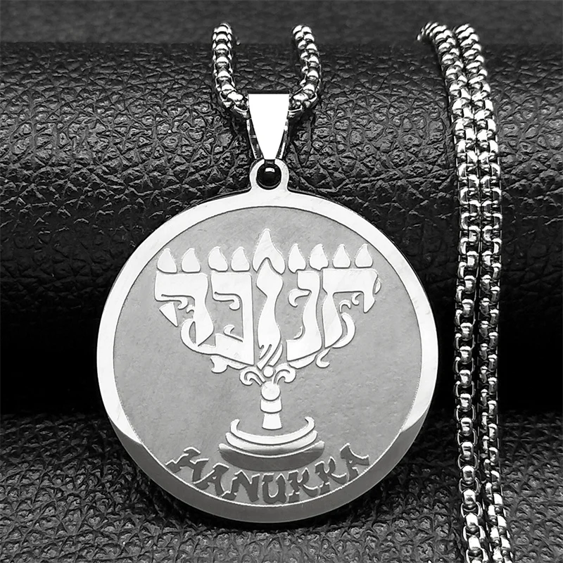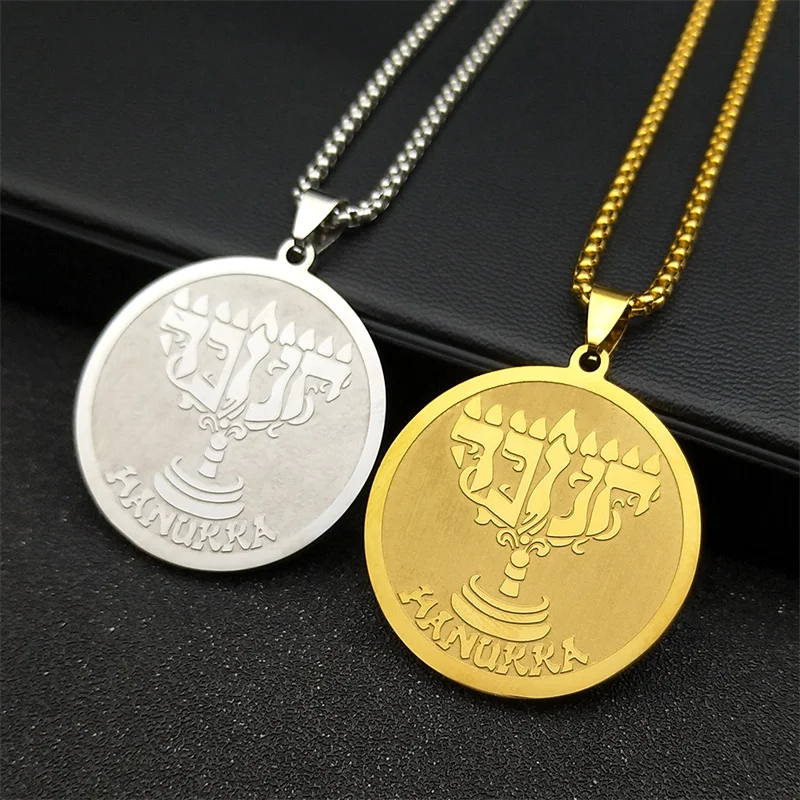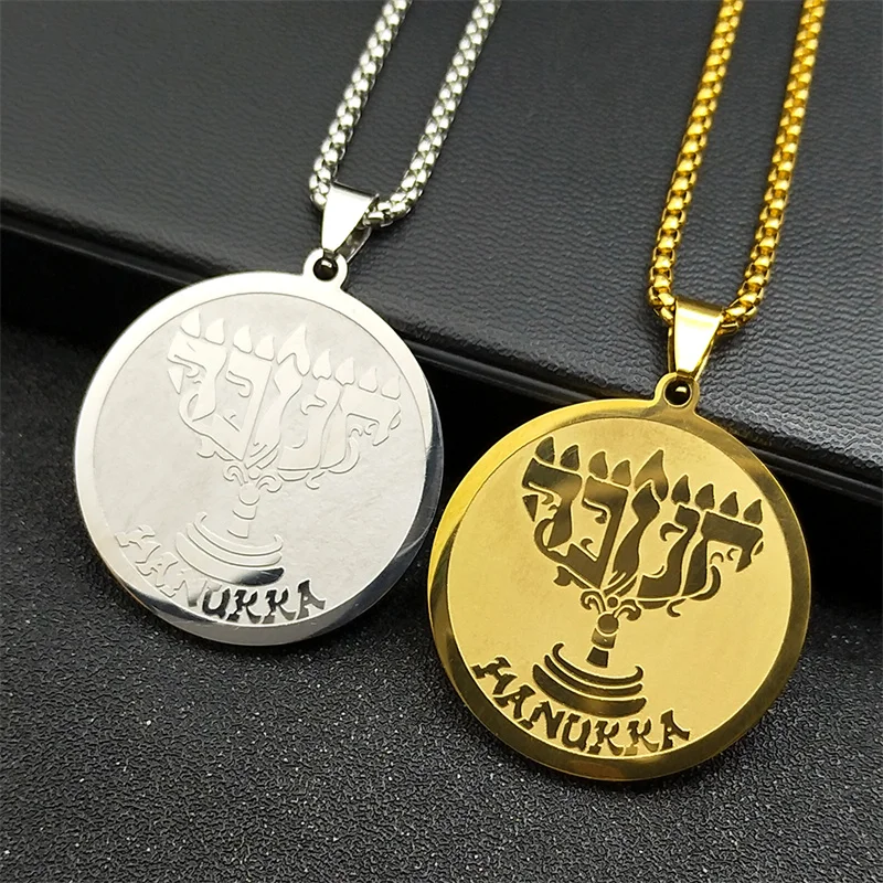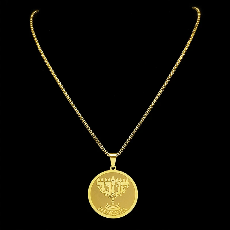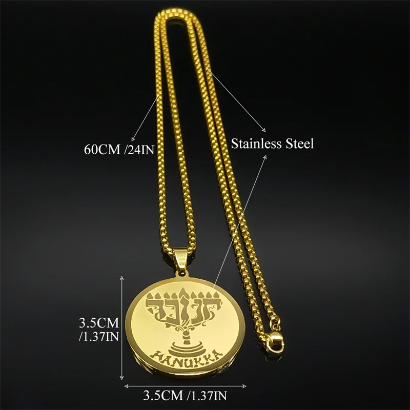 Jüdische Chanukka-Halskette mit neun Lampen-Kerzenständer-Anhänger für Damen und Herren, Edelstahl, goldfarben, hebräischer religiöser Kettenschmuck