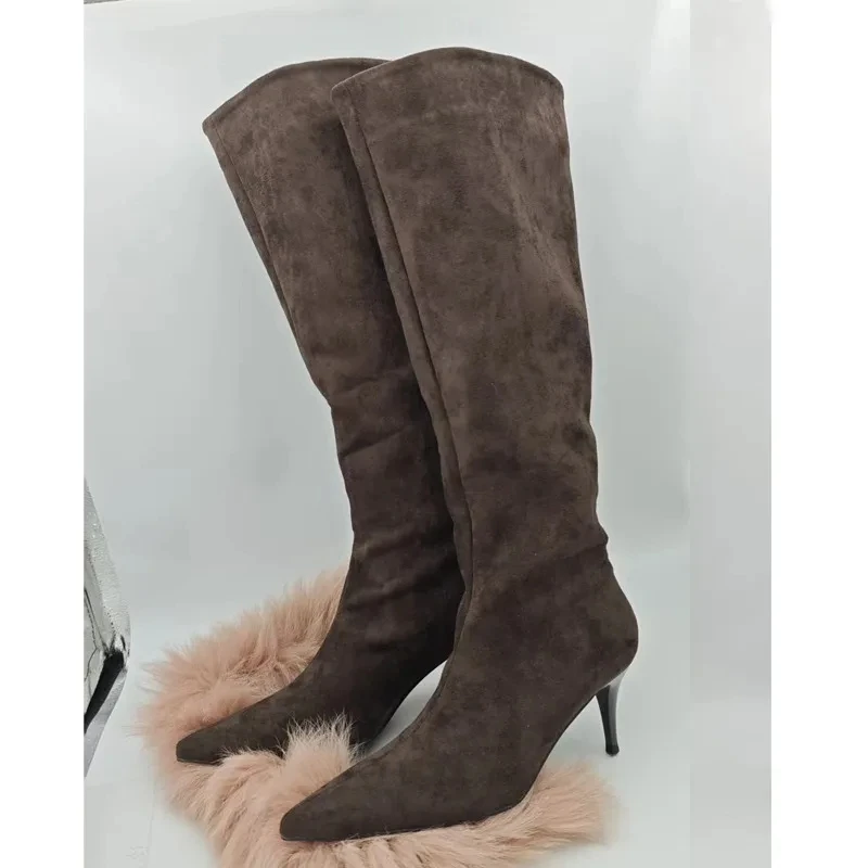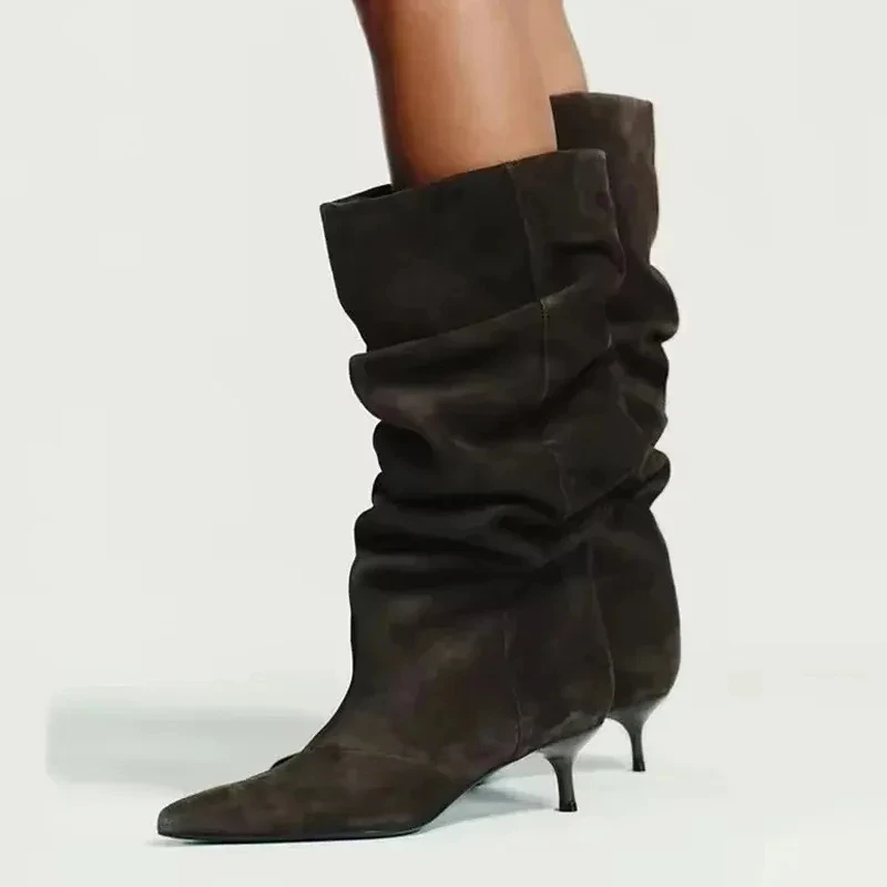 - Pleated Suede Knee High Boots