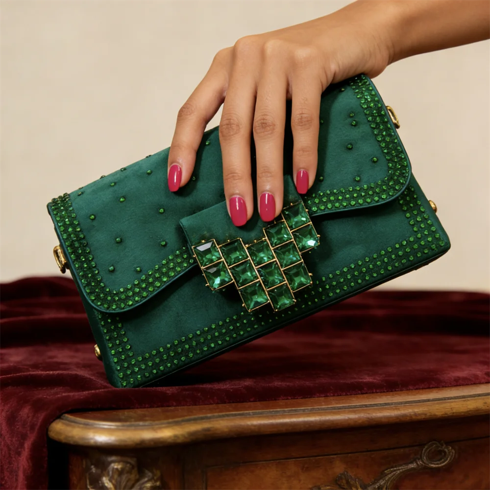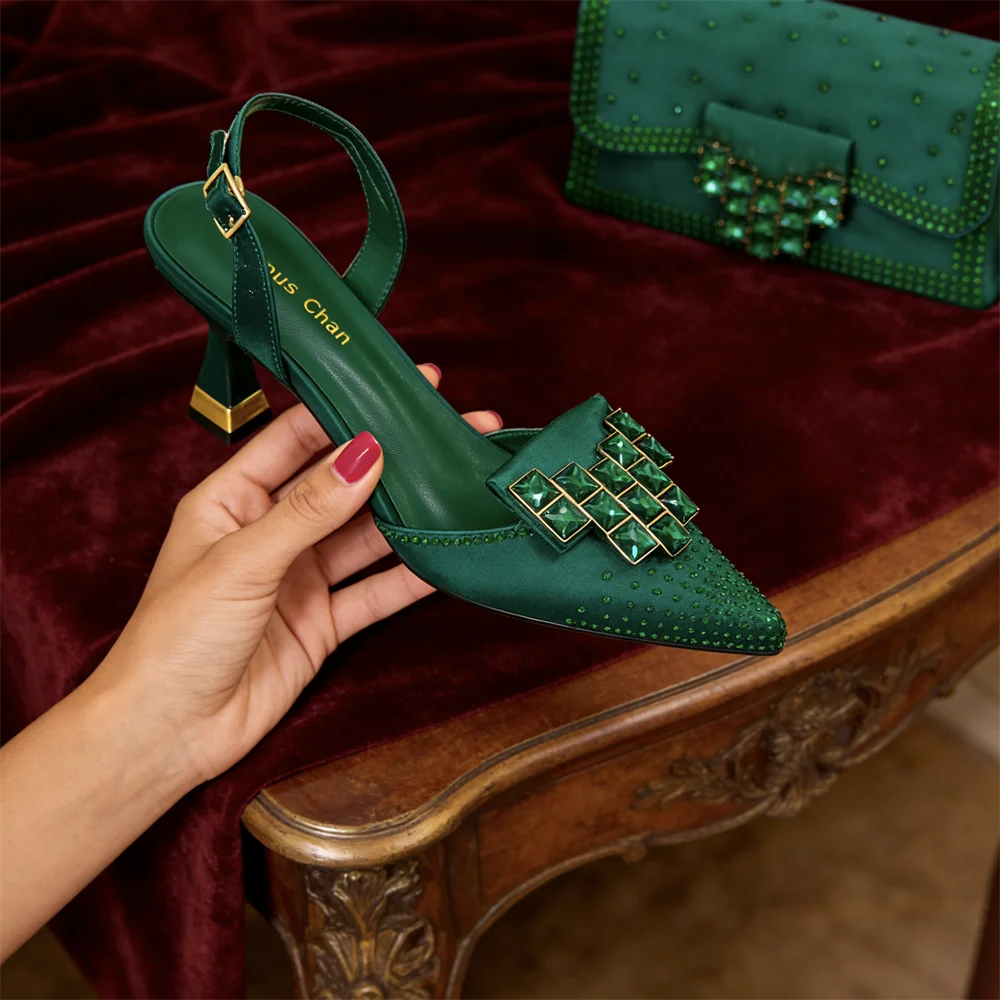 Grüne Damen-High-Heel-Schuhe mit Strass und passender Tasche – stilvolles Schuhwerk mit spitzer Zehenpartie für Partys und besondere Anlässe