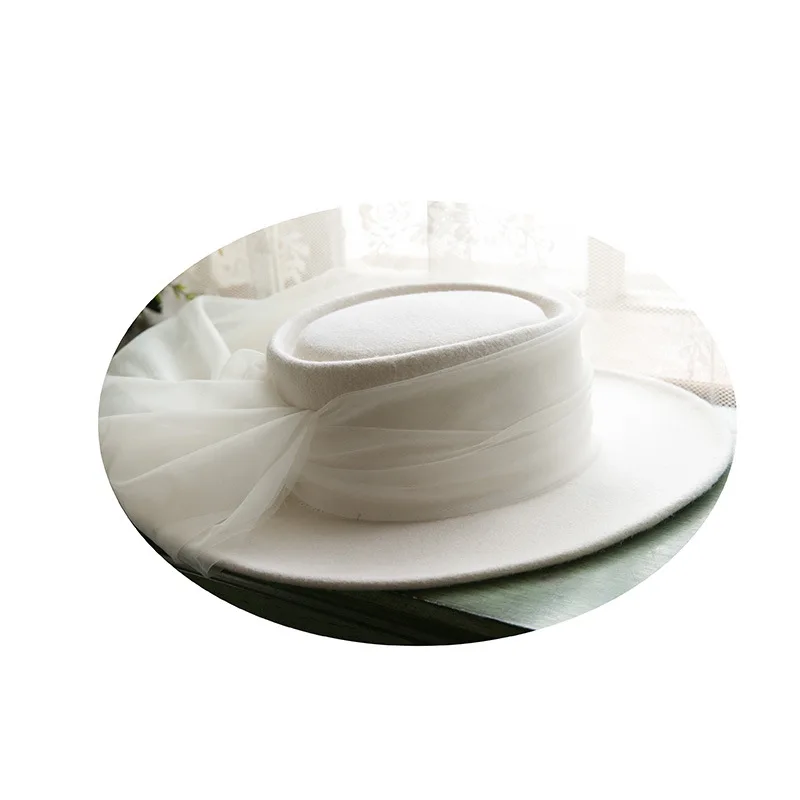 New French 100% Wool Top Hat Veil Vintage Dinner Party Elegant White Fedora Travel Light Wedding Head Dress Accessories