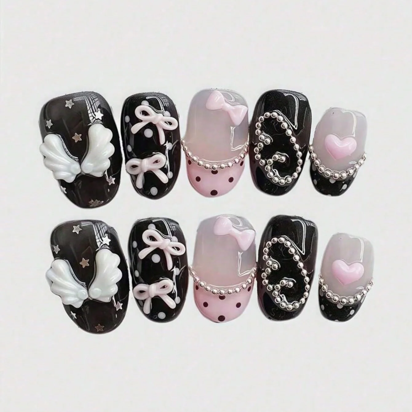10pcs pure hand pressed short circular nail art, beautiful fake nails, sweet and cool pink bow, suitable for women to use