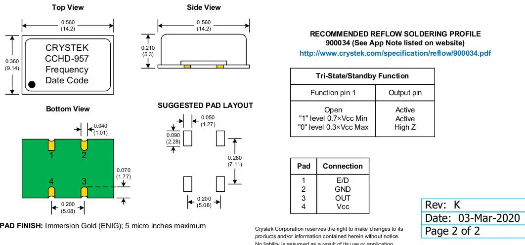 - Limited specs provided, check CRYSTEK datasheet for voltage/temp