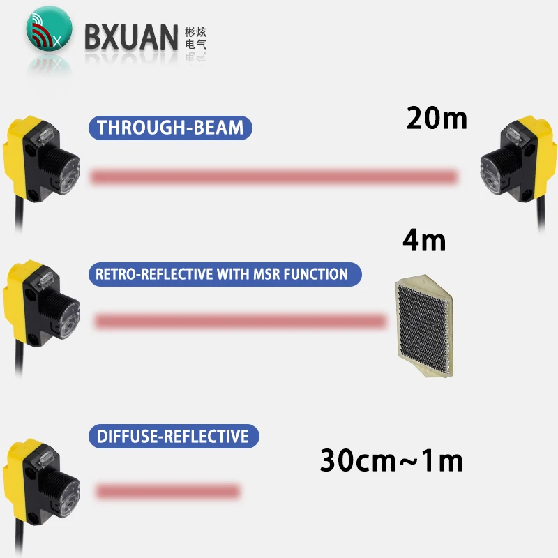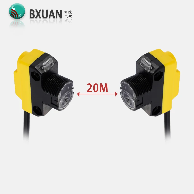 Mount and wire to PLC or controller; detects objects via infrared beam interruption up to 20m.