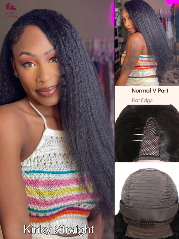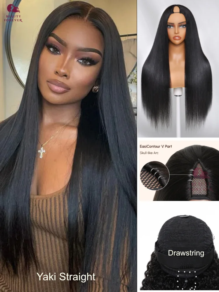 Beautyforever No Leave Out V Part Wig Human Hair Yaki Straight / Kinky Straight Human Hair Wig Density 180 % Machine Made Wig