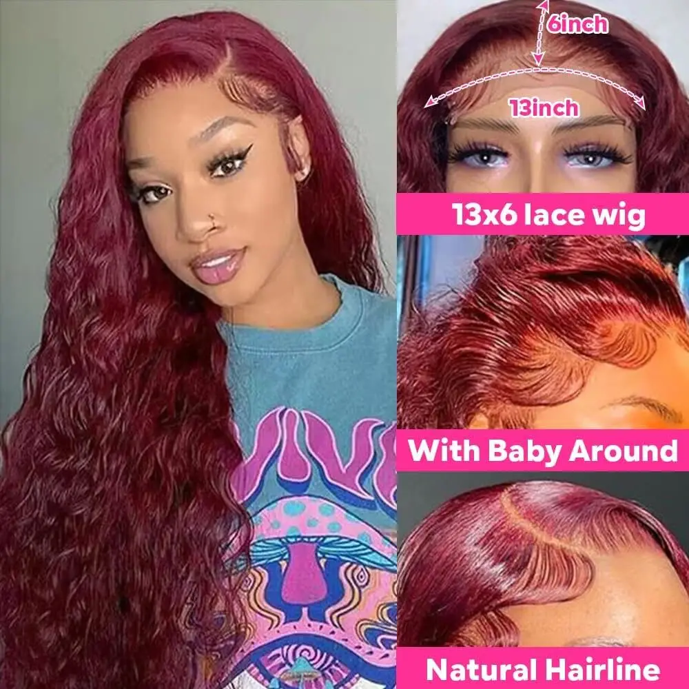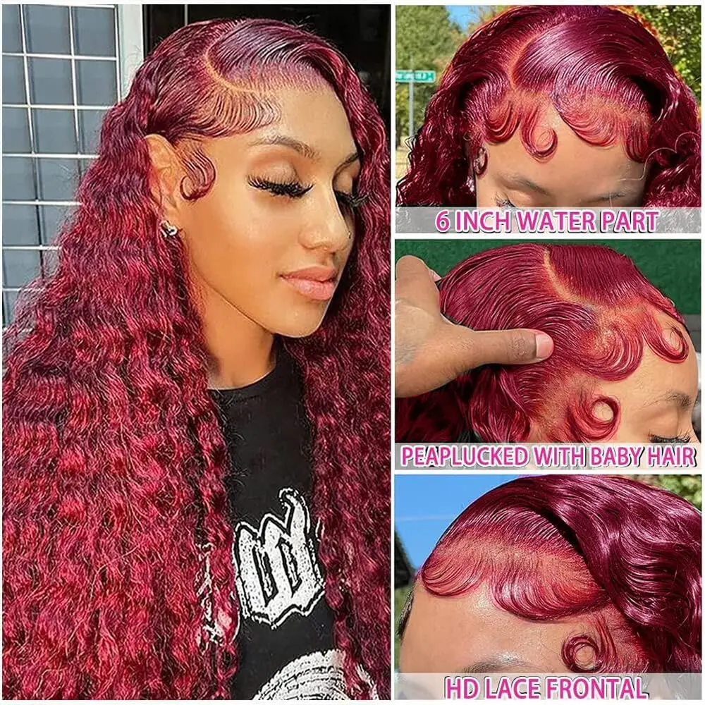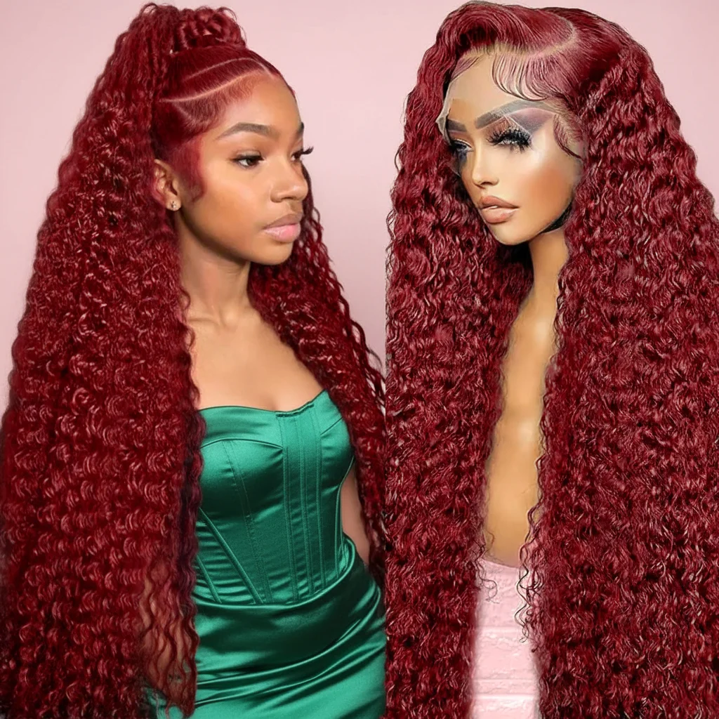 Deep Wave 99J Burgundy 13x4 Lace Frontal Wigs Human Hair 13x6 Curly 30 Inch HD Transparent Lace Front Wigs Brazilian for Women