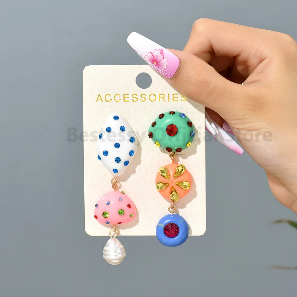 Cartoon Style Cute Sweet Long Dangle Earrings Multicolor Resin Inlaid Rhinestone Asymmetrical Pendant Fashion Jewelry For Woman