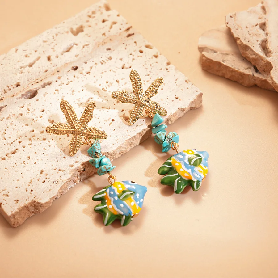 Colorful Fish Starfish Drop Earrings for Women Bohemian Ceramic Stone Earrings Cartoon Marine Life Series Party Ear Jewelry F