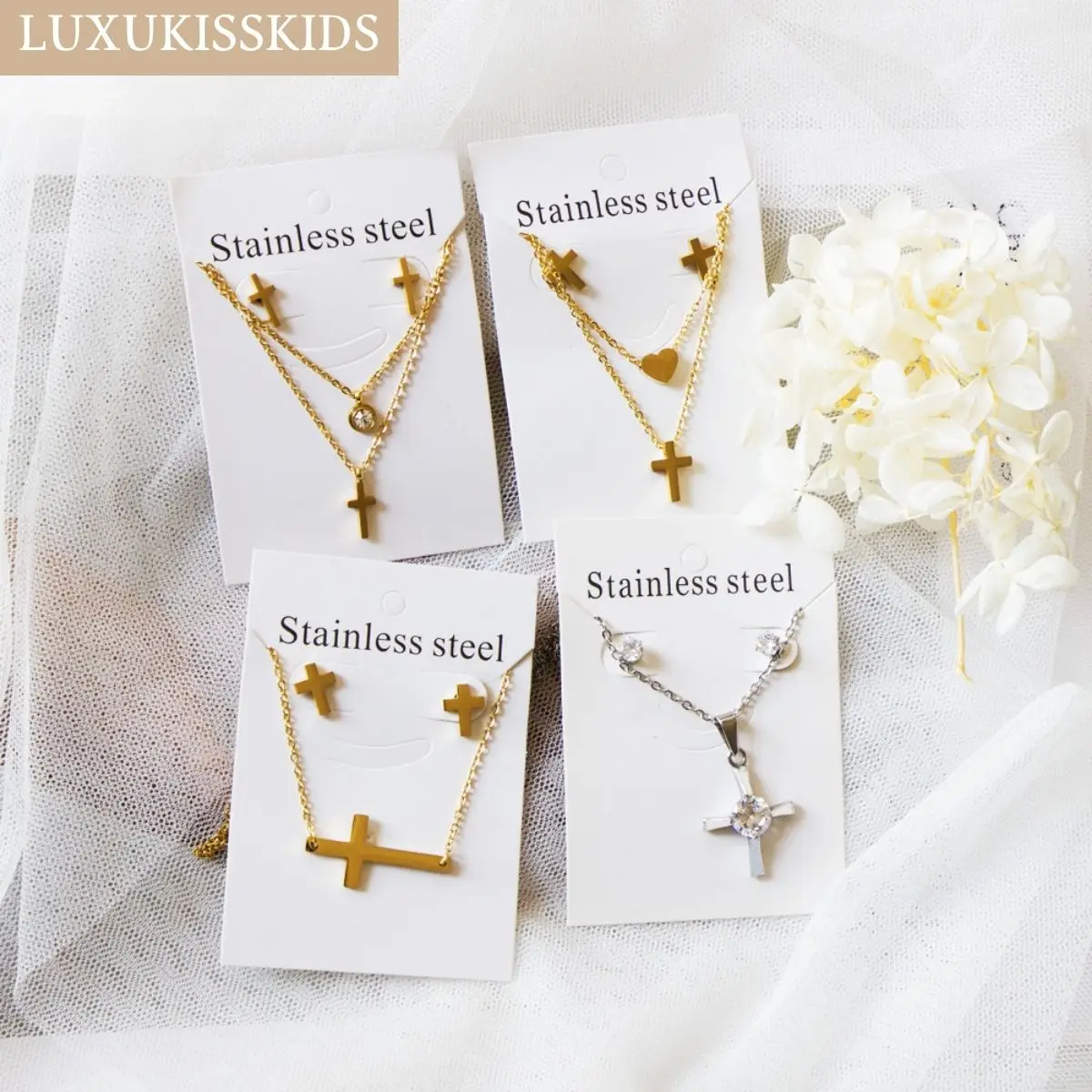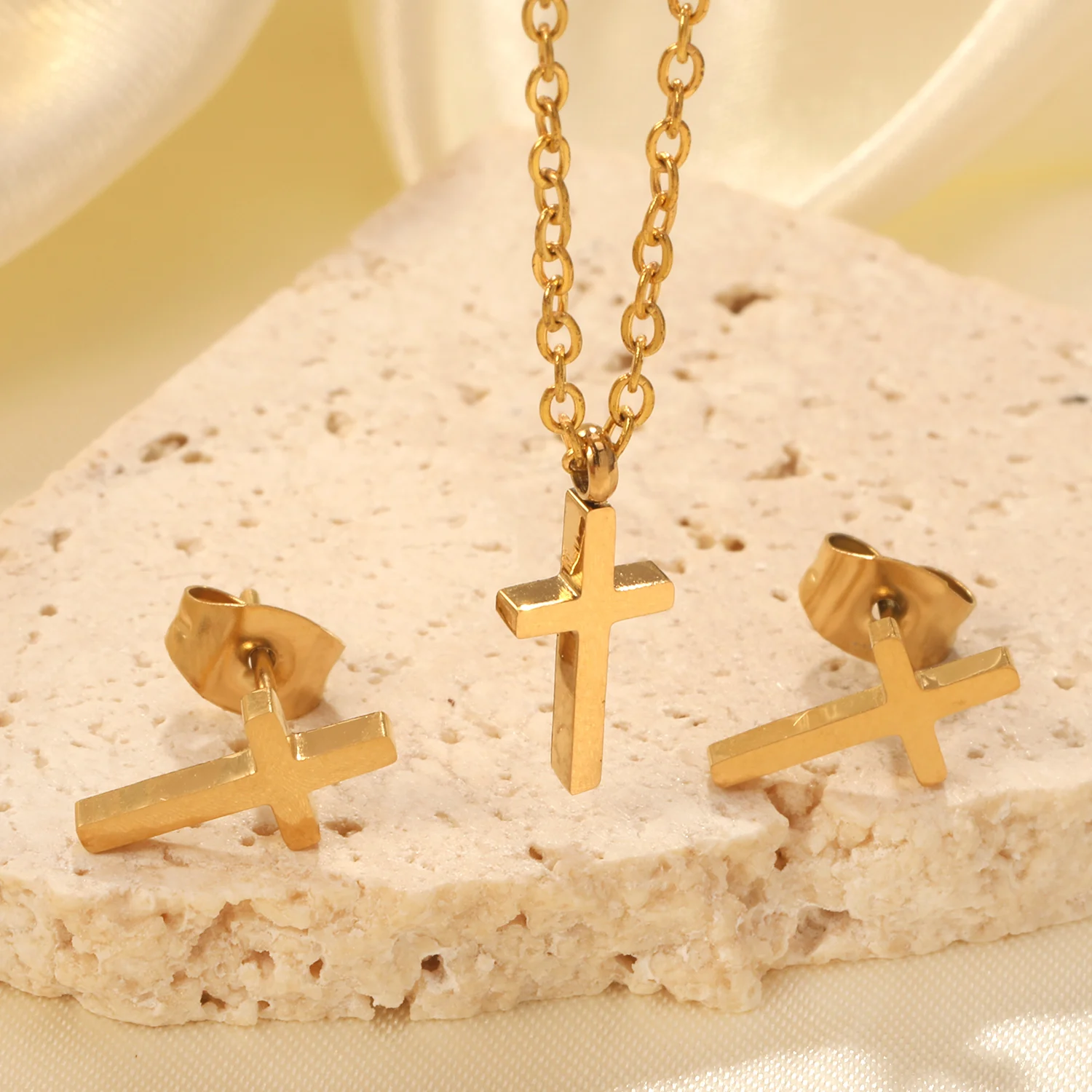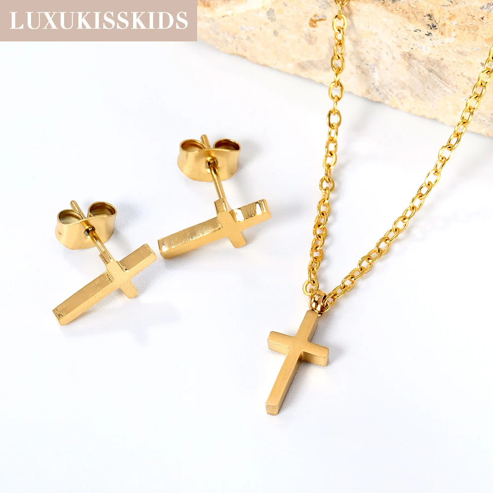 LUXUKISSKIDS Cross Charm Jewelry Set Stainless Steel Christian Necklace Woman/Men Simple Crosses Stud Earrings Classic Accessory