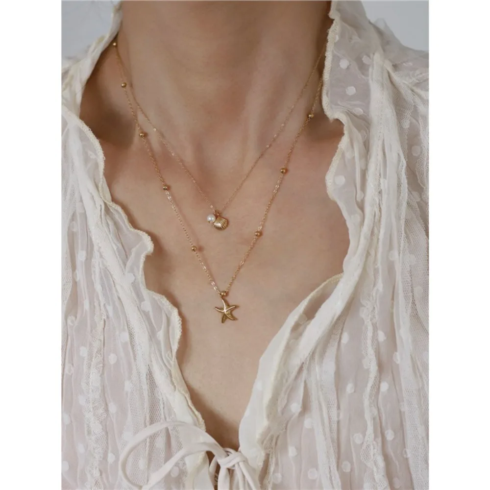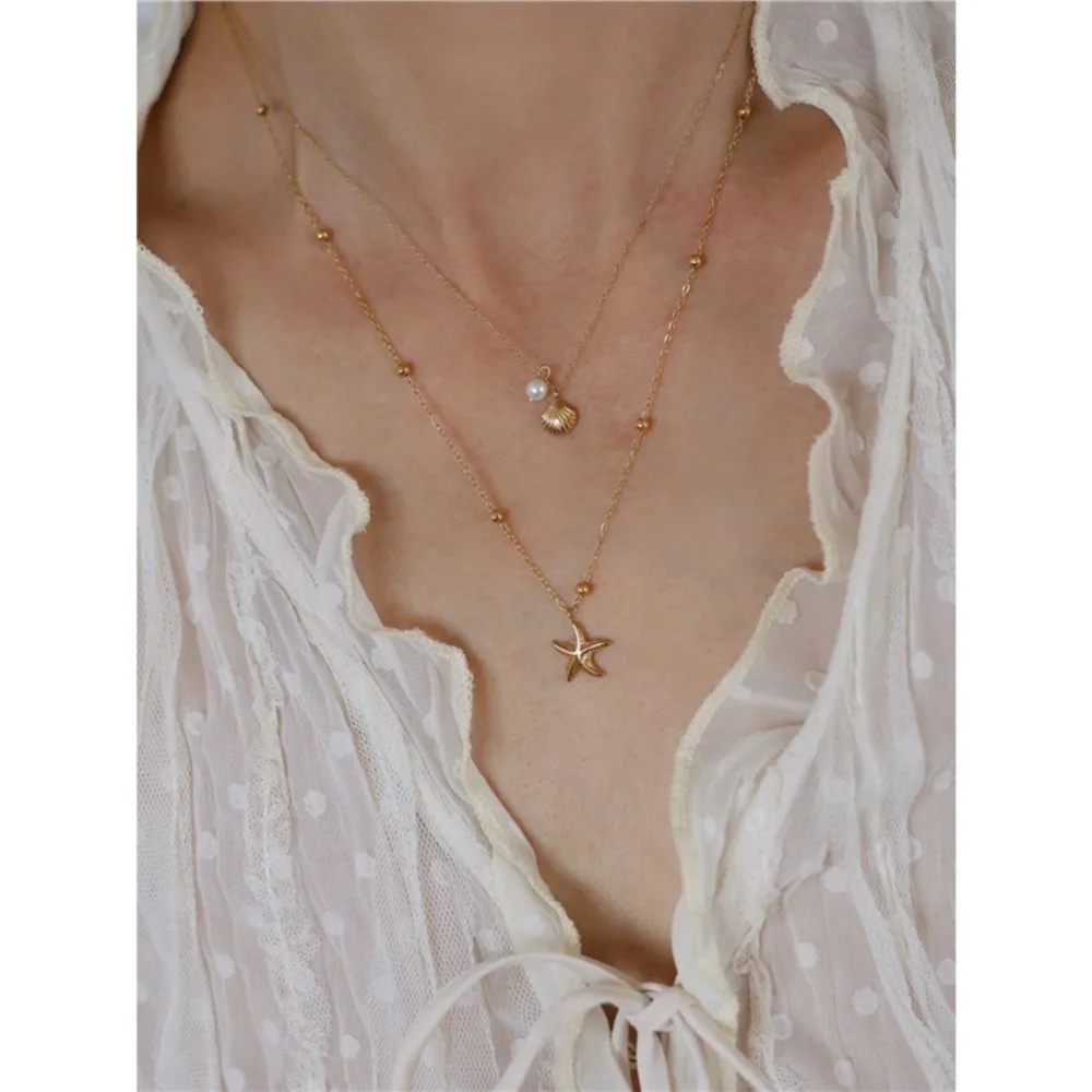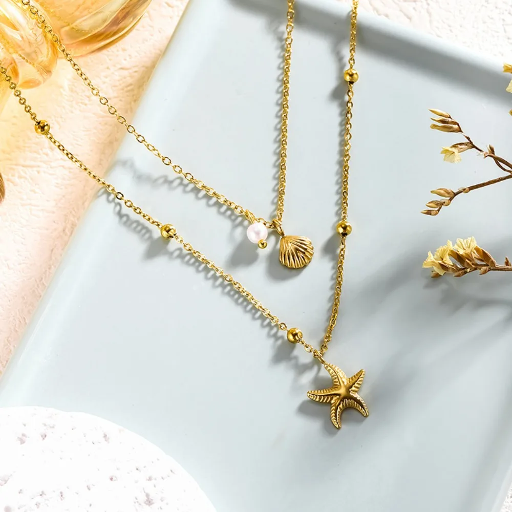 Ocean Vacation Style Gold Color Stainless Steel Pearl Shell Starfish Pendant Necklace for Women Charm Beach Collar Jewelry Gift