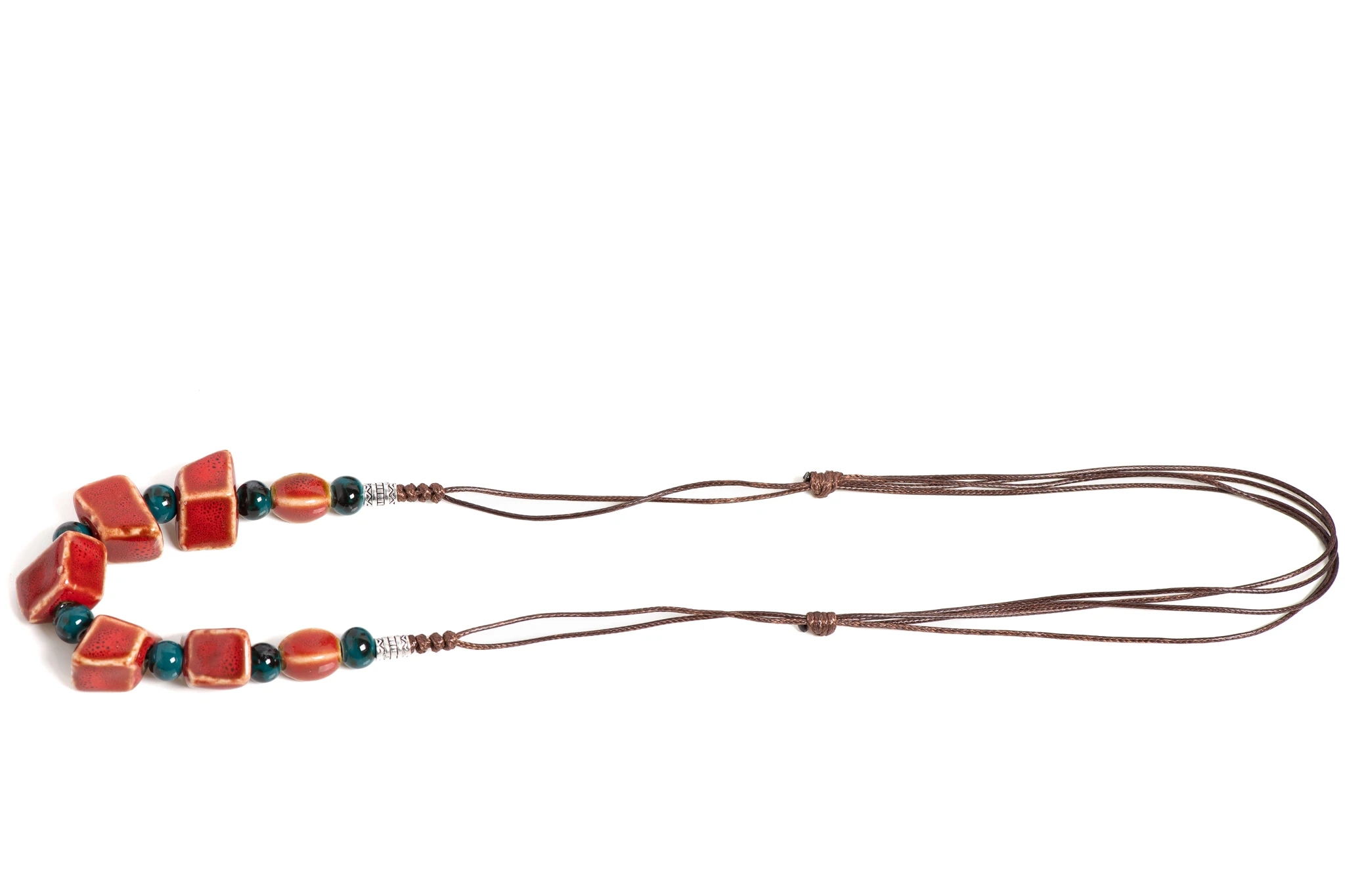 Red Geometric Ceramic Necklace Handmade Adjustable Artistic Vintage Pendant Jewelry 1148