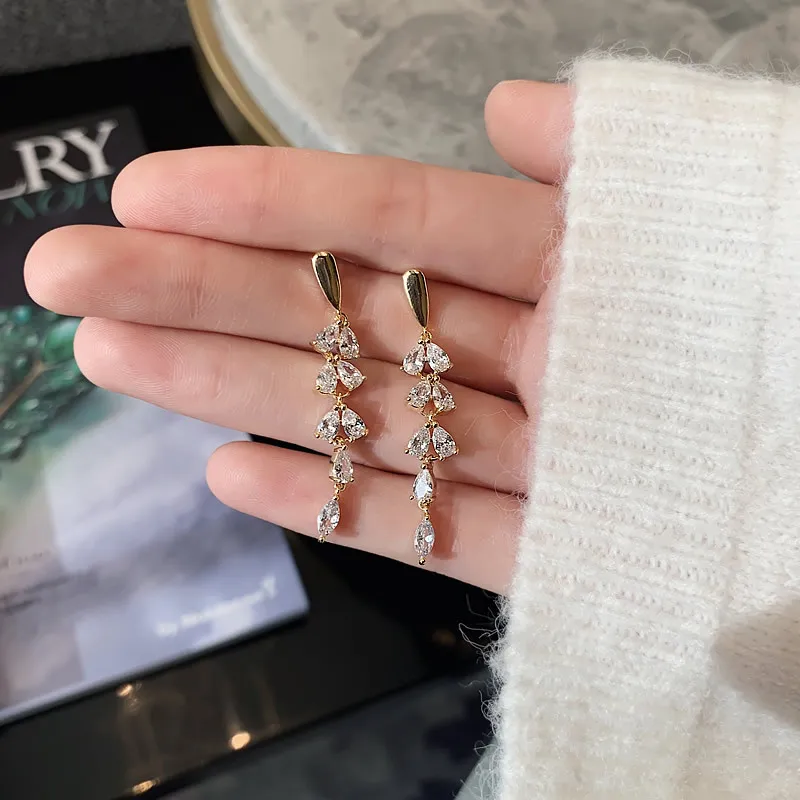 Shiny Zircon Tassel Leaf Shape Gold Color Earrings For Womans New Fashion Jewelry Wedding Party Unusual Girl's Luxury Earrings
