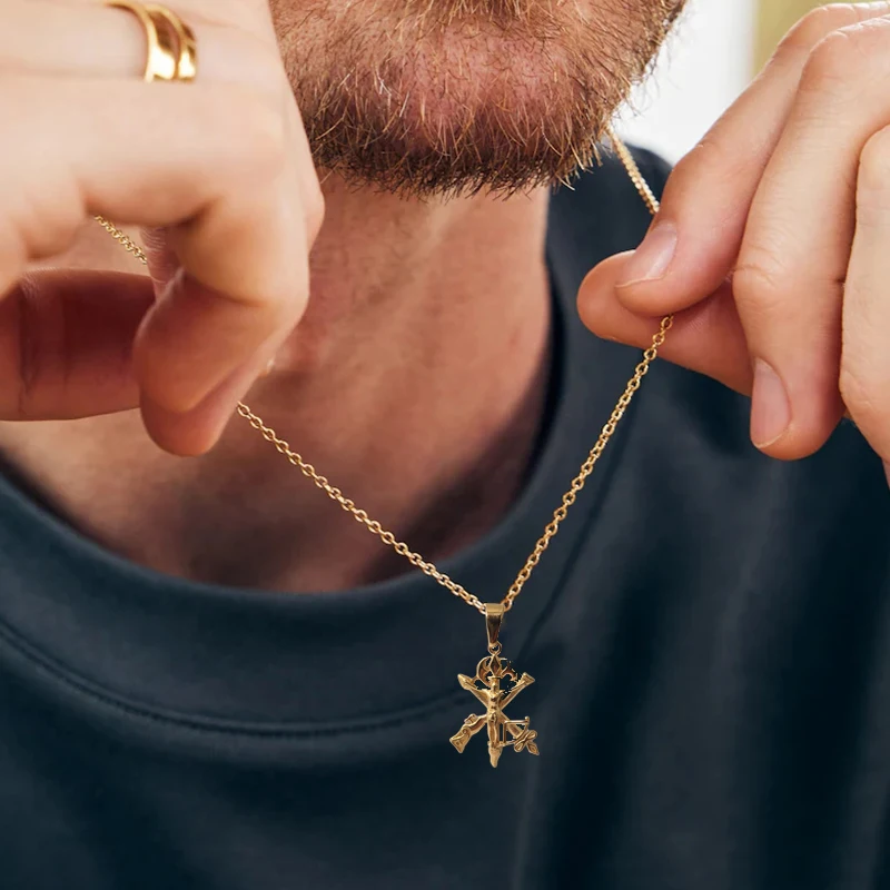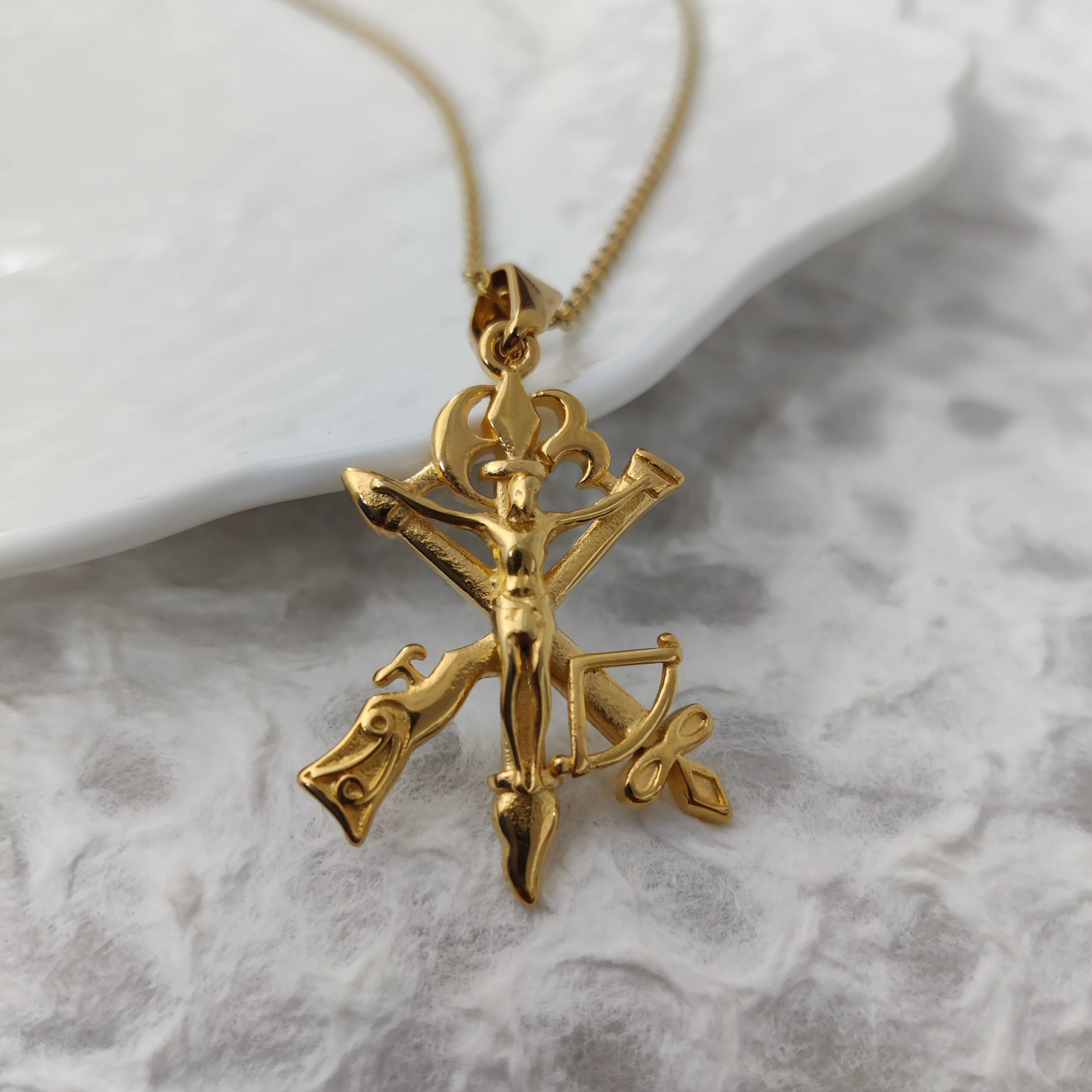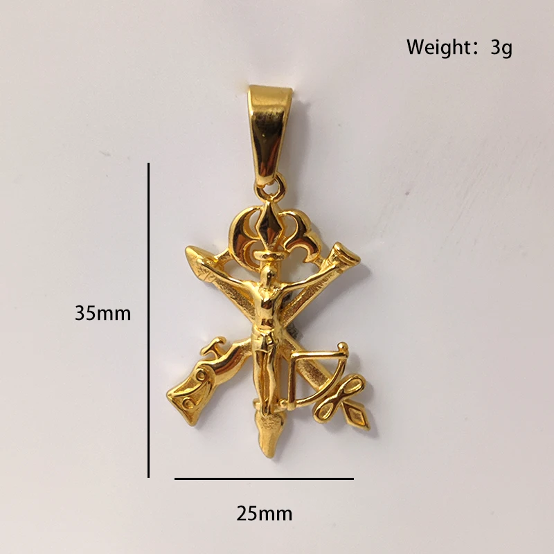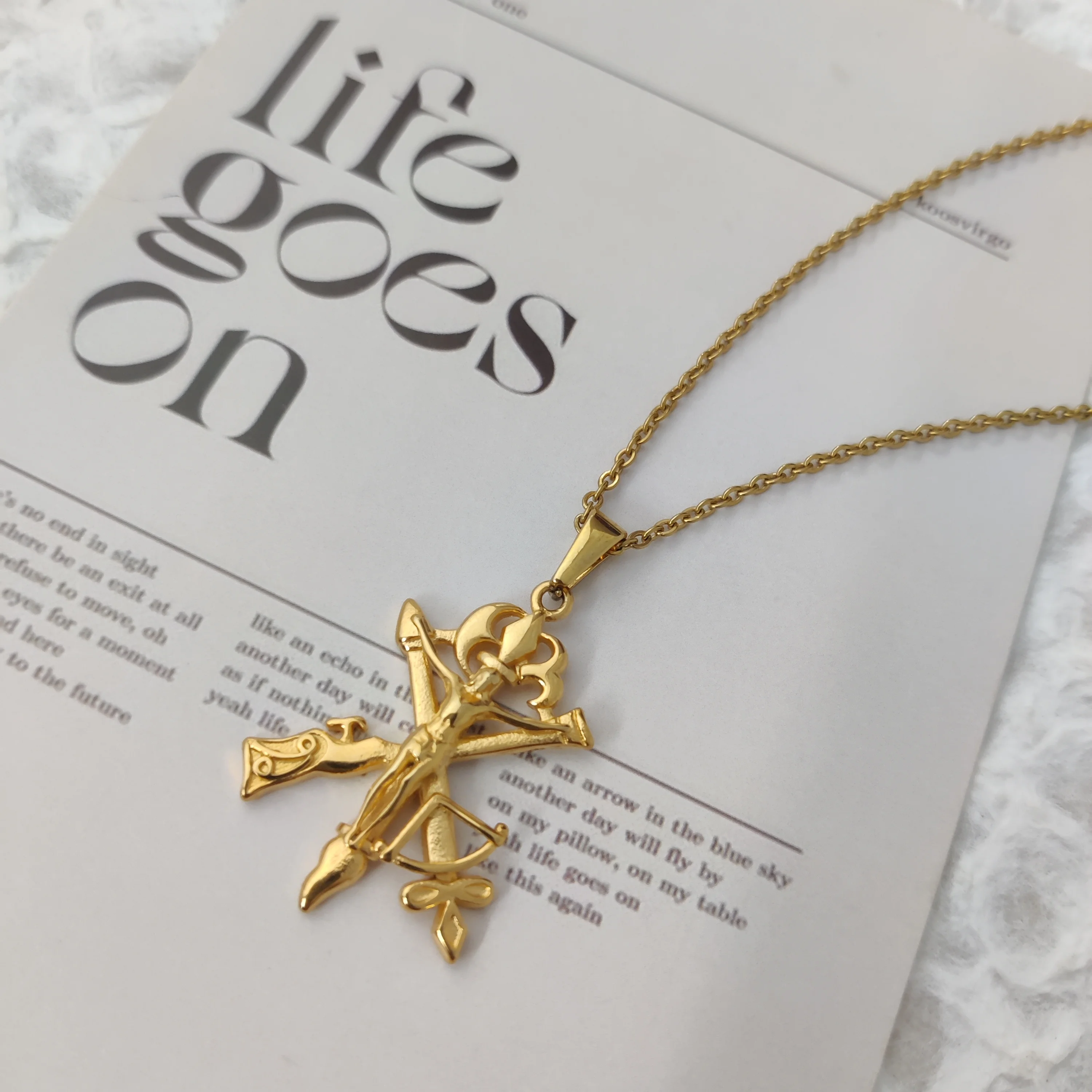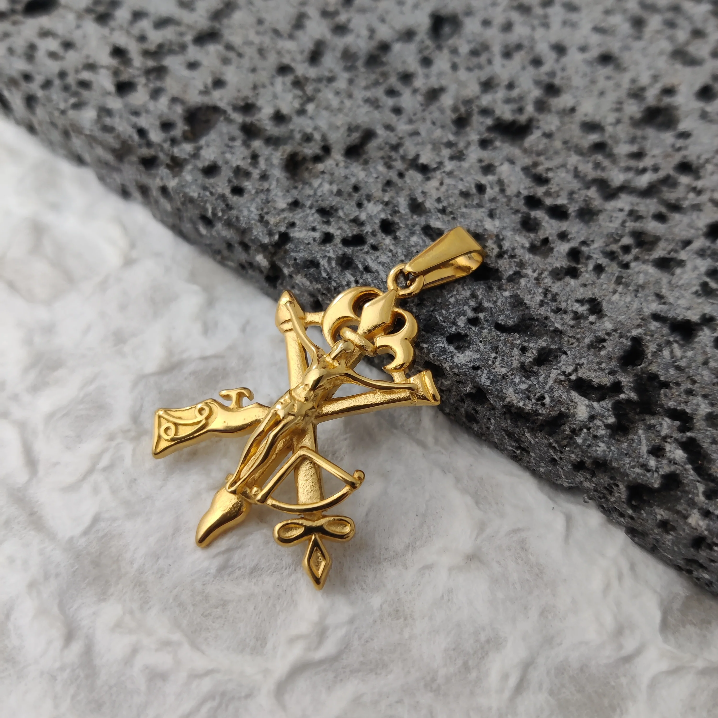 Trendy Jesus Cross Necklace - 18K Gold Plated Stainless Steel, Gun & Arrow Design for Men, Waterproof Religious Jewelry Gift