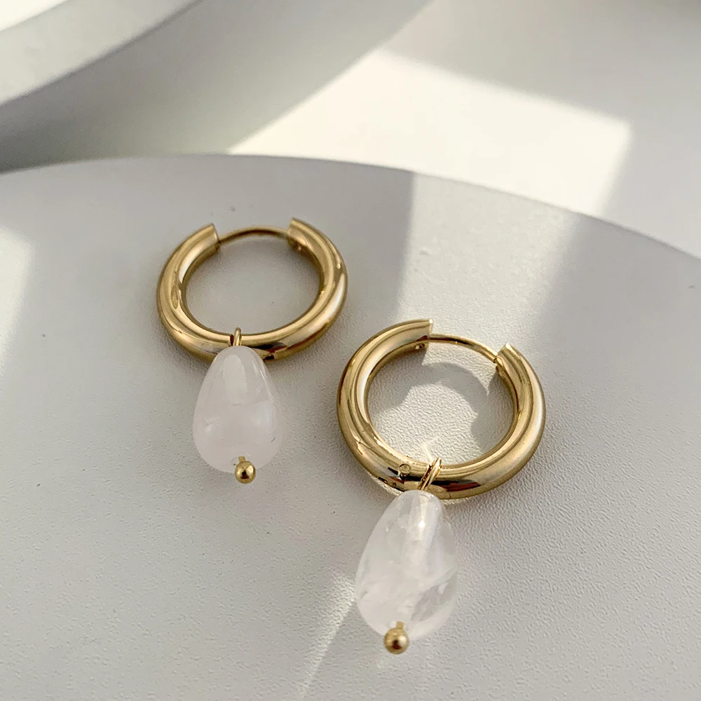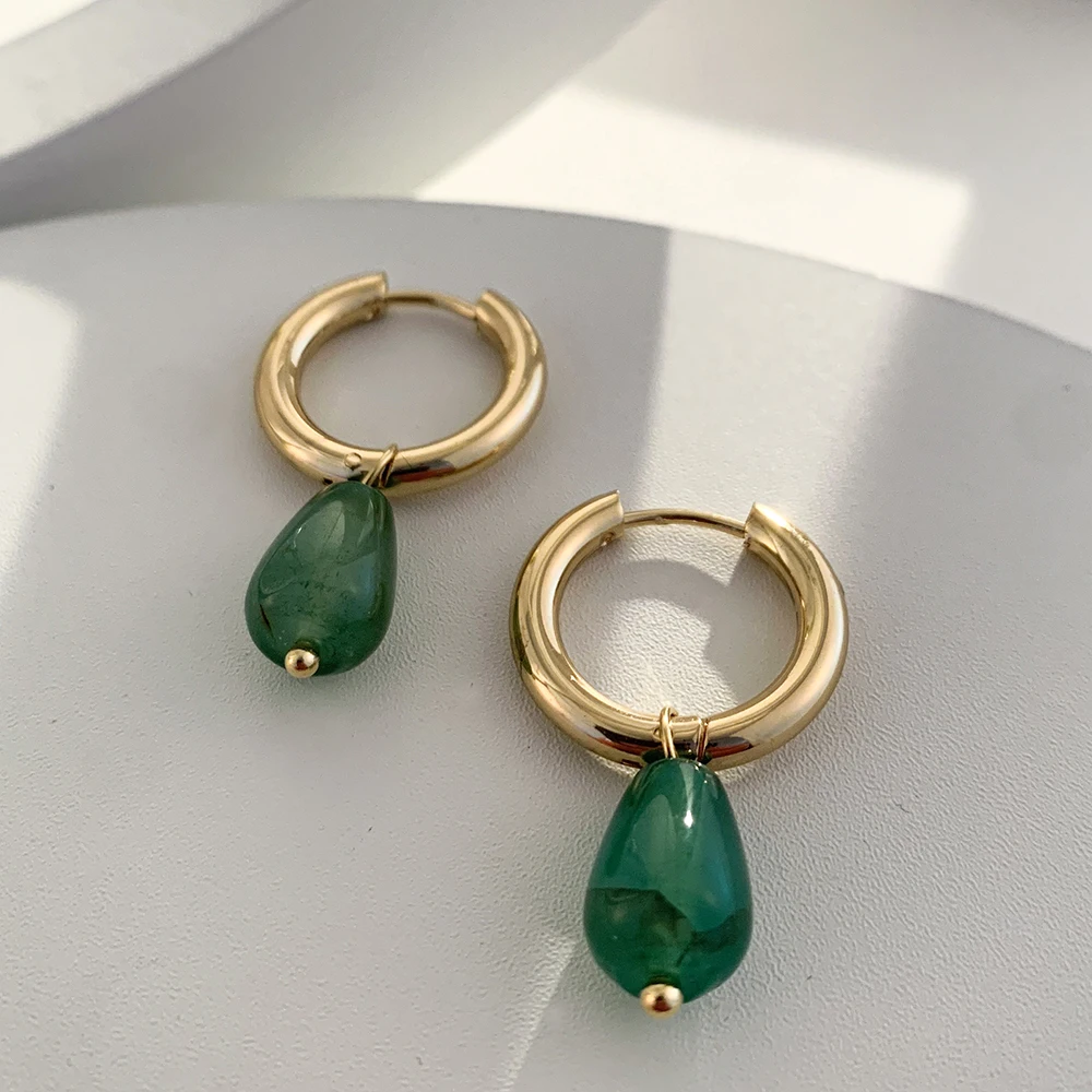 Vintage Transparent Green Natural Stones Teardrop Dangle Earrings for Women Simple Stainless Steel 18K Gold Plated Hoops Huggies