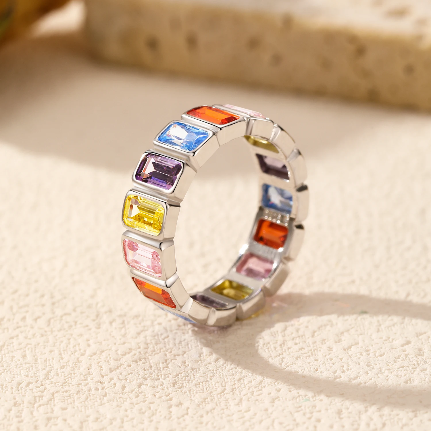 MODIAN 925 Sterling Silver Luxury Sweet Rectangle Colorful CZ Eternity Band Ring For Women Party Stackable Fine Jewelry