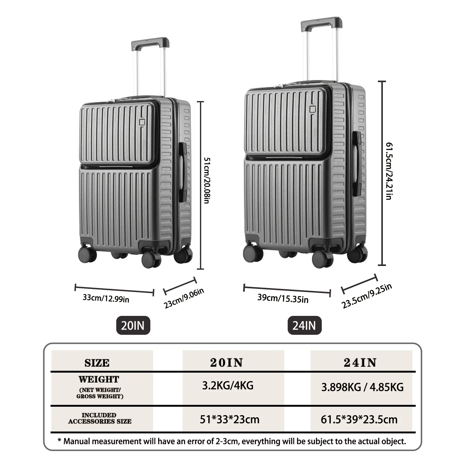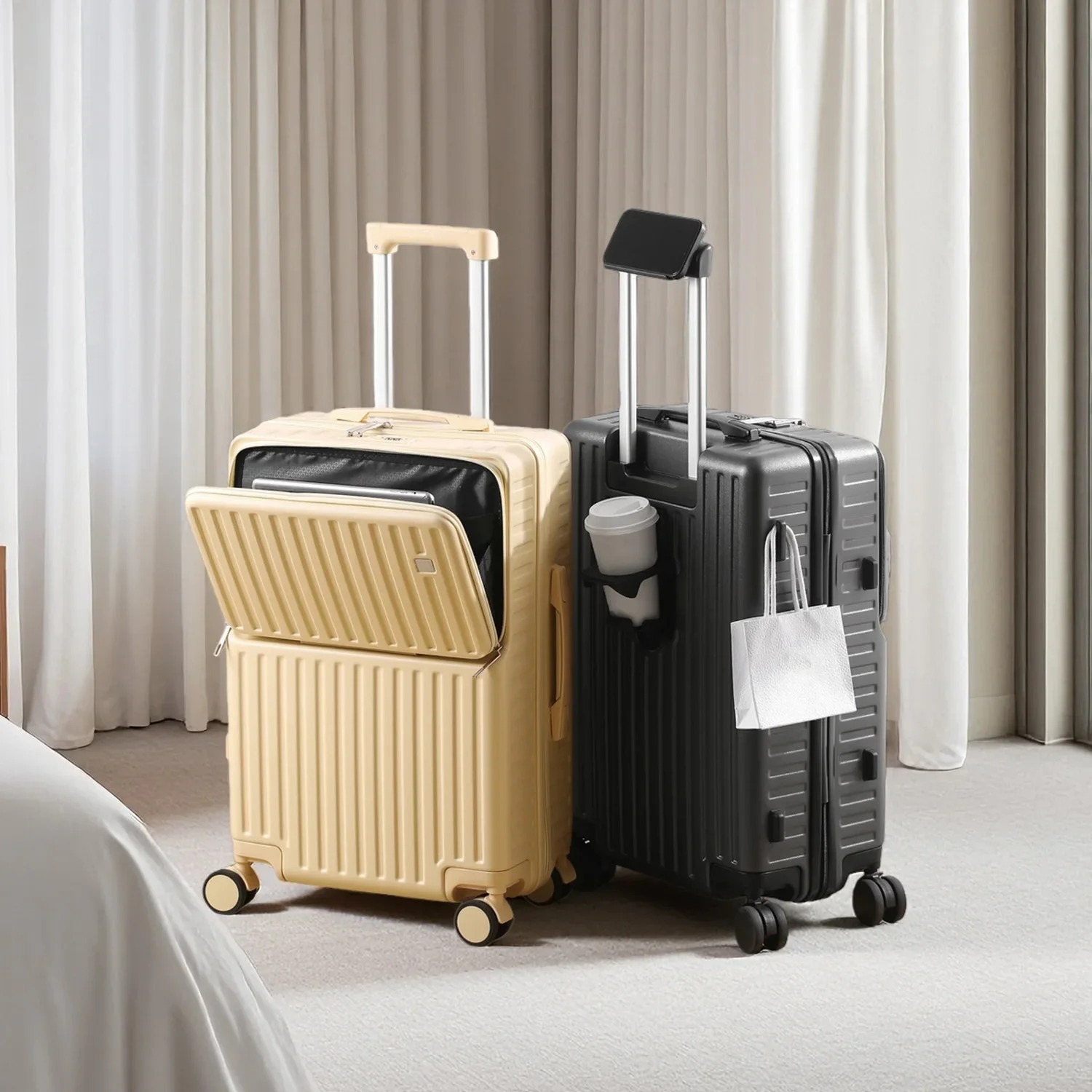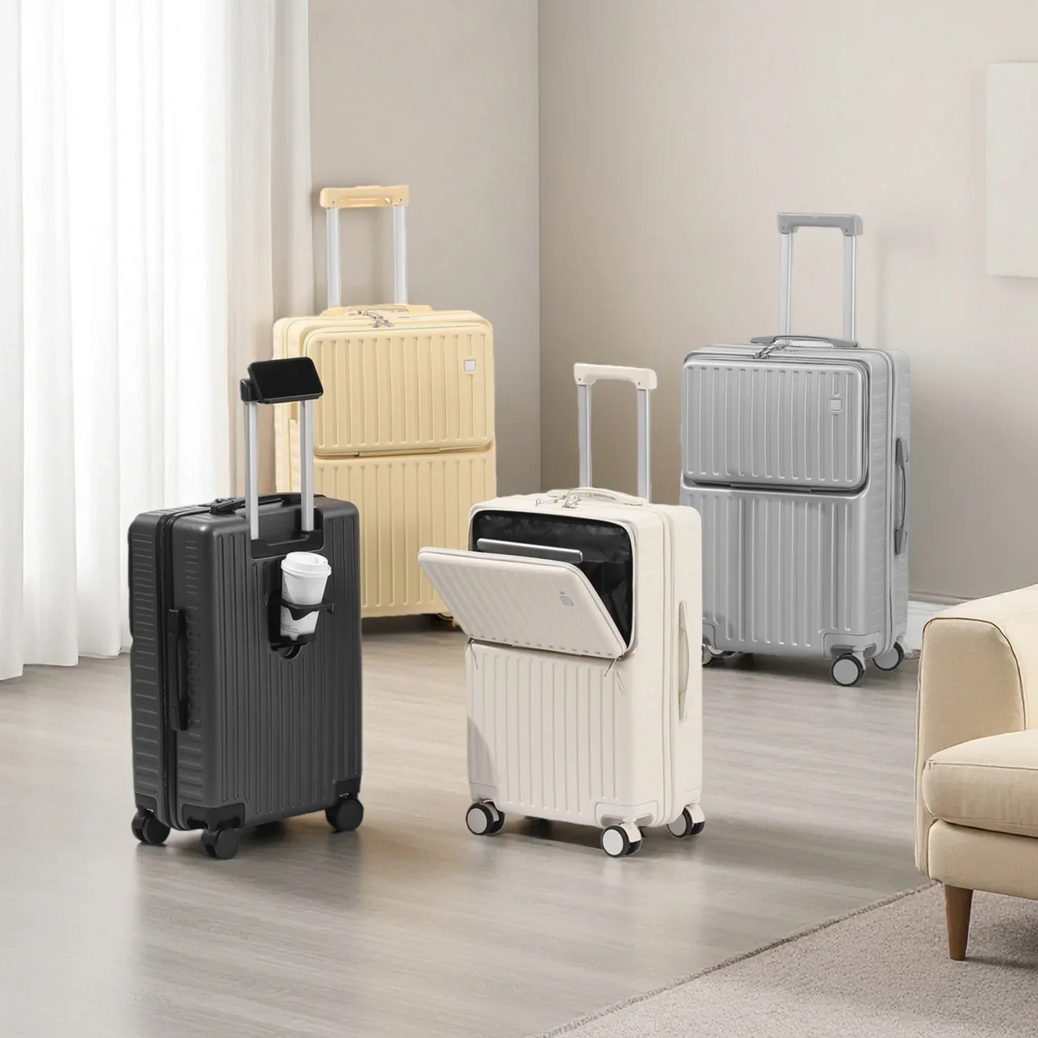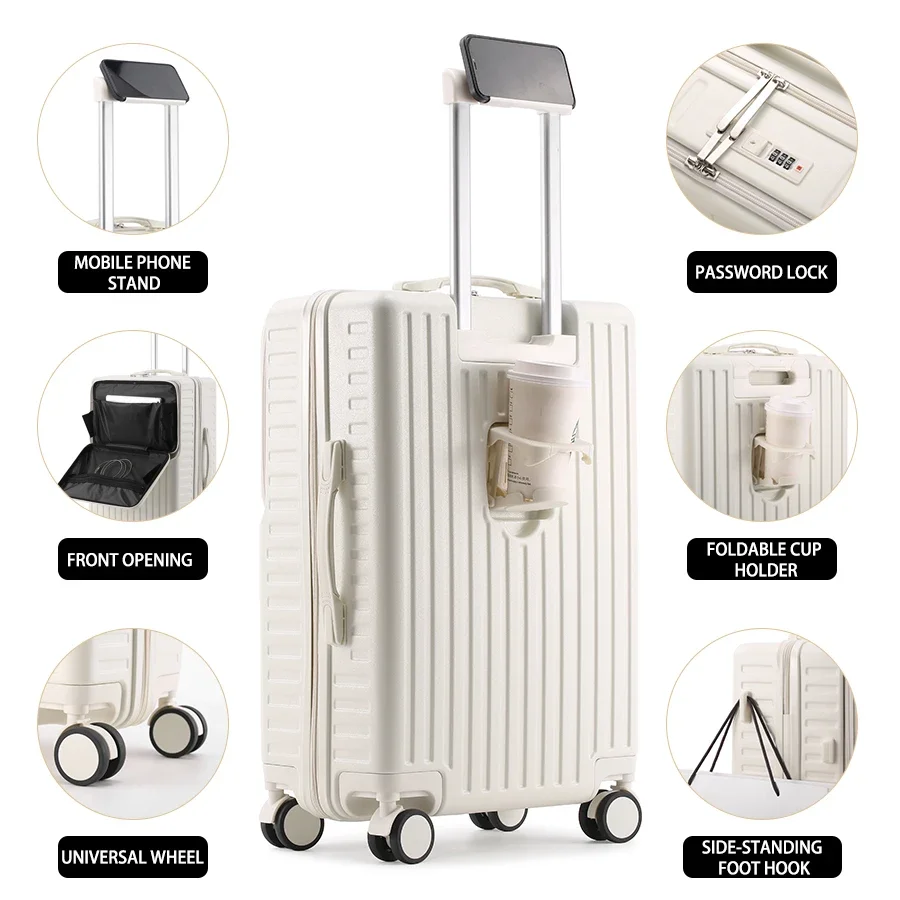 Front-Opening Carry-On Luggage Hidden Phone Holder Wet/Dry Compartment 20" ABS+PC Multi-functional Suitcase Cup Holder Side Hook