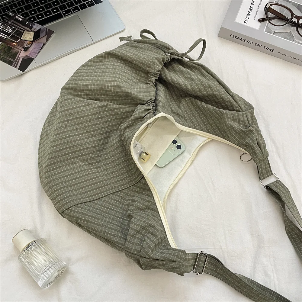 Retro Plaid Hobos Shoulder Bags for Women Drawstring Pocket Nylon Dumpling Bag Large Capacity Portable Travel Messenger Bag