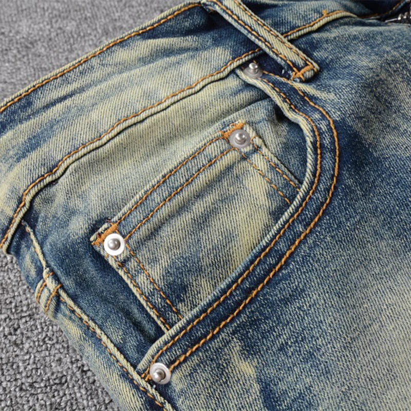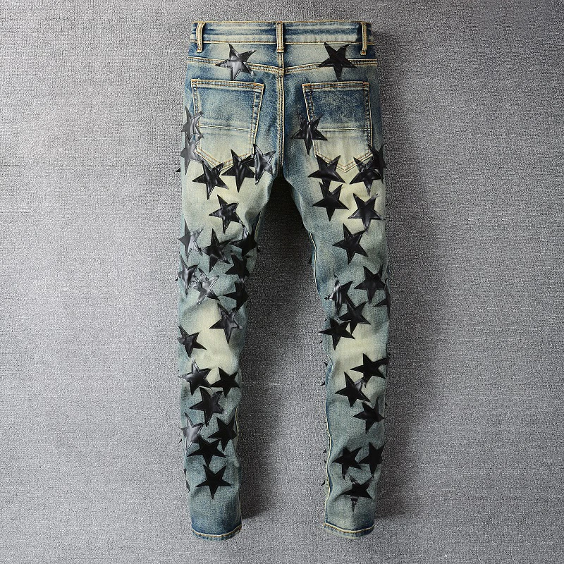 Men's Leather Stars Patch Stretch Denim Jeans Streetwear Holes Ripped Slim Skinny Pencil Pants Patchwork Trousers