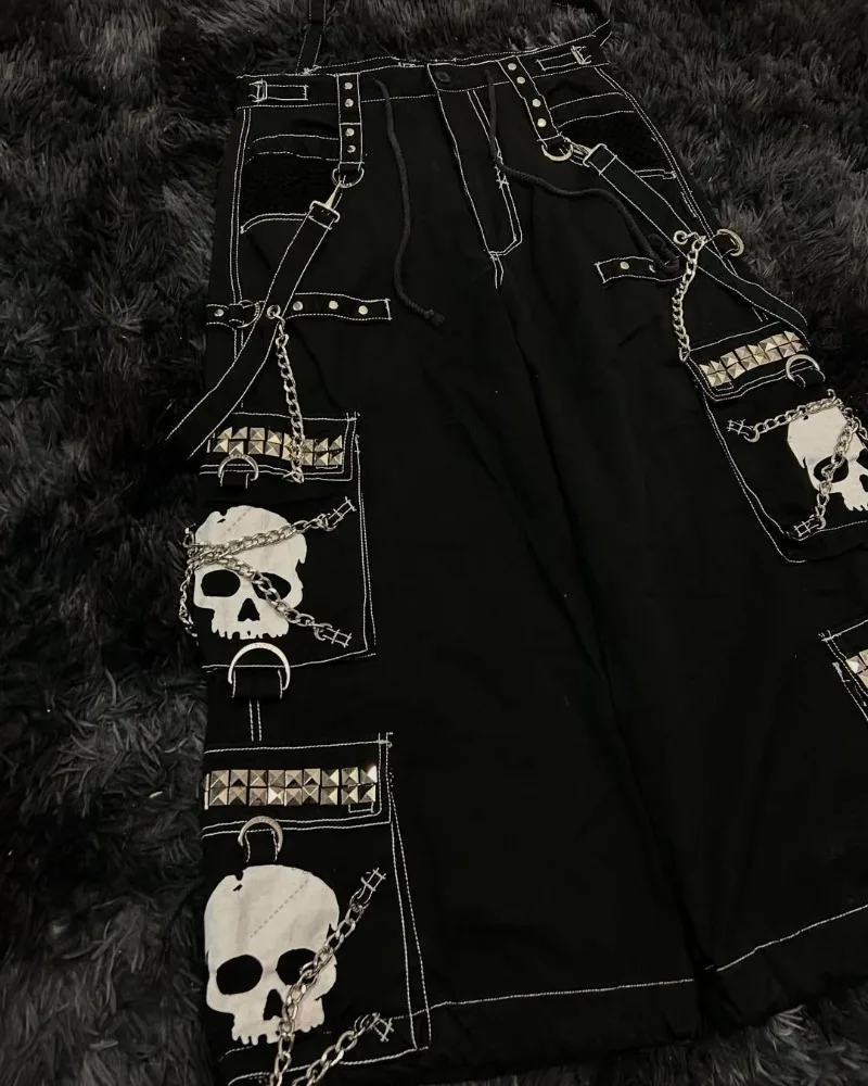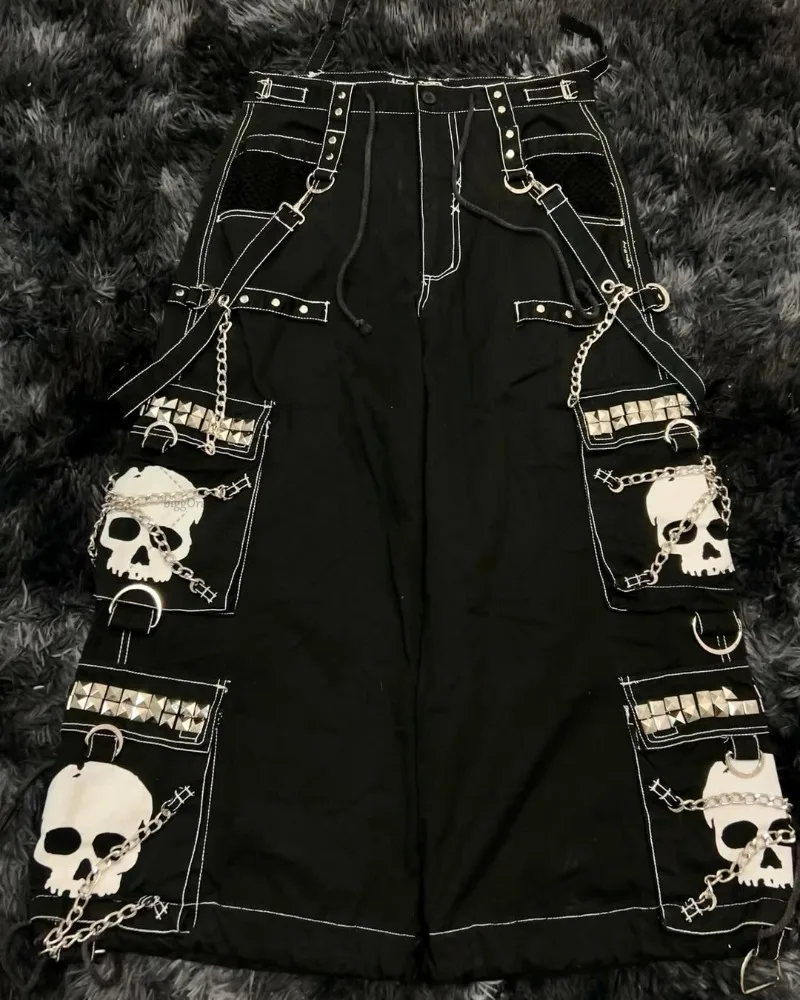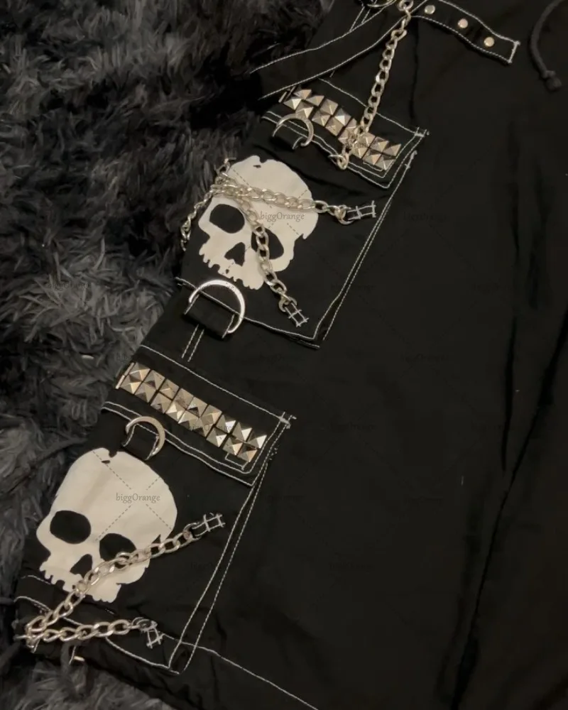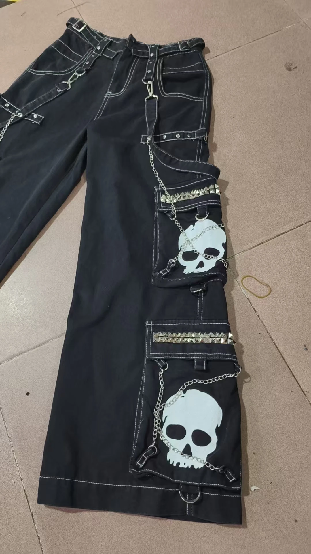 Street fashion chain brand Skull Bone Design jeans retro Harajuku style men's wide leg pants street rock multi-chain loose pants