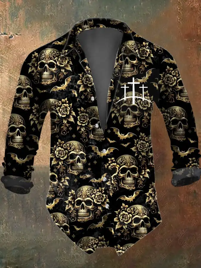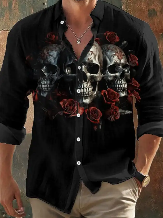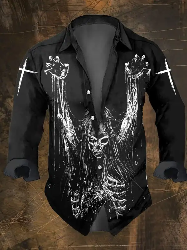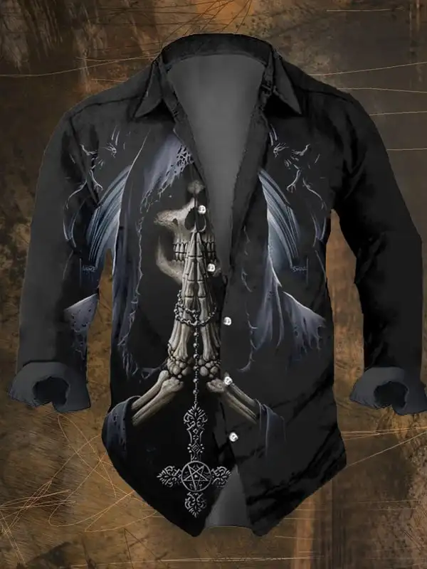 Men's Vintage Dark Skull Prints Long Sleeve Shirts-Halloween Skull Prints Black Tops Regular Fit,Lapel Collar, Polyester Blend