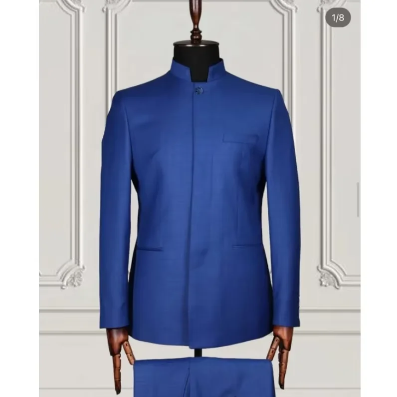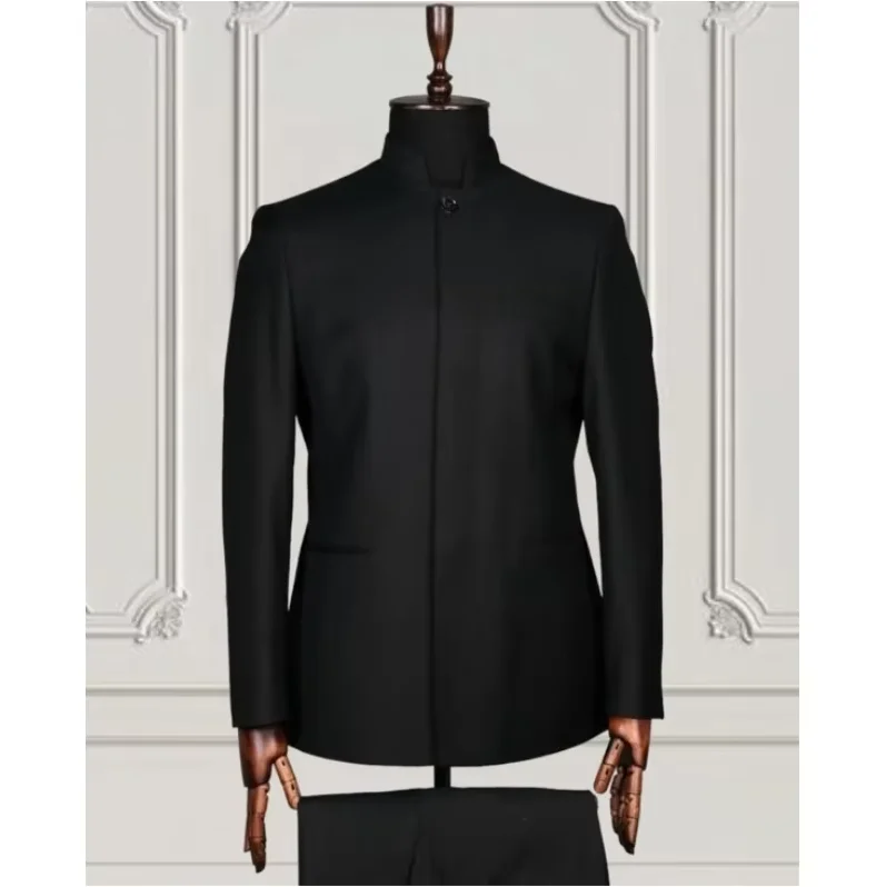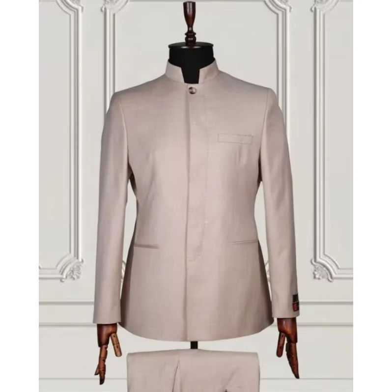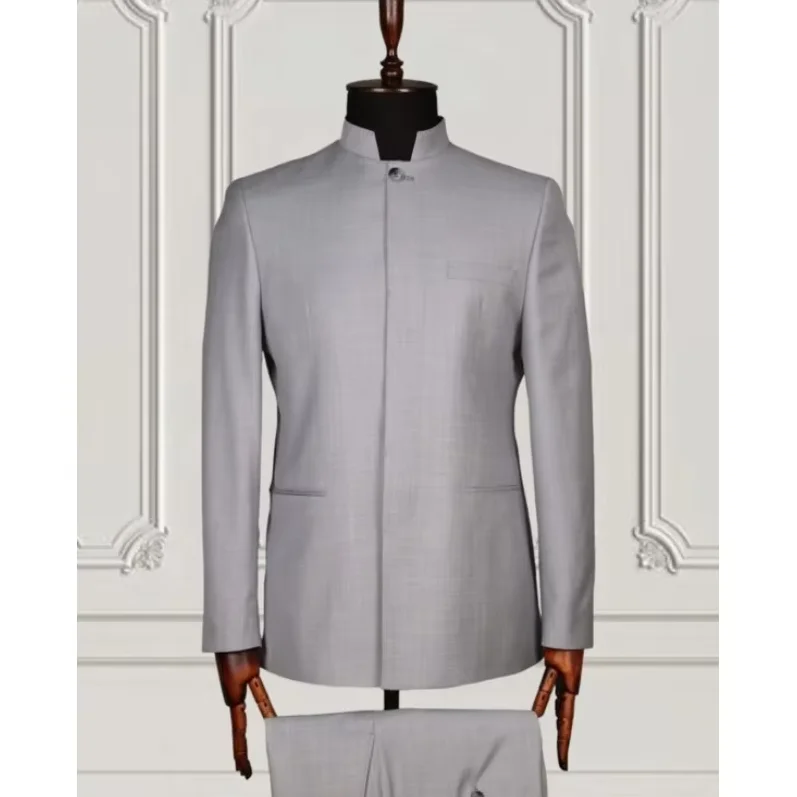 Retro Men Suits Tailored Blazer Sets 2 Pc Jacket+Pant Stand Collar Tuxedos Groom Wedding Prom Elegant Dress Costume Homme