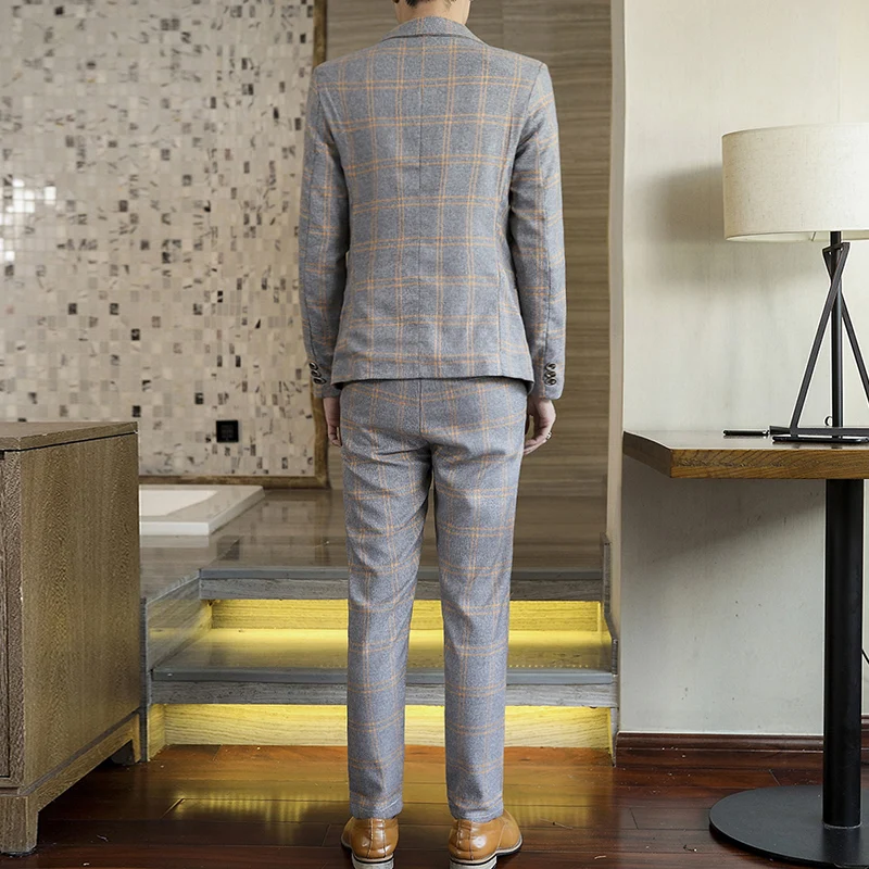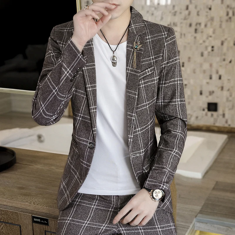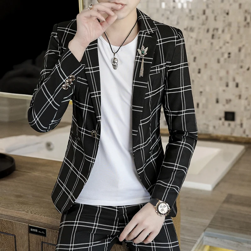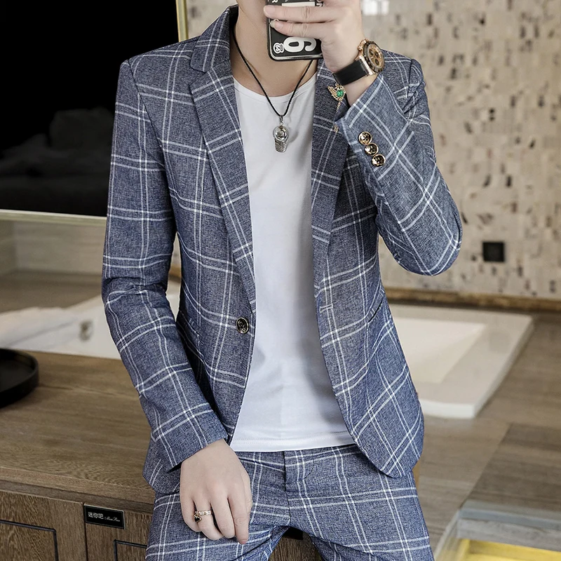 Spring 2025 Men's Stylish Slim Fit Checkered Suit Set Two-Piece Korean Trendy Casual Formal Outfit