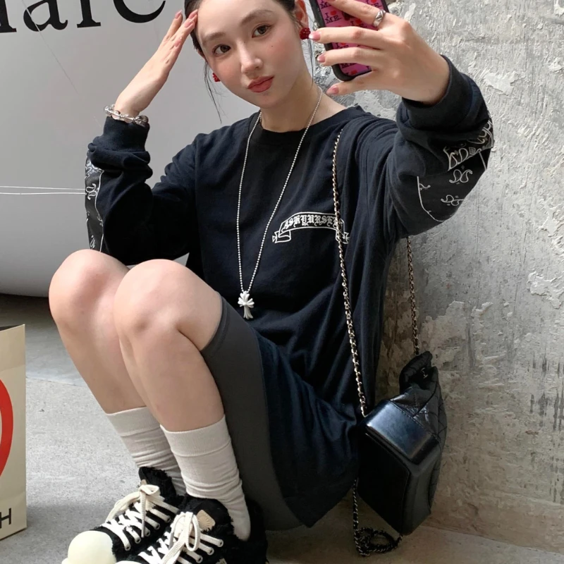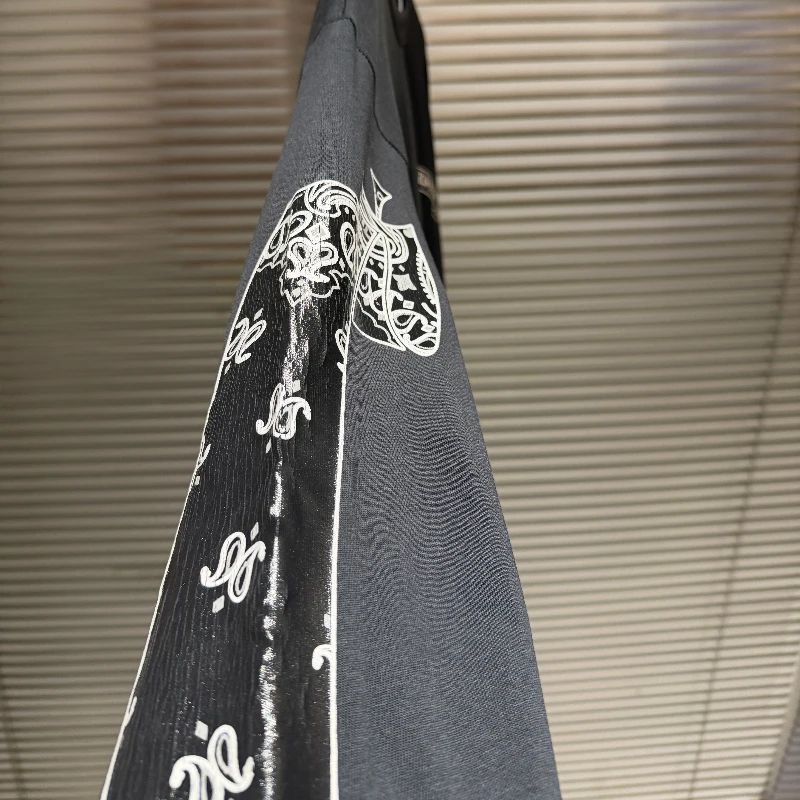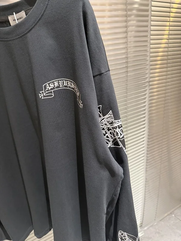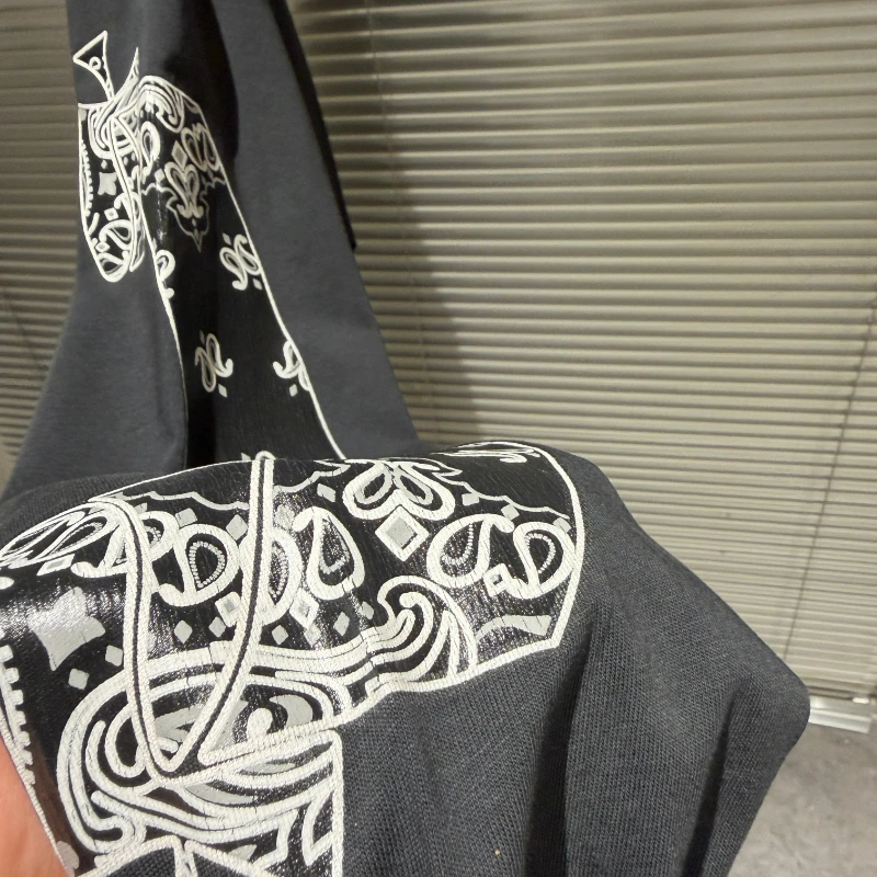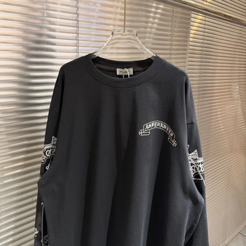 Cashew Flower Long-sleeved T-shirt High Street Crack Scroll Print Washed Distressed T-shirt for Men Women