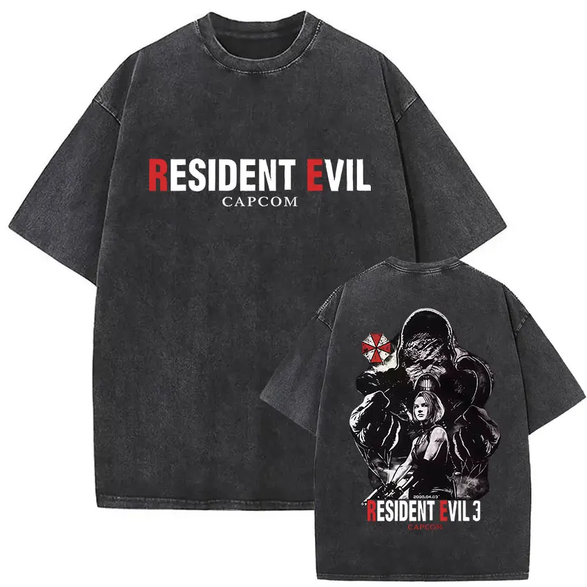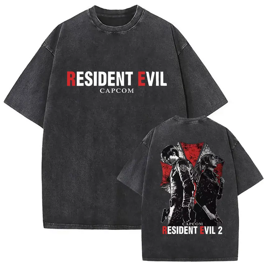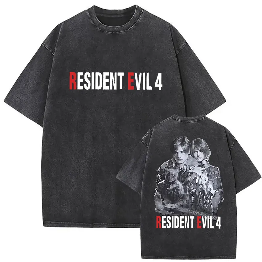 Vintage Washed Leon Kennedy Resident Evil 4 T Shirt Men's Street Cosplay Punk Short Sleeve T-shirts Man Gothic Clothing T-shirt