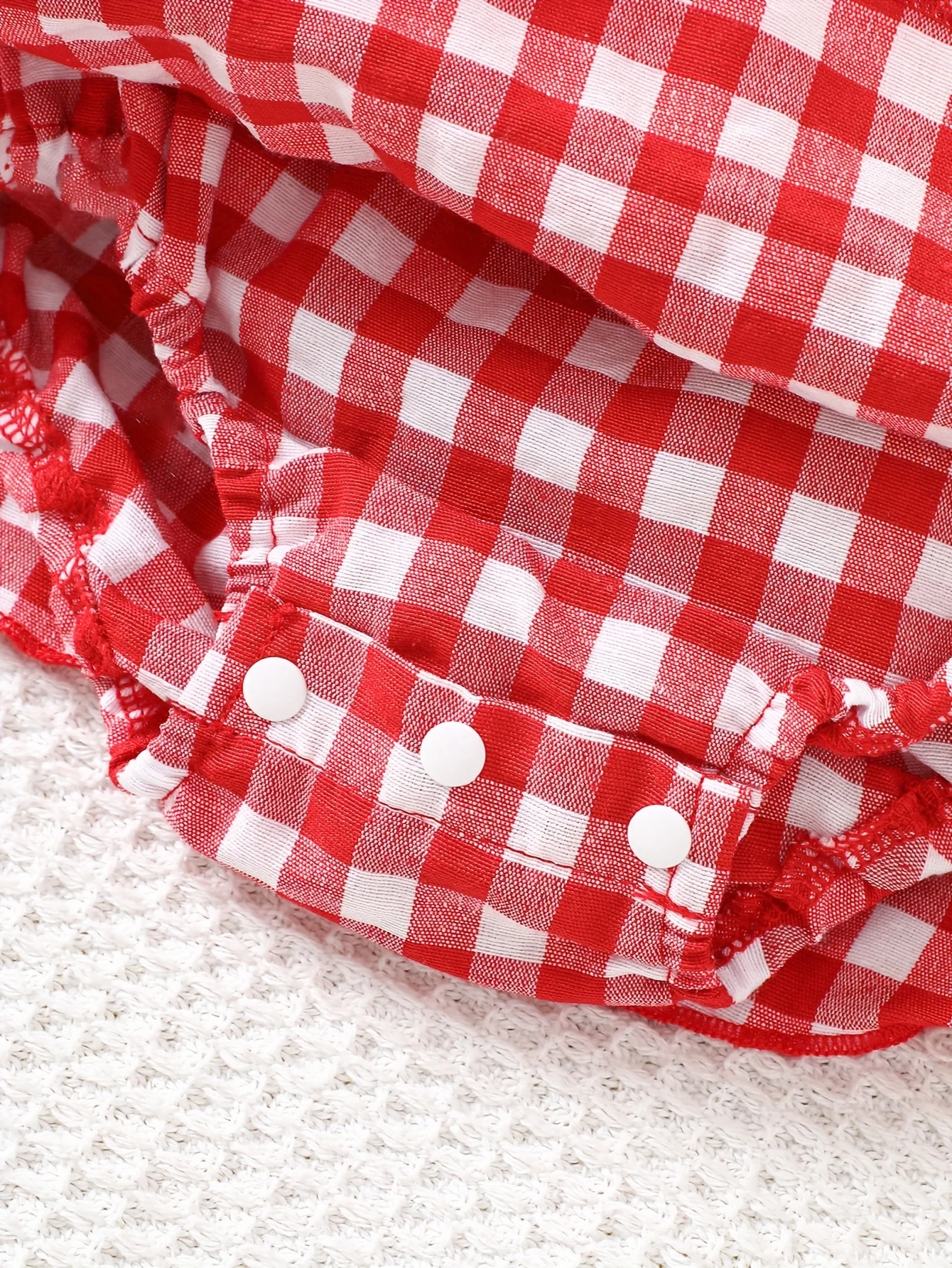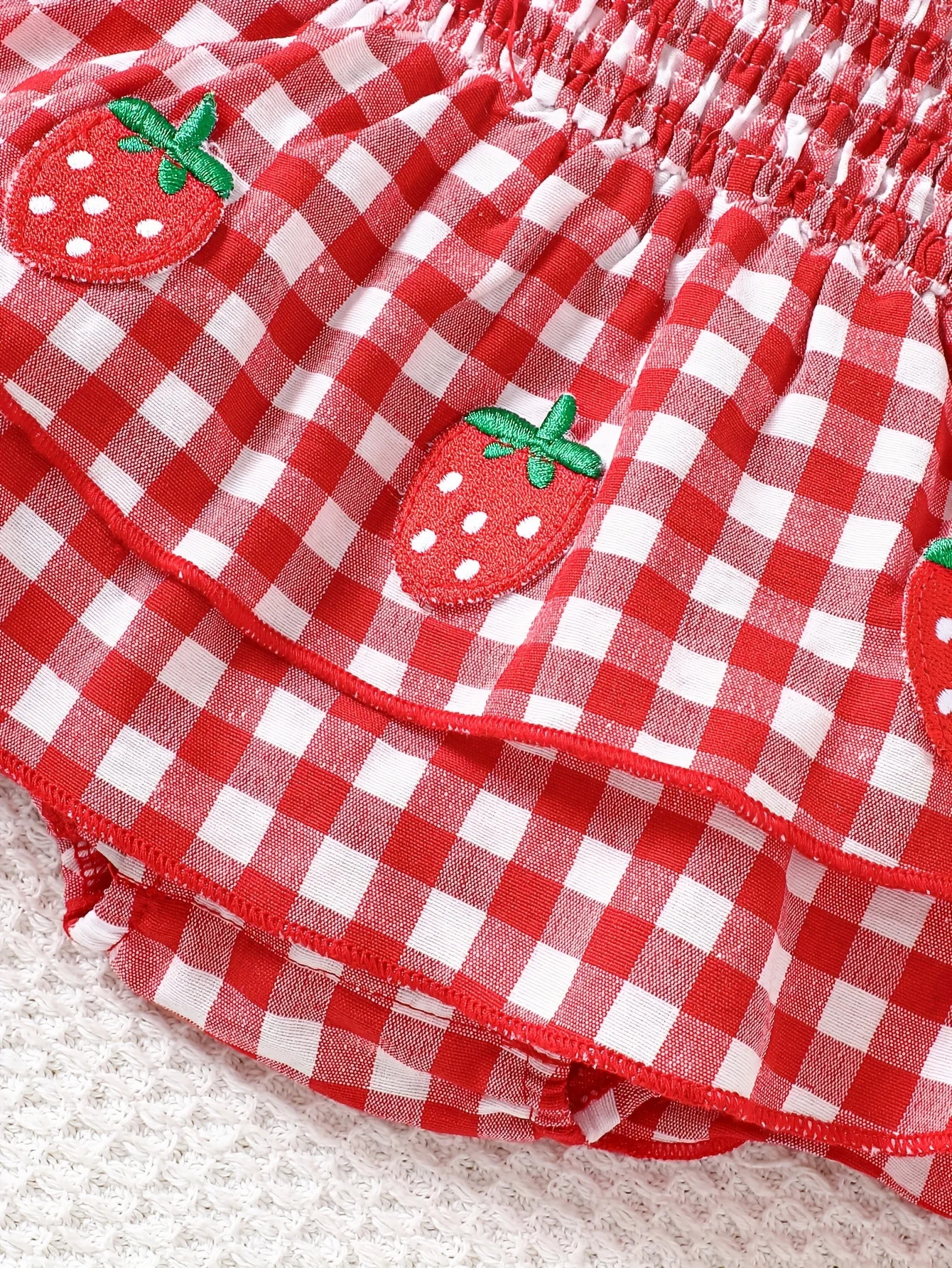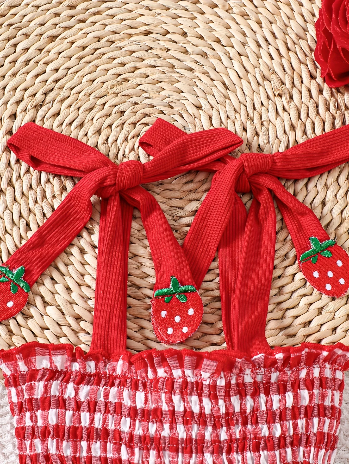 Baby Girl Strawberry Gingham Smocked Tie-Strap Romper Dress – Stretchy Shirred Bodice & Layered Skirt, Cute Summer One-Piece Out
