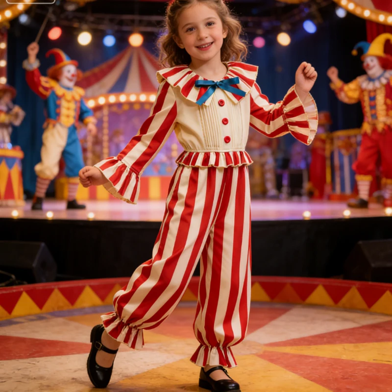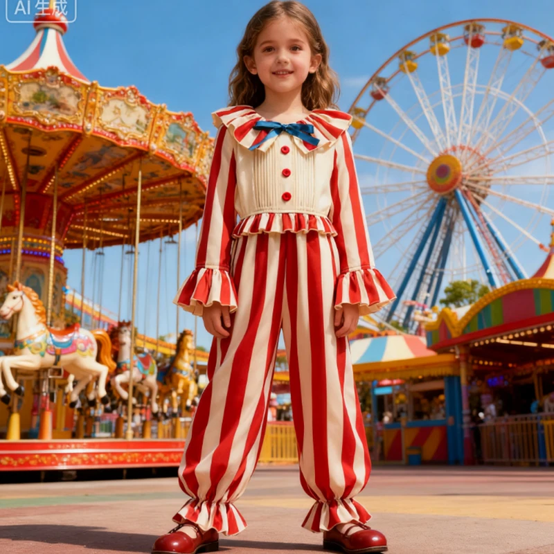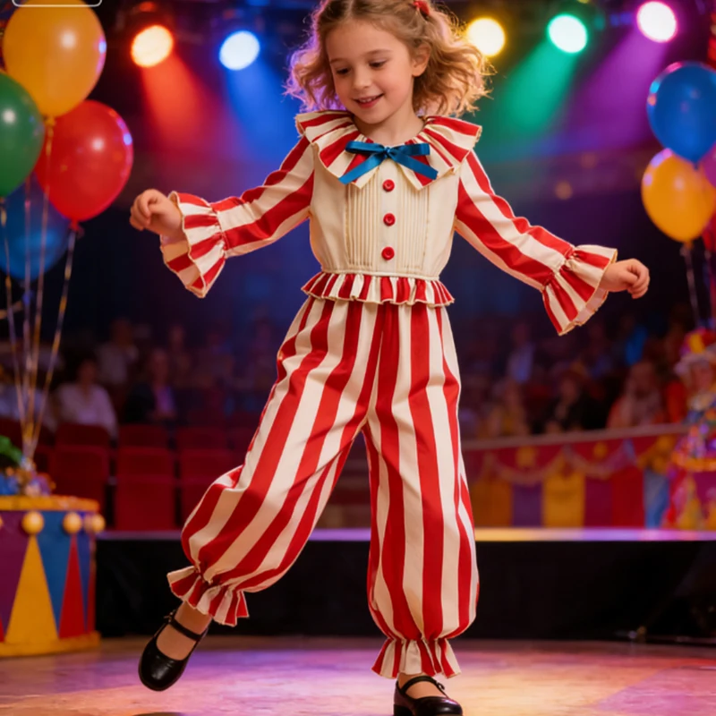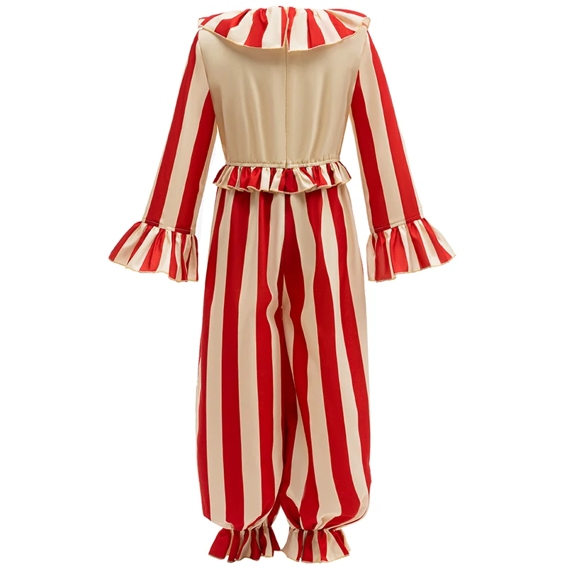 2026 Striped Clown Costume For Girls Funny Joker Girls Boys Cosplay Clown Jumpsuit Kids Birthday Carnival Party Circus Outfit