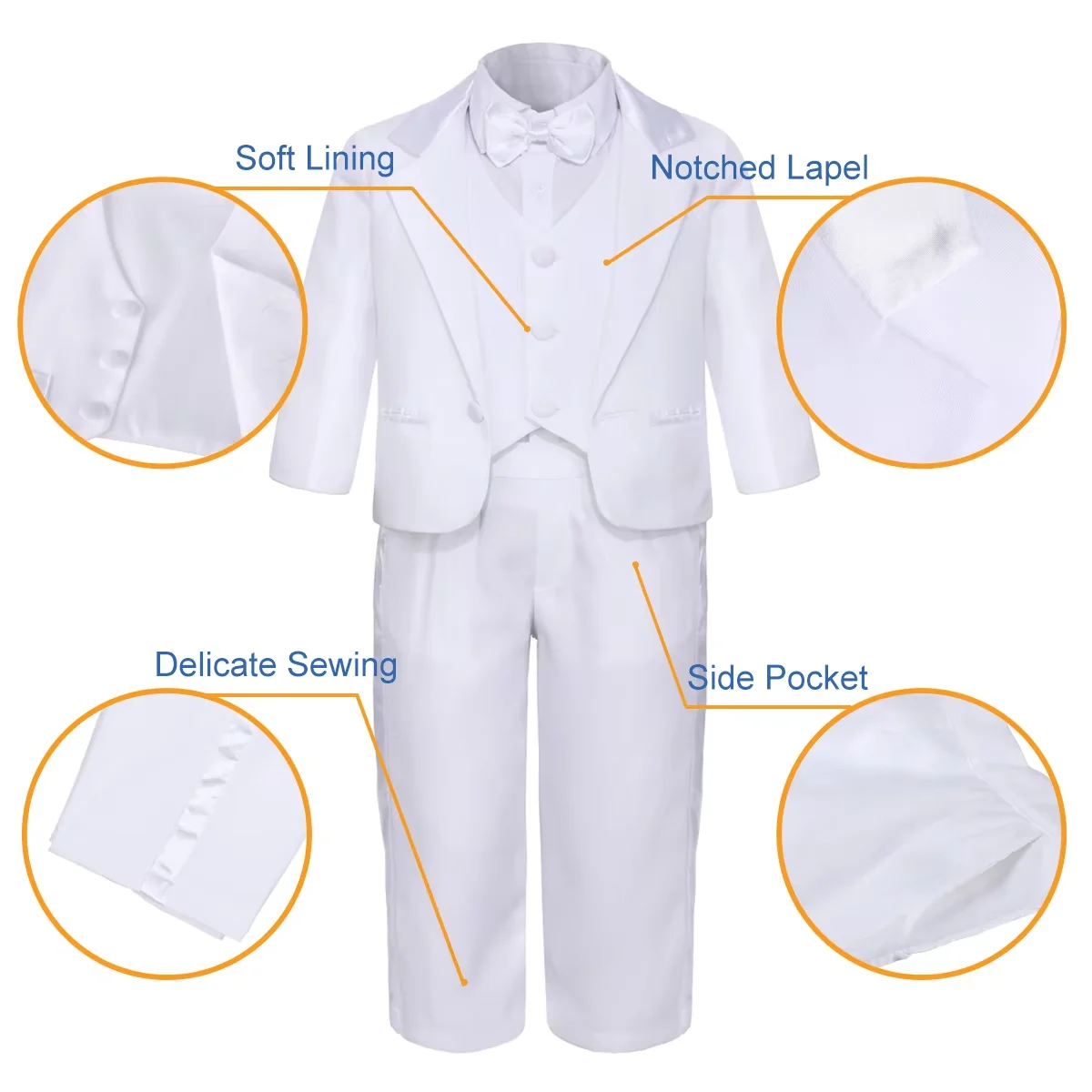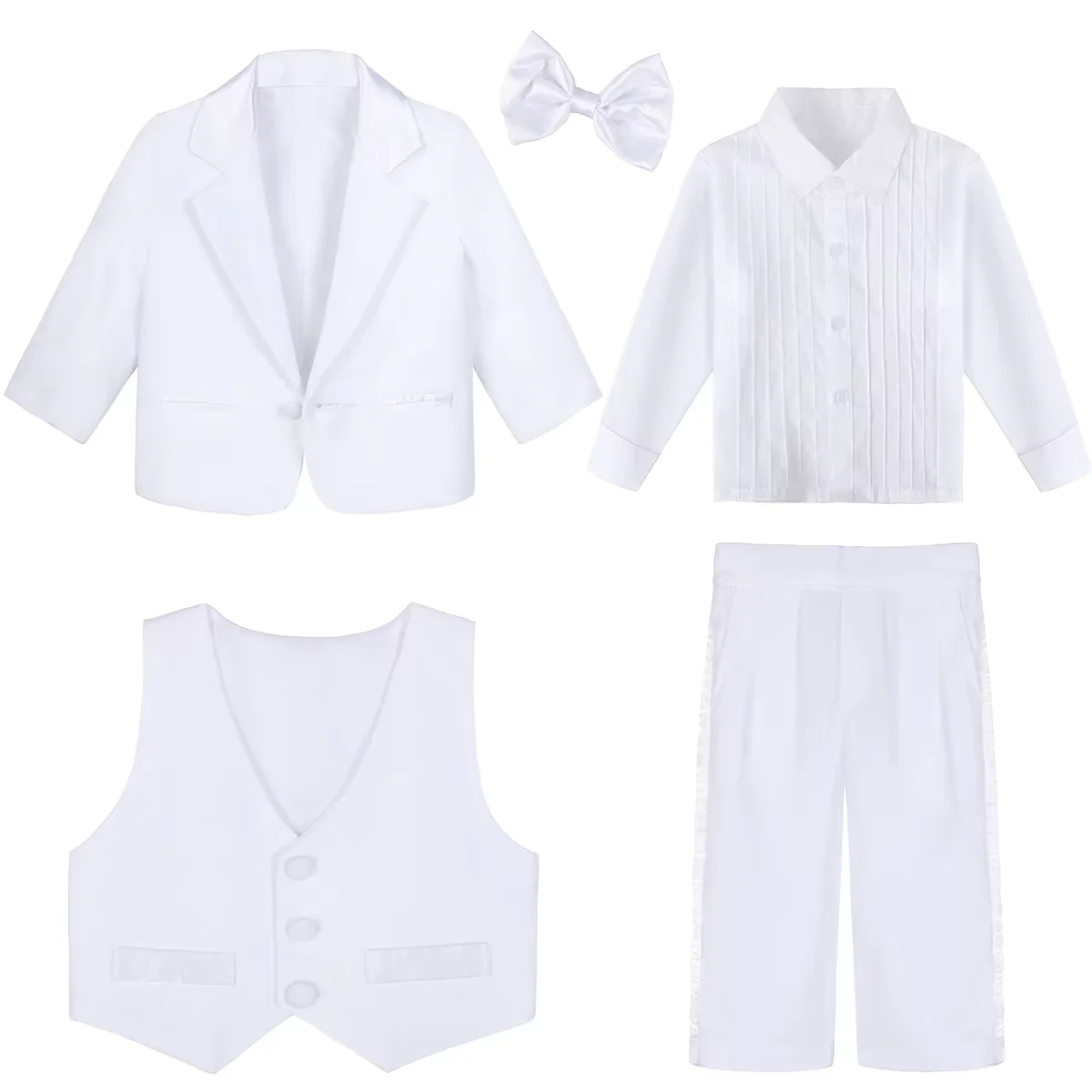 Package included: 1 x jacket + 1 x dress shirt + 1 x bow tie + 1 x vest + 1 x pants.