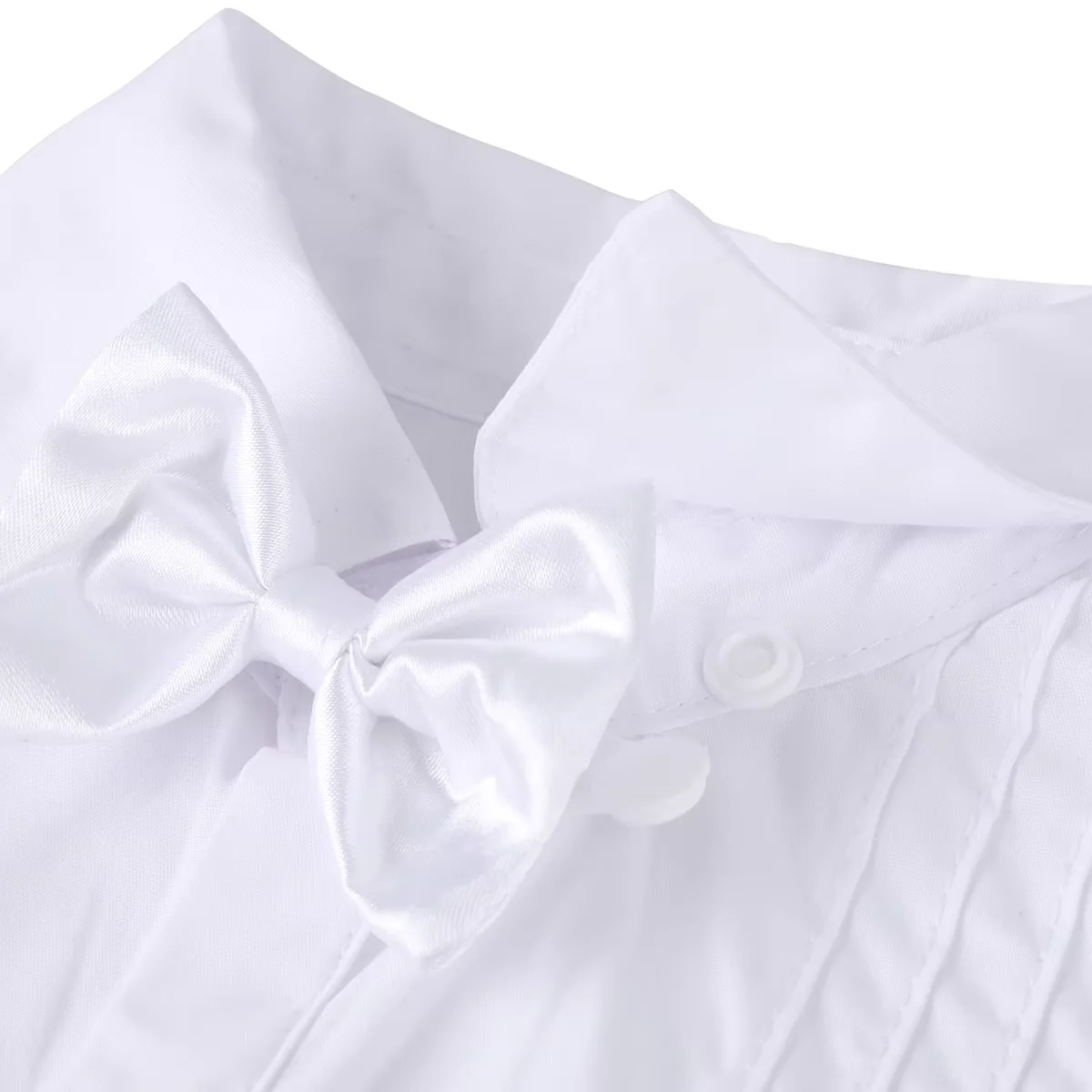 Baby tuxedo shirt have traditional white pleated front with classic collar and a detachable cute bow tie. Pants have 2 side pockets and half elastic waistband for comfort fit.